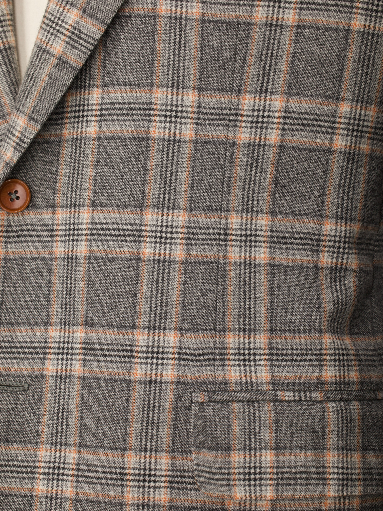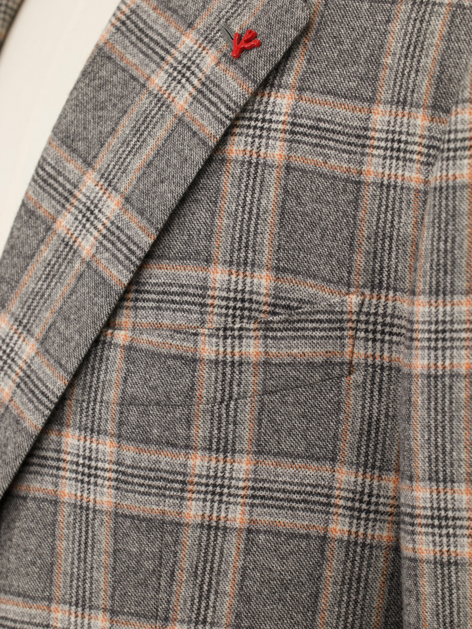 Discover the understated sophistication of this Isaia jacket, tailored from grey wool with a light brown Prince of Wales check that lends subtle depth and classic texture. The timeless palette makes it an easy match for seasonal tailoring, while the notch lapel and fully lined interior provide structure and versatility. Isaia’s signature red coral pin sits on the lapel, a discreet emblem of good luck and Neapolitan heritage.