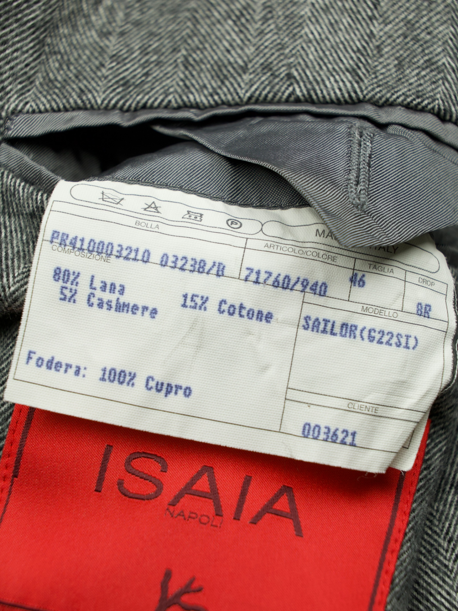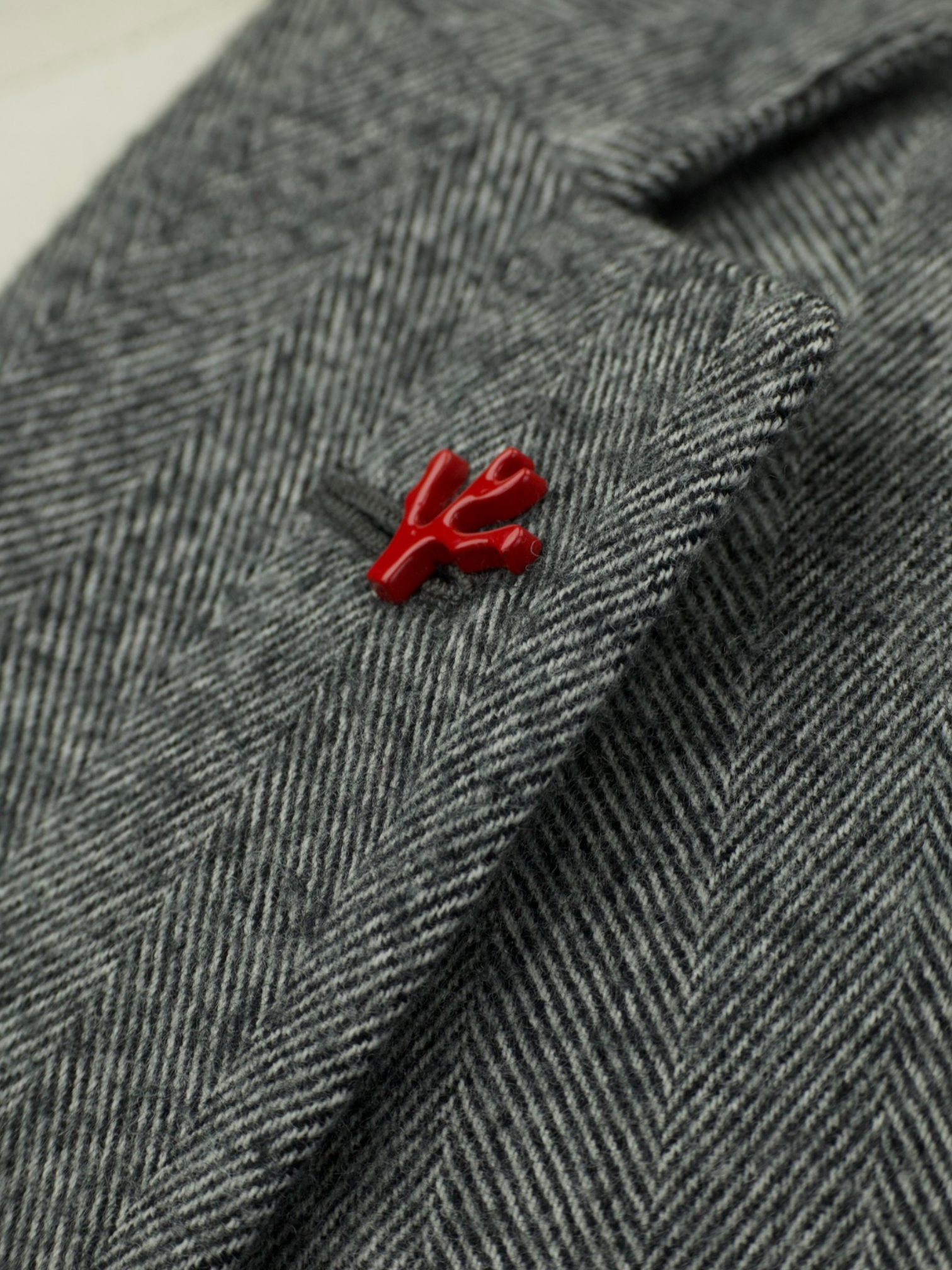 Discover the Isaia grey herringbone jacket, a quietly luxurious piece that blends classic pattern with an unexpectedly soft hand. Tailored from a rich mix of wool, cotton, and cashmere, the fabric has a plush, almost brushed feel—inviting to the touch yet structured enough to hold its form. The subtle herringbone weave adds visual texture to the soft grey hue, while notch lapels and a half-lined interior keep the silhouette easy and wearable. Isaia’s signature red coral lapel pin offers a dash of Neapolitan flair, a knowing wink to those in the know.