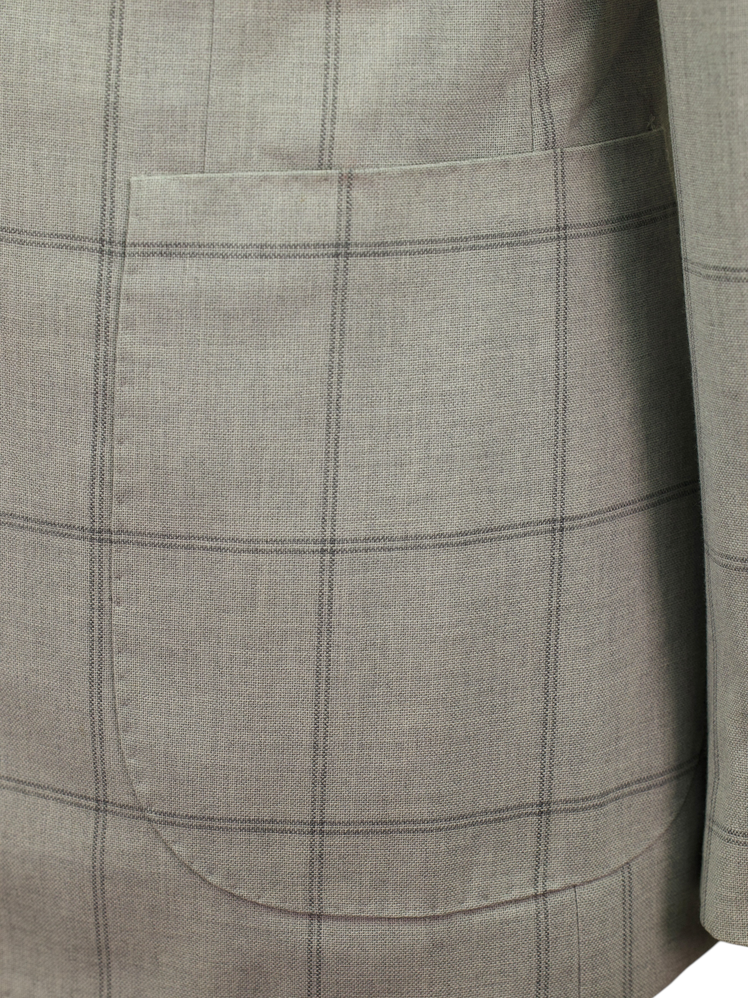 Discover the Isaia jacket in grey wool, mohair, and cashmere—woven in the brand’s distinctive “Fresco Babyhair” fabric and overlaid with a refined windowpane check. This lightweight blend combines the crispness of mohair, the softness of cashmere, and the breathability of wool to create a fabric that feels fresh, airy, and polished. The pale grey tone is elevated by a subtle windowpane grid, offering depth and understated pattern—perfect for elegant warm-weather layering.