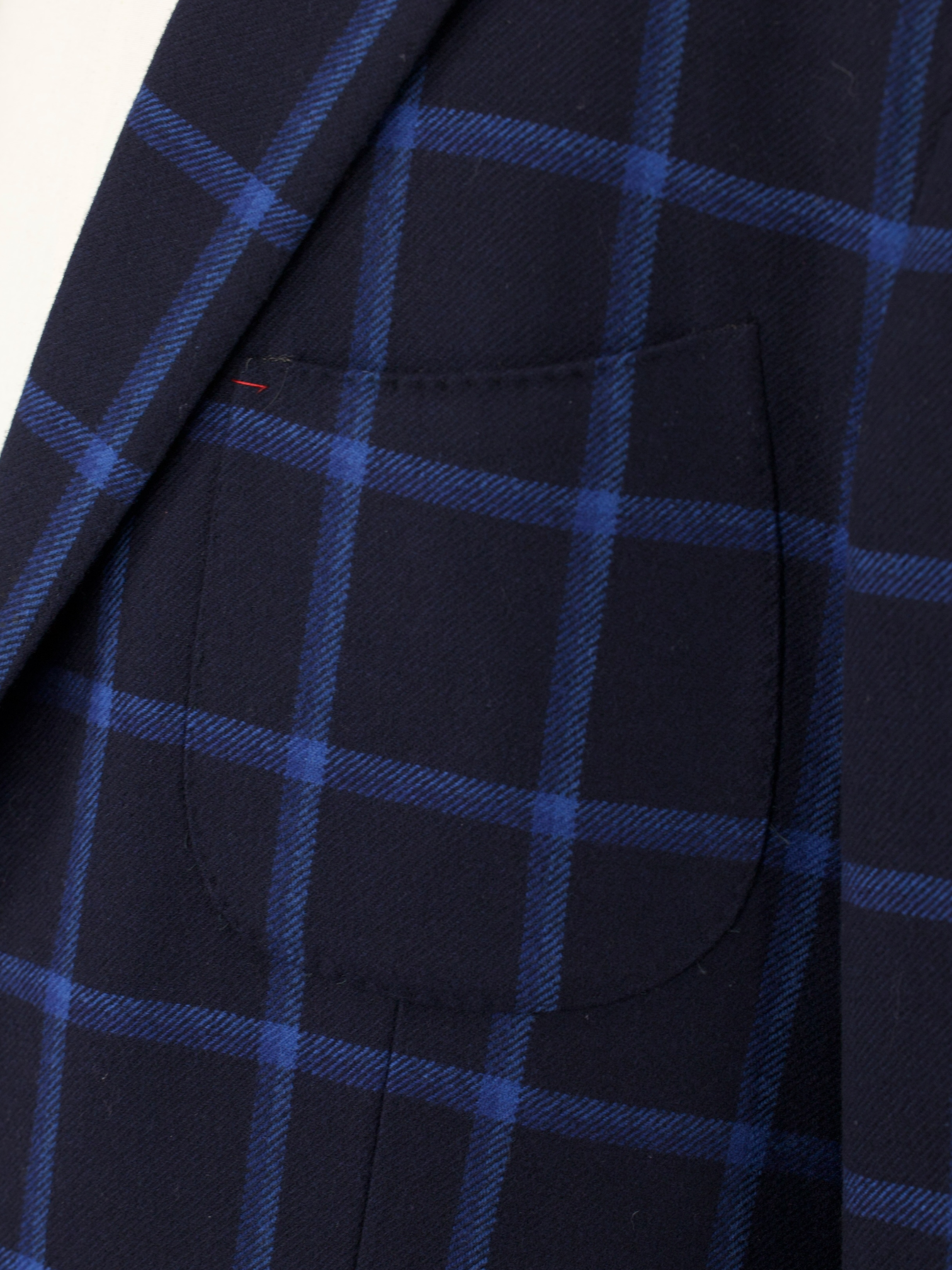 Also known as ‘barchetta’ Italian for ‘little boat’, it is so named because this pocket floats on the chest gently angled upward, just like the bow of a sailboat. These pockets echo the lively roll of a lapel that carries the spring of canvas and natural wool, unlike machine-made chest pockets that have a more stamped-out, rectangular shape and less life.