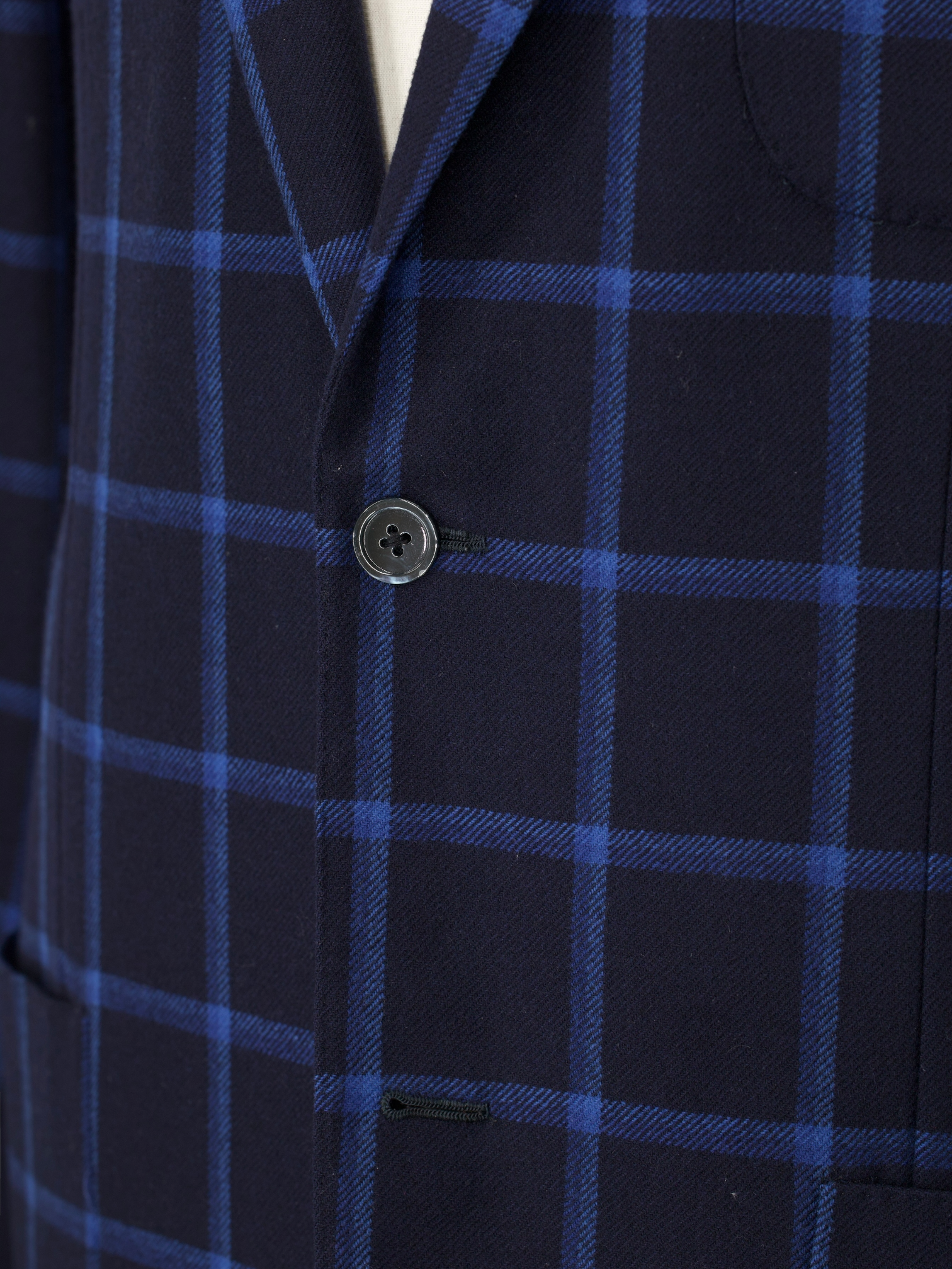 Discover the expressive elegance of this Isaia jacket, tailored from richly textured navy wool with a striking azure blue windowpane. The fabric has a soft brushed finish and a substantial weight, making it an ideal choice for cooler seasons. Designed with classic notch lapels, a 2.5 button front, and a fully lined interior, the jacket is completed with Isaia’s signature red coral lapel pin, a Neapolitan symbol of protection and vitality that reflects the brand’s deep-rooted heritage.