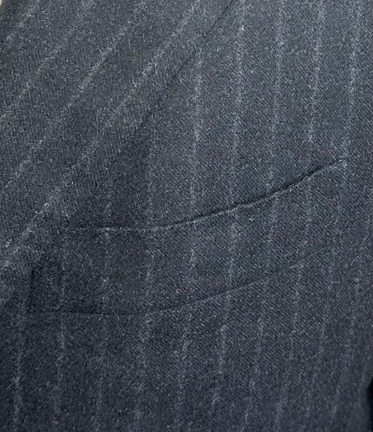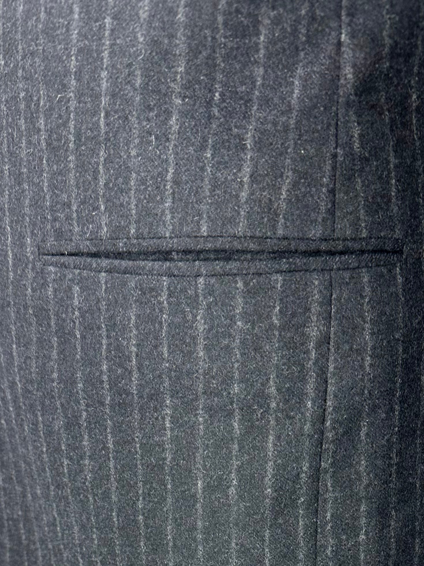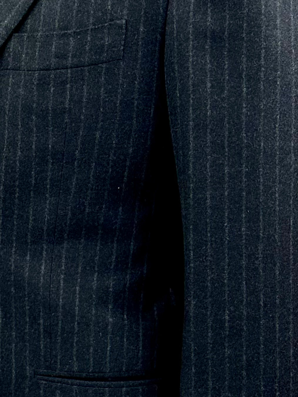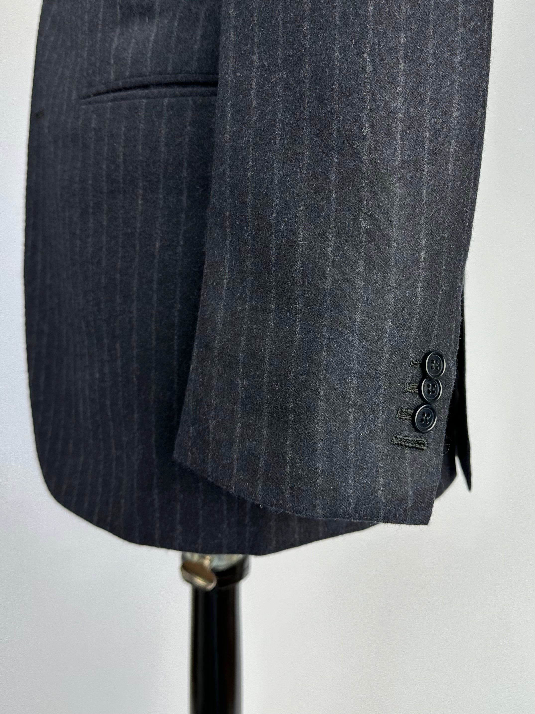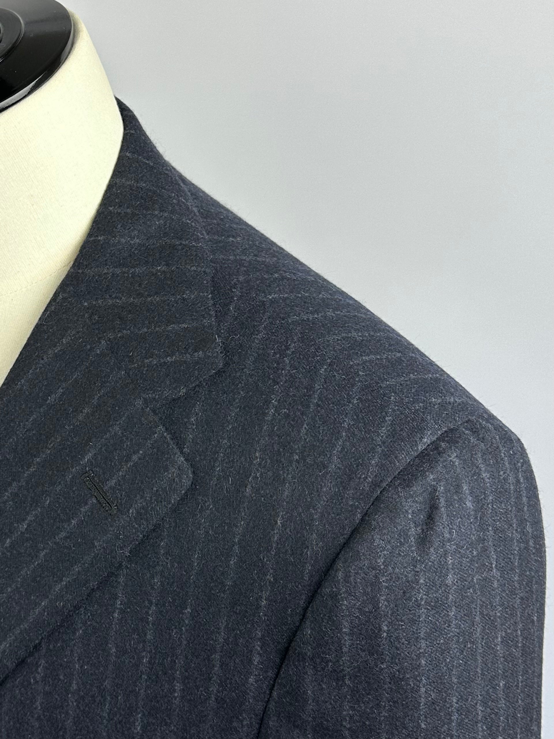 A sartorial treasure - 3 Piece handmade suit in a pinstripe pattern. Notch lapels, fully lined, expertly constructed from a luxury cashmere and silk blend with double side vents at the back and two-button closure to keep the profile neat. The vest has a double breasted closure, which is closed around the belly to give your tie maximum exposure whilst still maintaining the 3 piece look. The notch lapels and welted chest pocket are undeniably classic. Discover the elaborated sartorial details below.