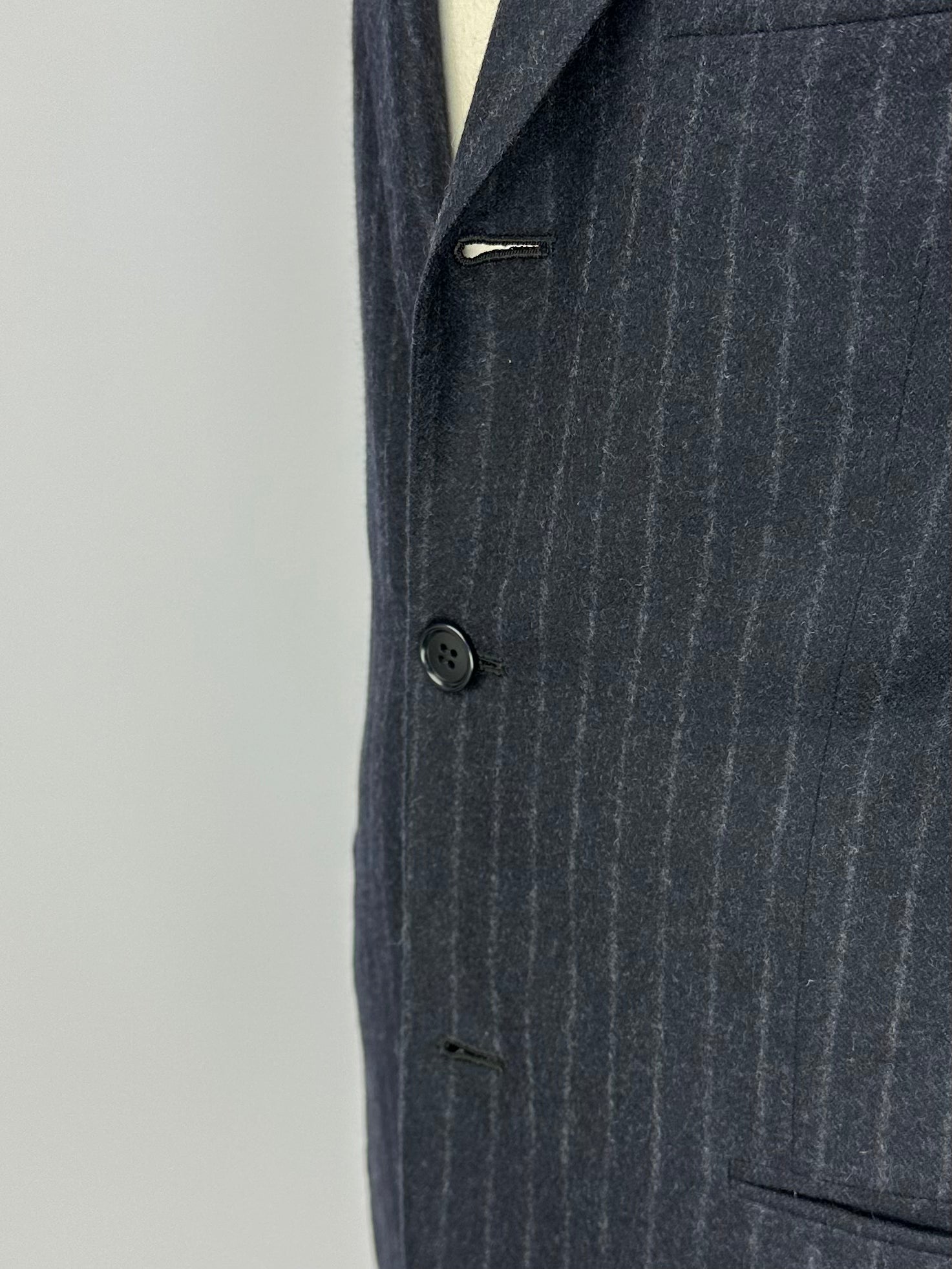 Also known as stacked buttons or waterfall buttons, kissing buttons are associated with Italian tailoring as Italian tailors make their jacket sleeve buttons in the kissing style. In this style, buttons touch each other and overlap one another. Handmade buttonholes; Even this step, apparently the simplest, is treated with an abundance of detail. Attaching the buttons is a job that requires patience and must be completed to perfection.