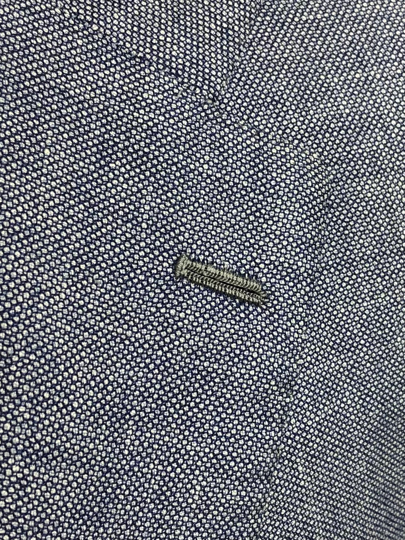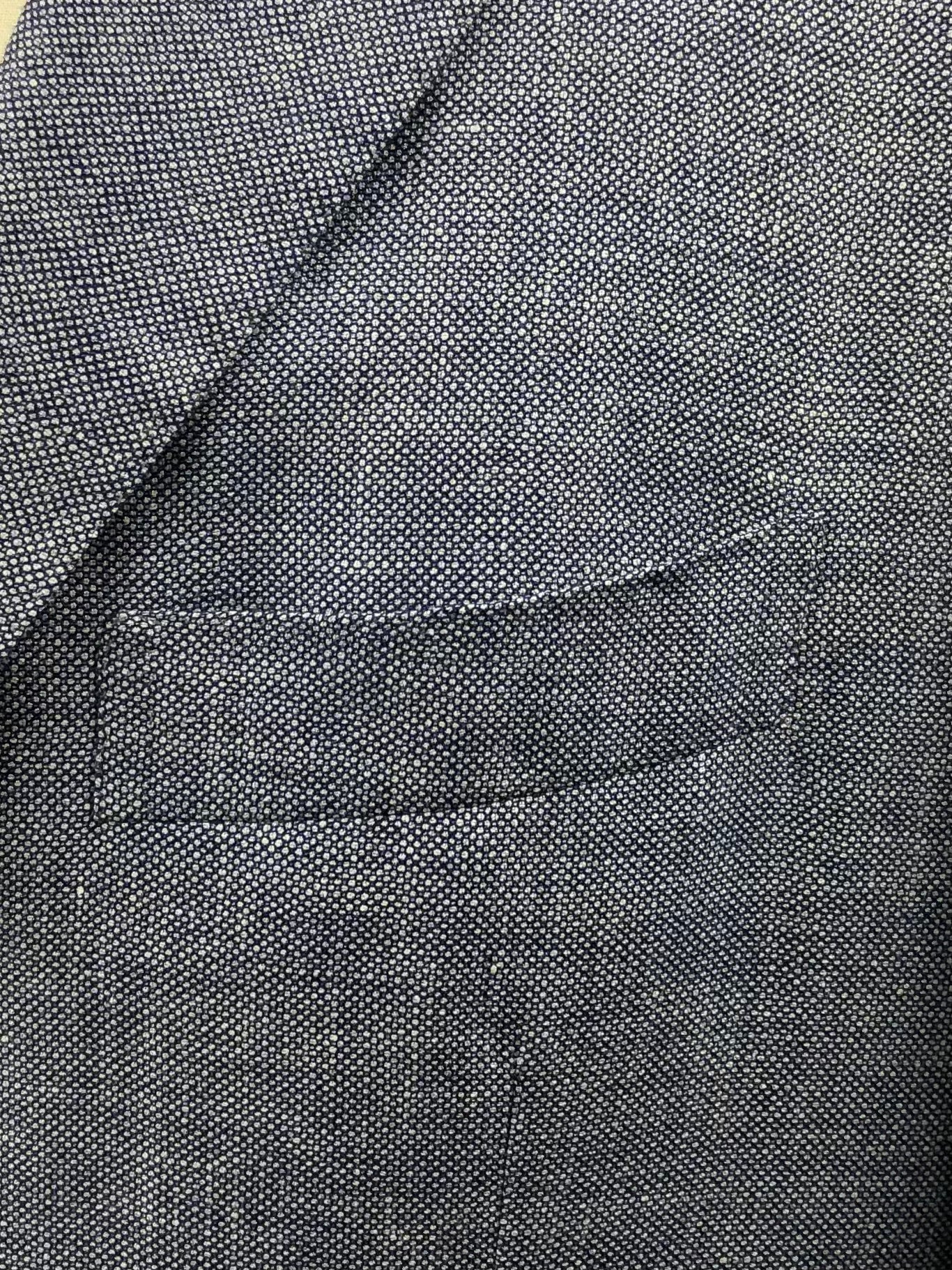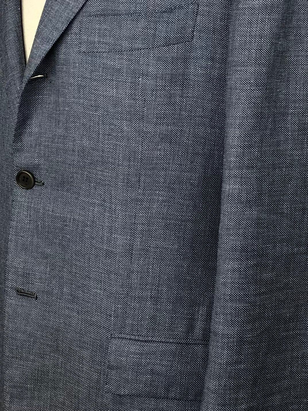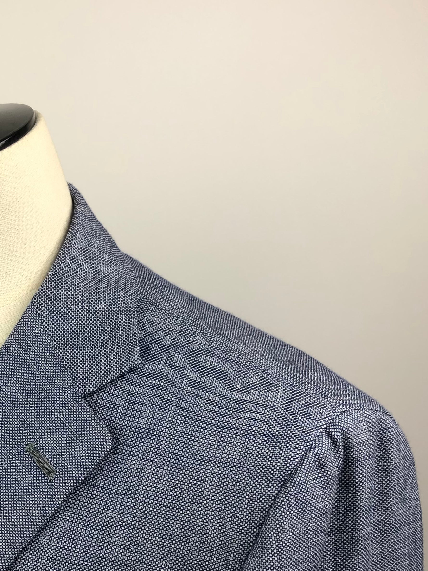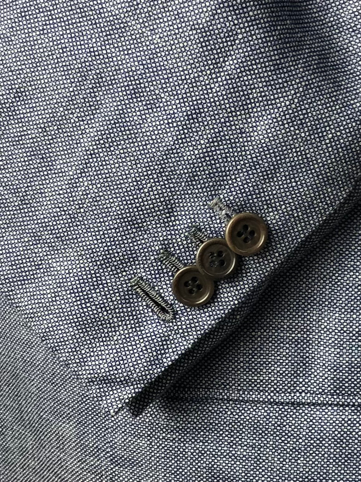 Blue jacket in a luxury linen, cashmere and silk blend with a birdseye pattern. Discover the elaborated sartorial details below.