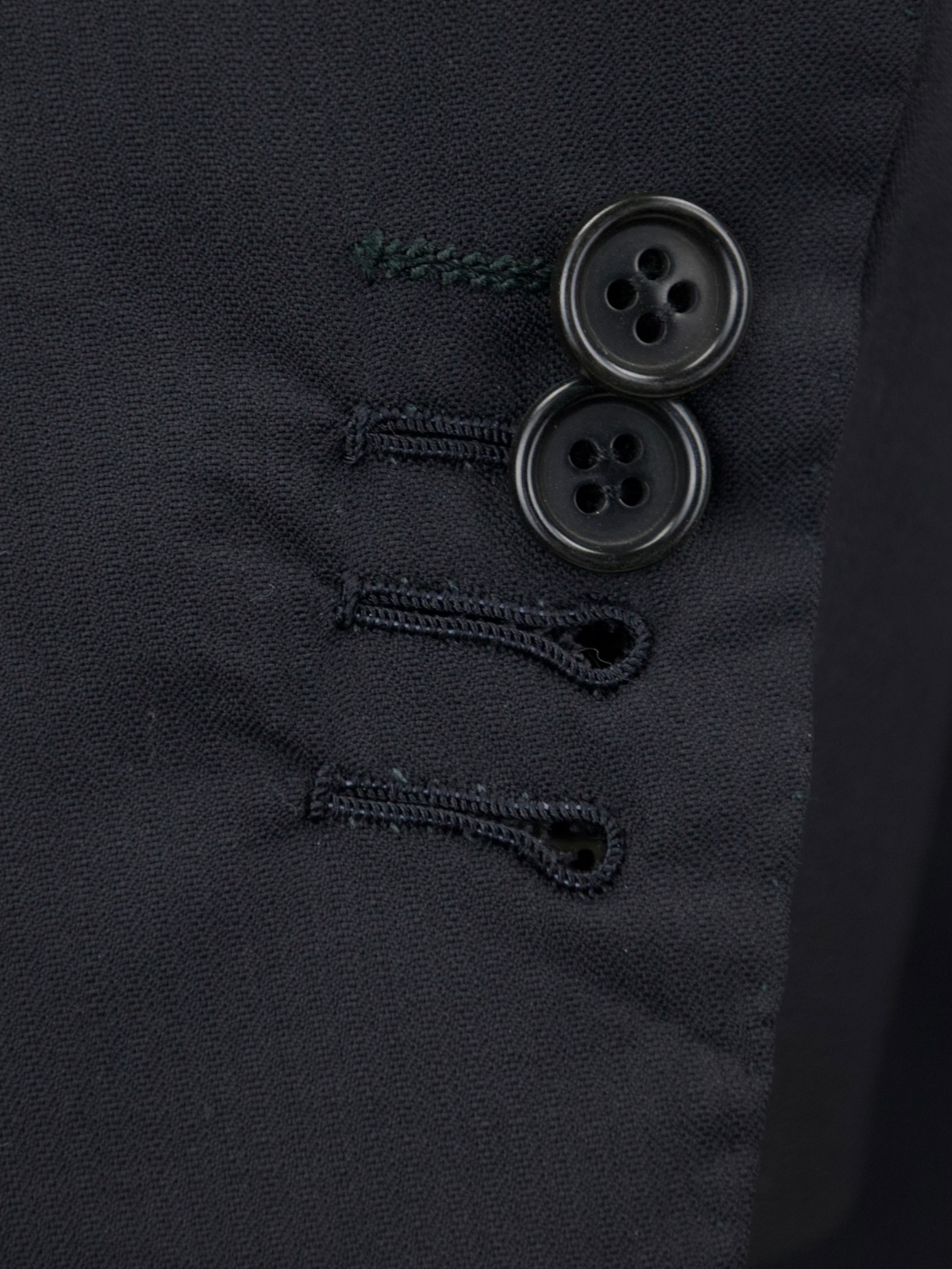 Also known as stacked buttons or waterfall buttons, kissing buttons are associated with Italian tailoring as Italian tailors make their jacket sleeve buttons in the kissing style. In this style, buttons touch each other and overlap one another. Handmade buttonholes; Even this step, apparently the simplest, is treated with an abundance of detail. Attaching the buttons is a job that requires patience and must be completed to perfection.