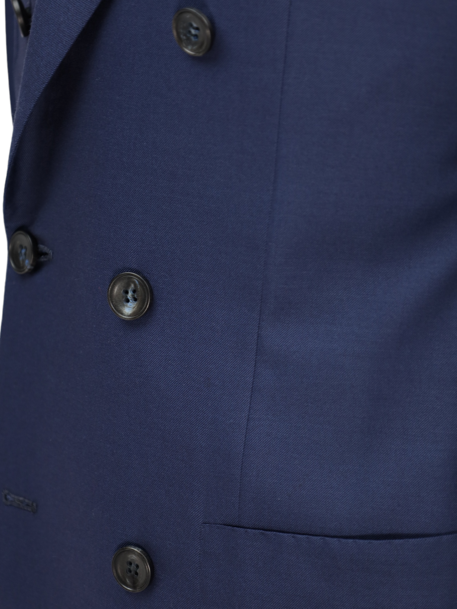 Experience the Kiton Blue Double Breasted Neapolitan Suit, a pinnacle of Italian craftsmanship. This impeccably tailored suit, in a deep blue, features structured peak lapels and a double-breasted closure. It includes trousers designed with a single pleat and stylish turn-ups, enhancing the suit's refined appearance.