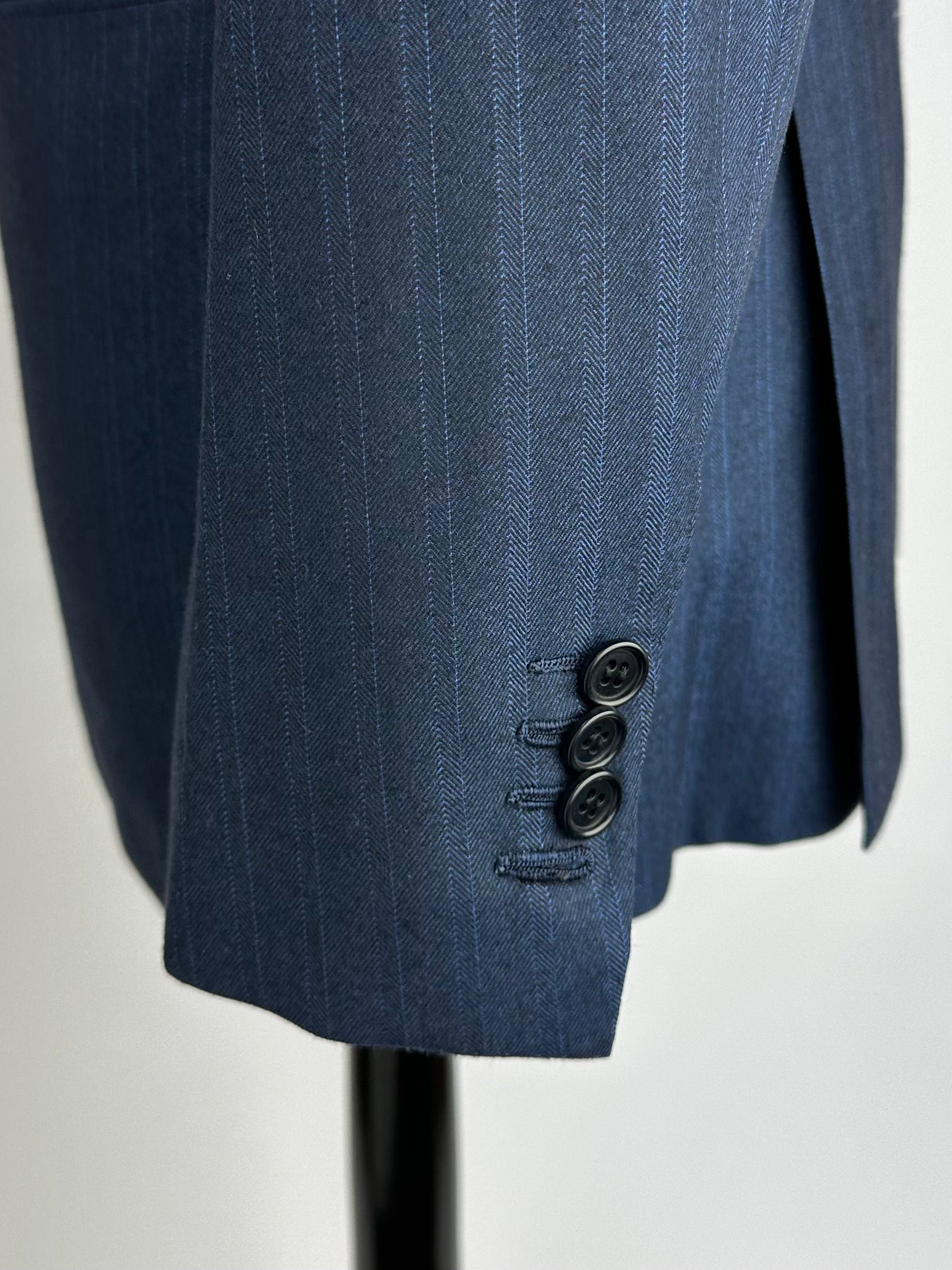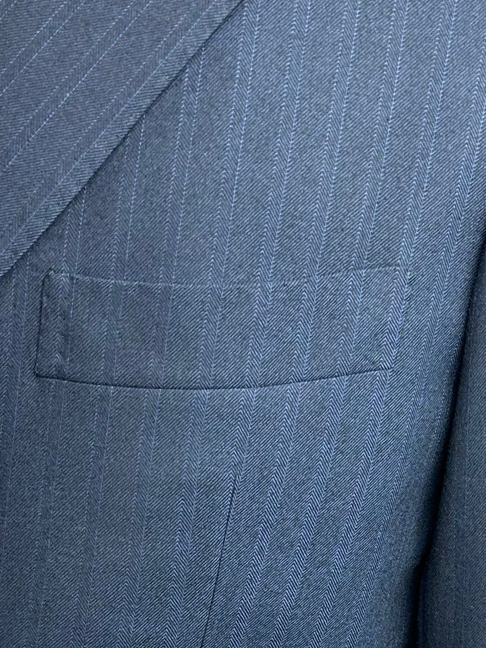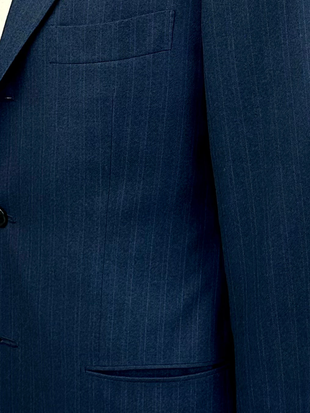 Blue handmade suit, cut from luxurious wool with a pinstripe pattern. Notch lapels, fully lined, expertly constructed with double side vents at the back and two-button closure to keep the profile neat. The notch lapels and welted chest pocket are undeniably classic. Discover the elaborated sartorial details below.