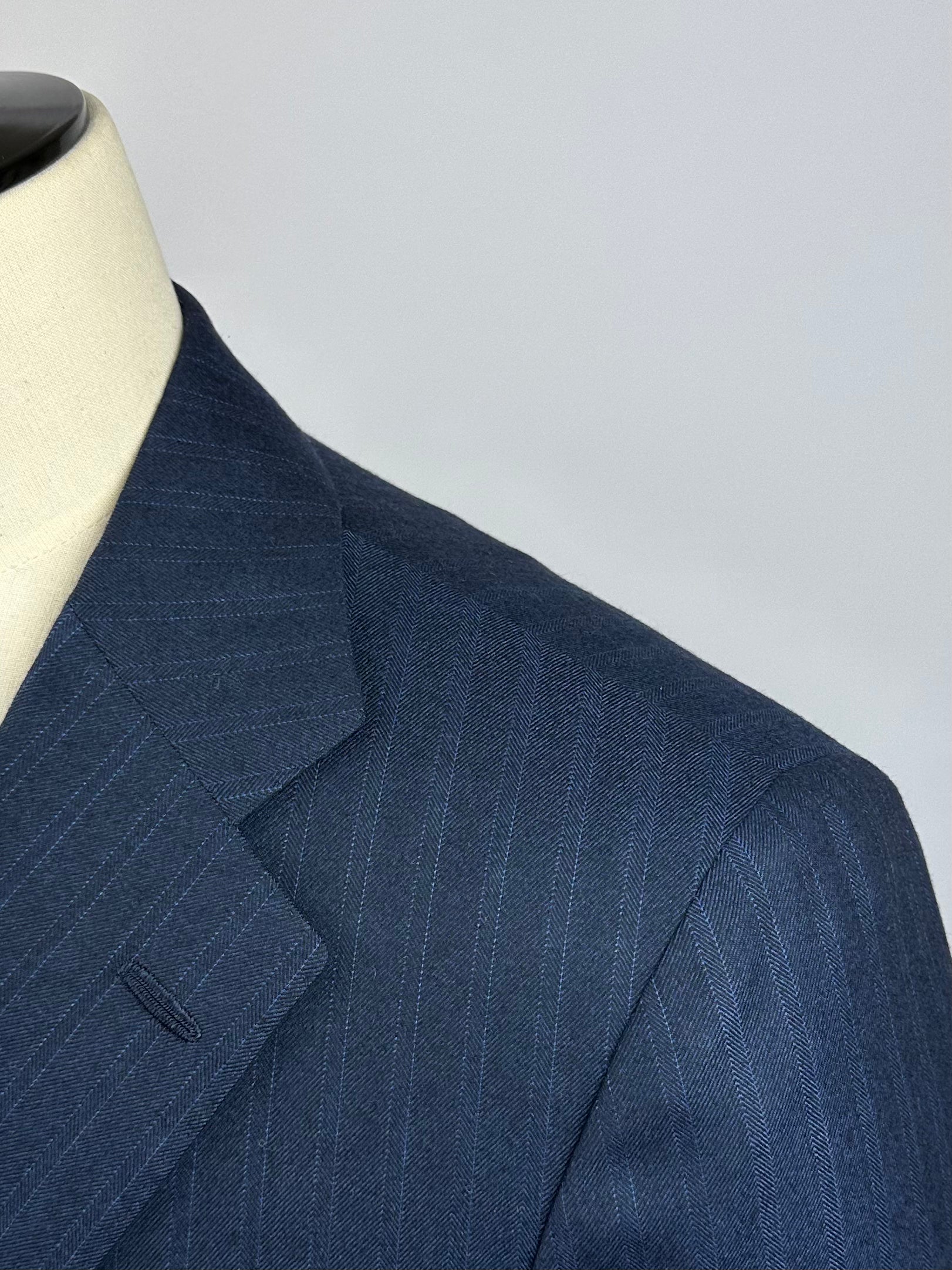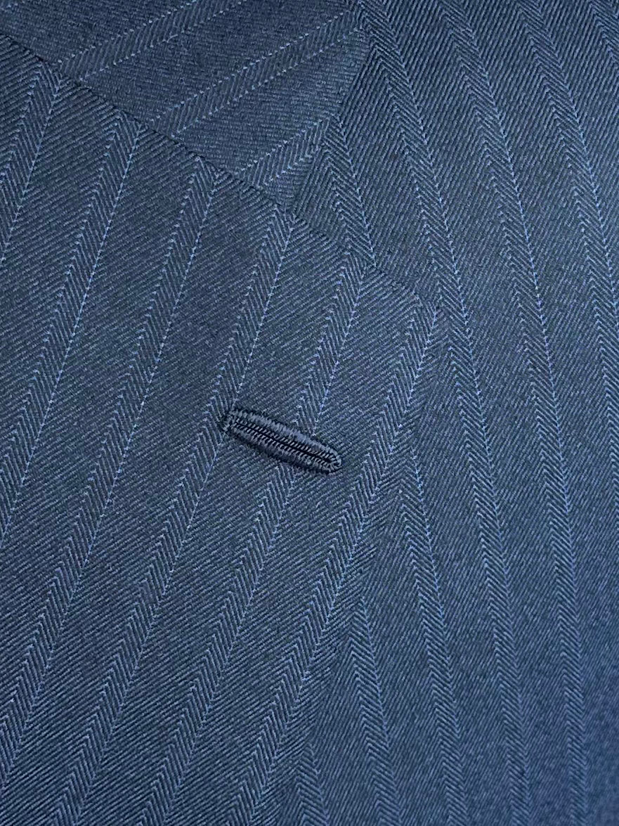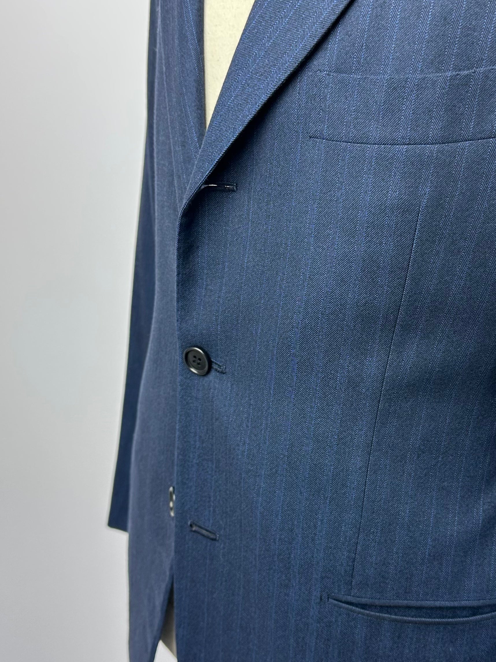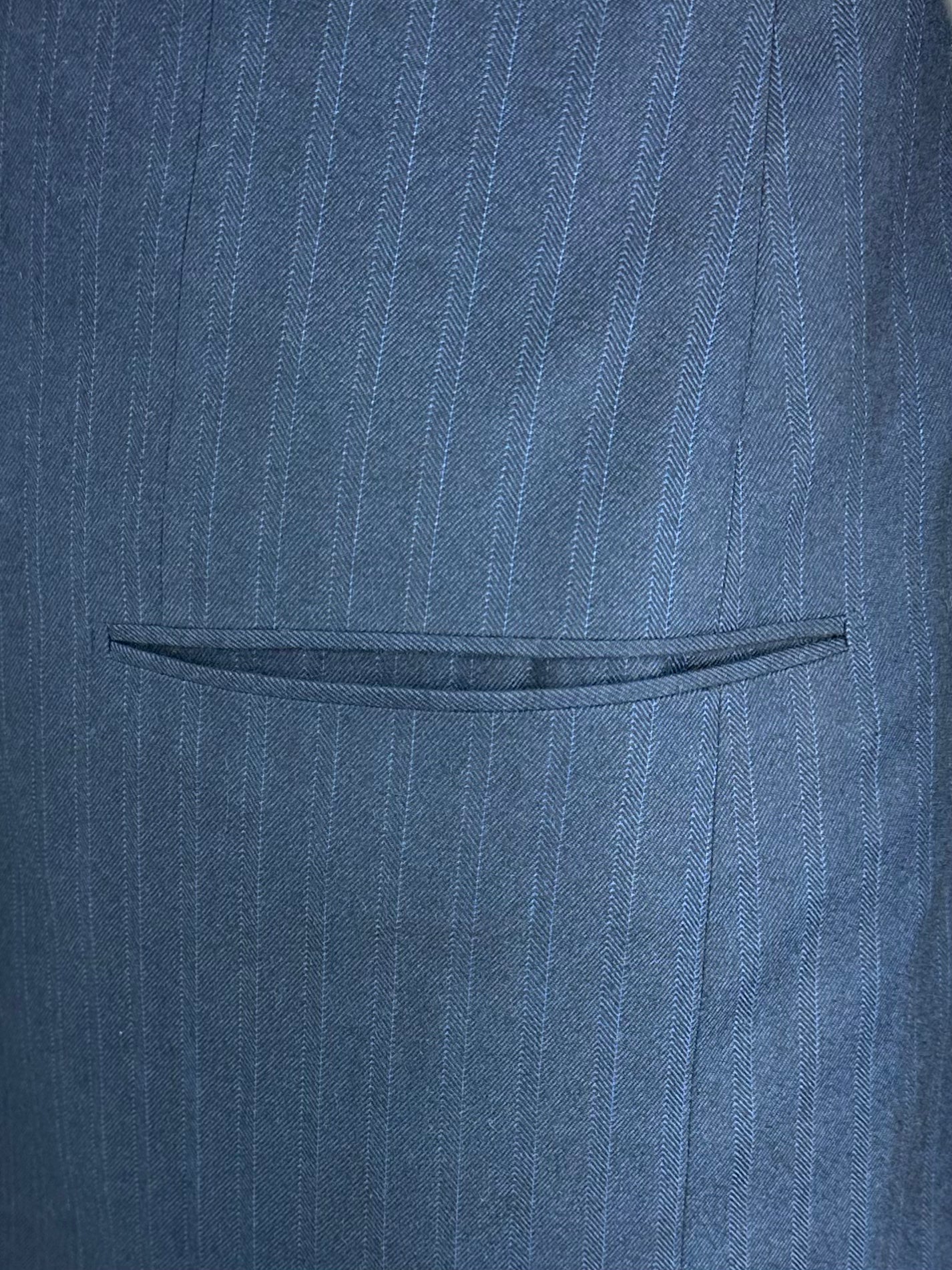 Blue handmade suit, cut from luxurious wool with a pinstripe pattern. Notch lapels, fully lined, expertly constructed with double side vents at the back and two-button closure to keep the profile neat. The notch lapels and welted chest pocket are undeniably classic. Discover the elaborated sartorial details below.