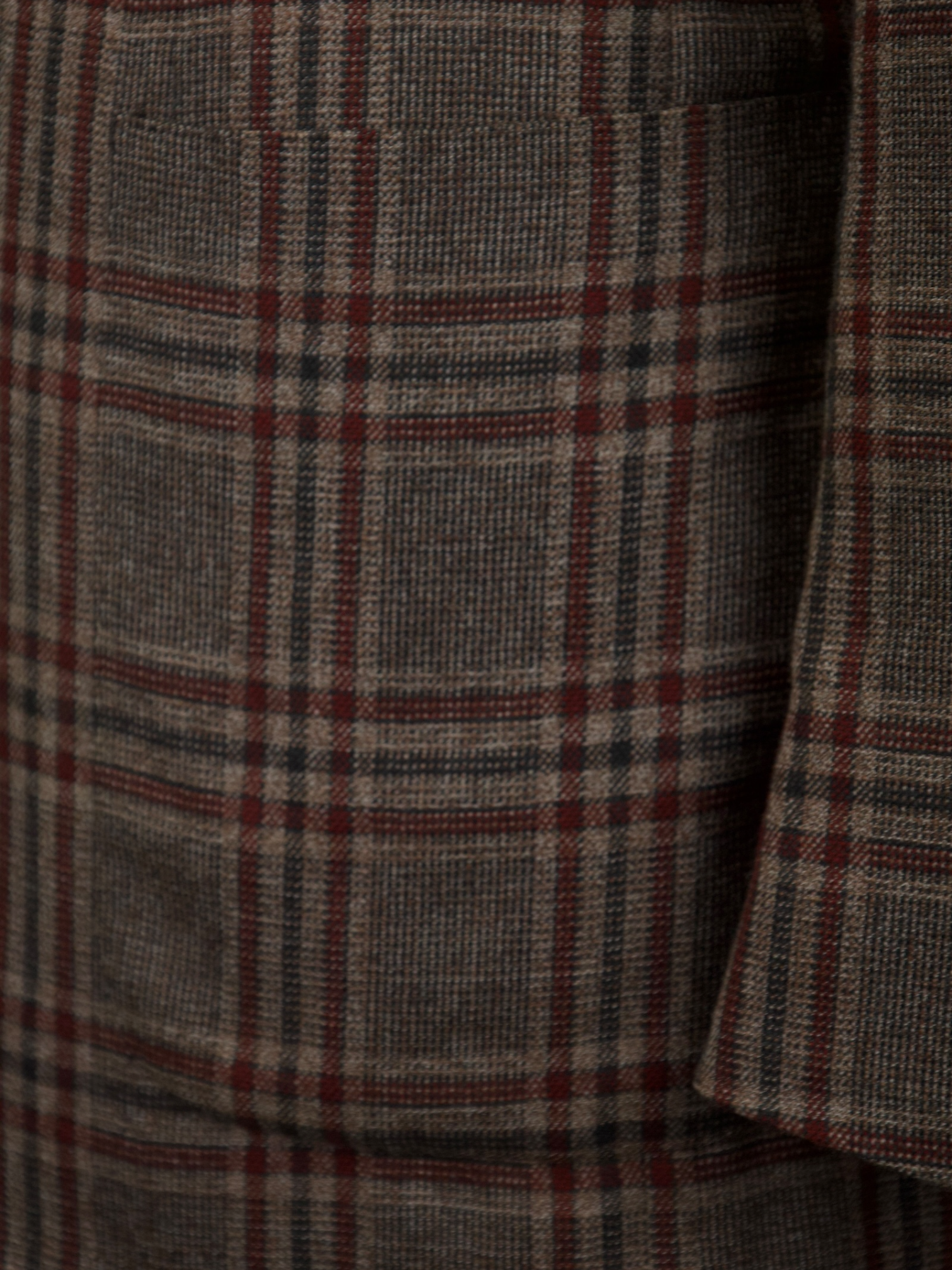 Discover the Kiton brown windowpane jacket, a richly textured piece that brings together earthy tones and impeccable softness. Woven from a blend of cashmere, linen, and silk, the fabric balances structure with breathability, offering a dry, lightweight feel perfect for transitional seasons. The warm brown base is crossed with a subtle red windowpane, adding just the right amount of color without tipping into boldness. With classic notch lapels, a half-lined interior, and a softly tailored silhouette, it’s an effortless piece with depth and character.