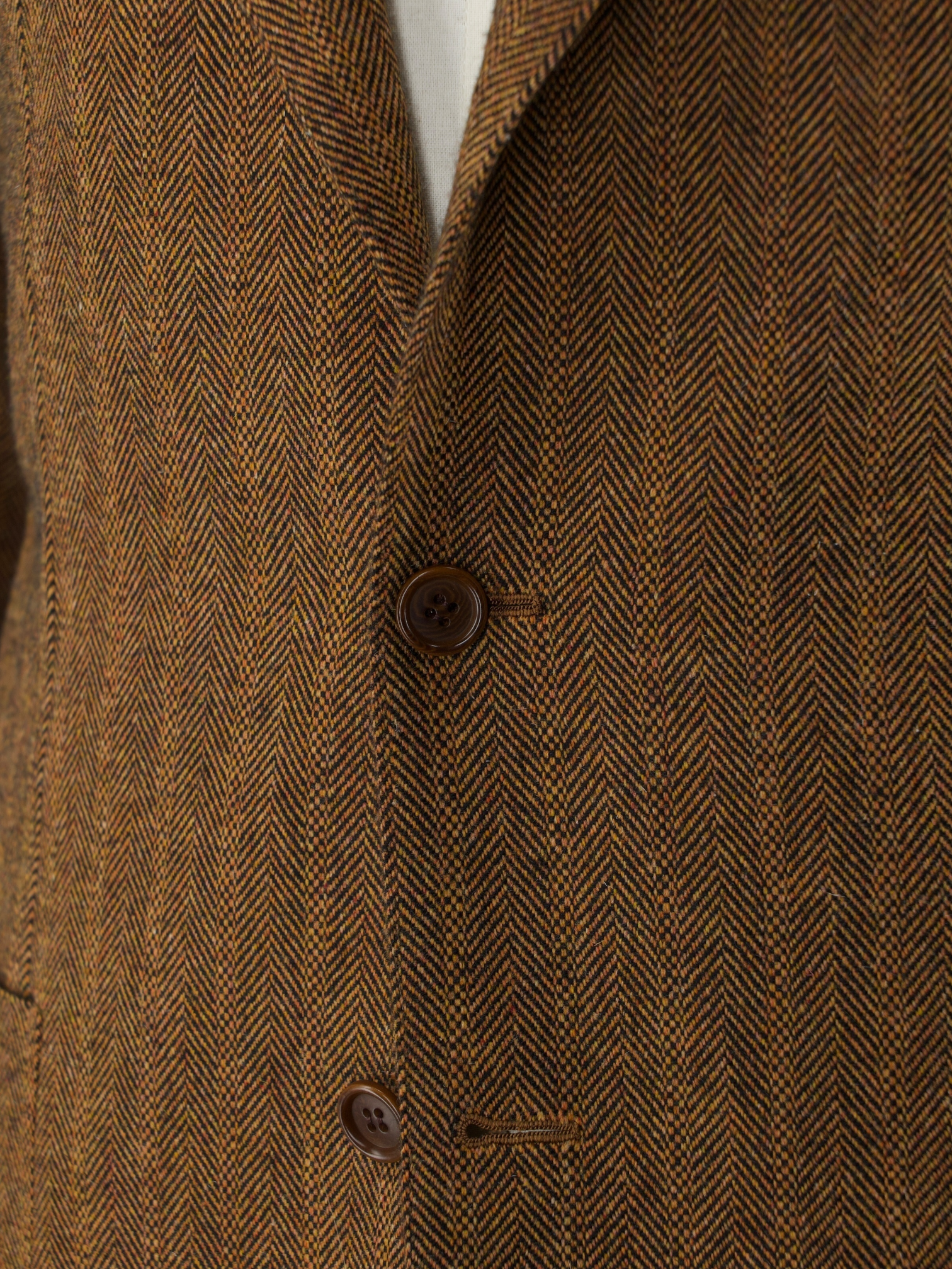 The ‘tre bottoni stirato a due’, also known as the three rolling on two lapel style, is perhaps the most infamous characteristic of the Neapolitan style jacket. The top button and buttonhole are ornamental, so are left unbuttoned. As the lapel rolls down it elegantly folds over the top button and stops just 4 cm above the second button creating the distinct roll of the lapel the style is known for. As it is intended to remain unbuttoned, the top buttonhole is actually made inside out so the beautiful side will still be visible.