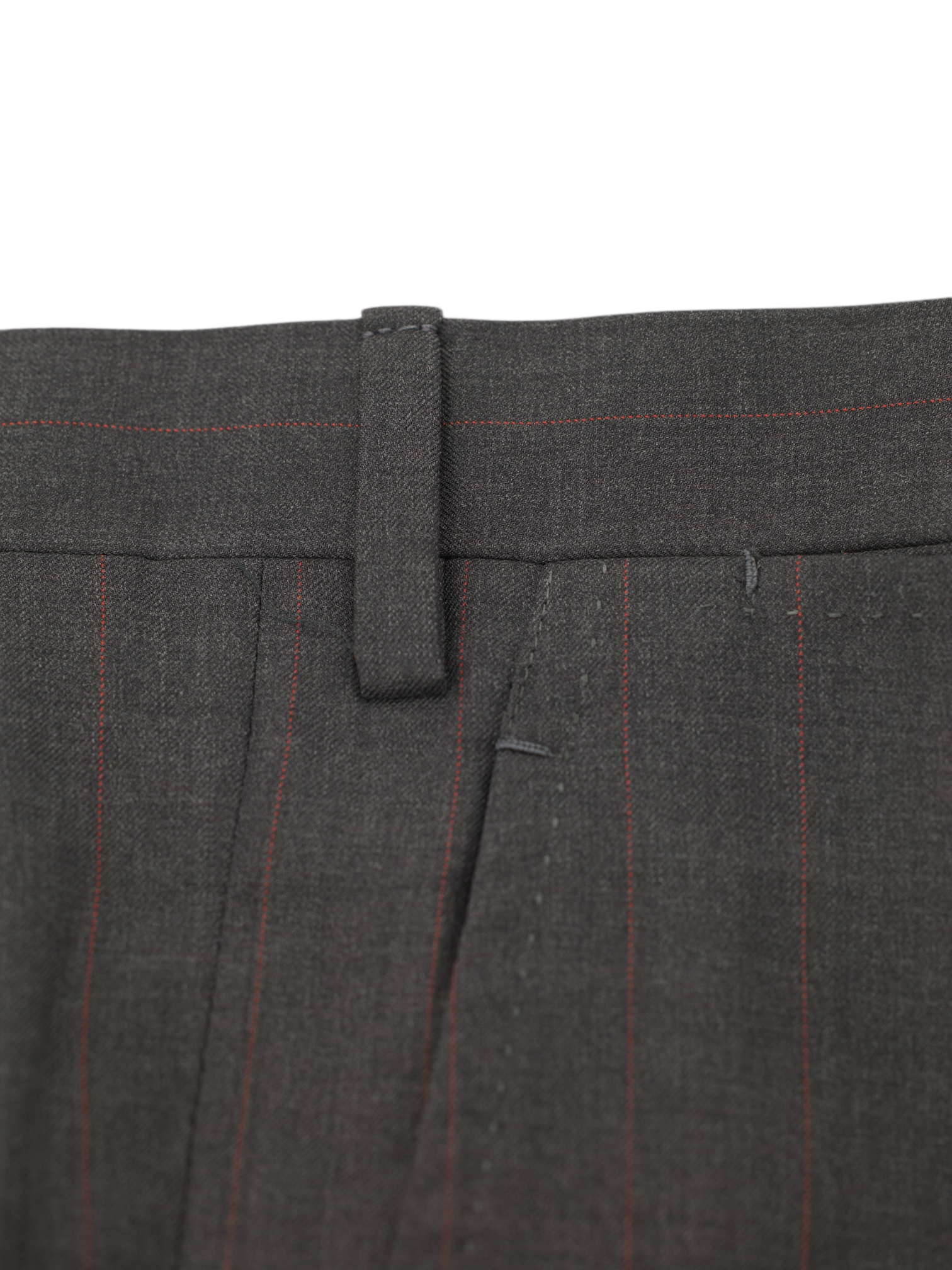 Discover the depth and refinement of this Kiton suit, tailored in the house’s exclusive “Blanc Blue” Super 180’s wool, woven from ultra-fine 14-micron fibres that offer remarkable softness and a natural, elegant sheen. The fabric carries a deep charcoal base traced with fine red pinstripes, striking a perfect balance between boldness and discretion. Notch lapels, a 2.5 button closure, and brown horn buttons bring a classic structure to the jacket, complemented by flap pockets and a full lining for year-round versatility. The single-pleated trousers add a note of relaxed sophistication while maintaining a tailored silhouette.