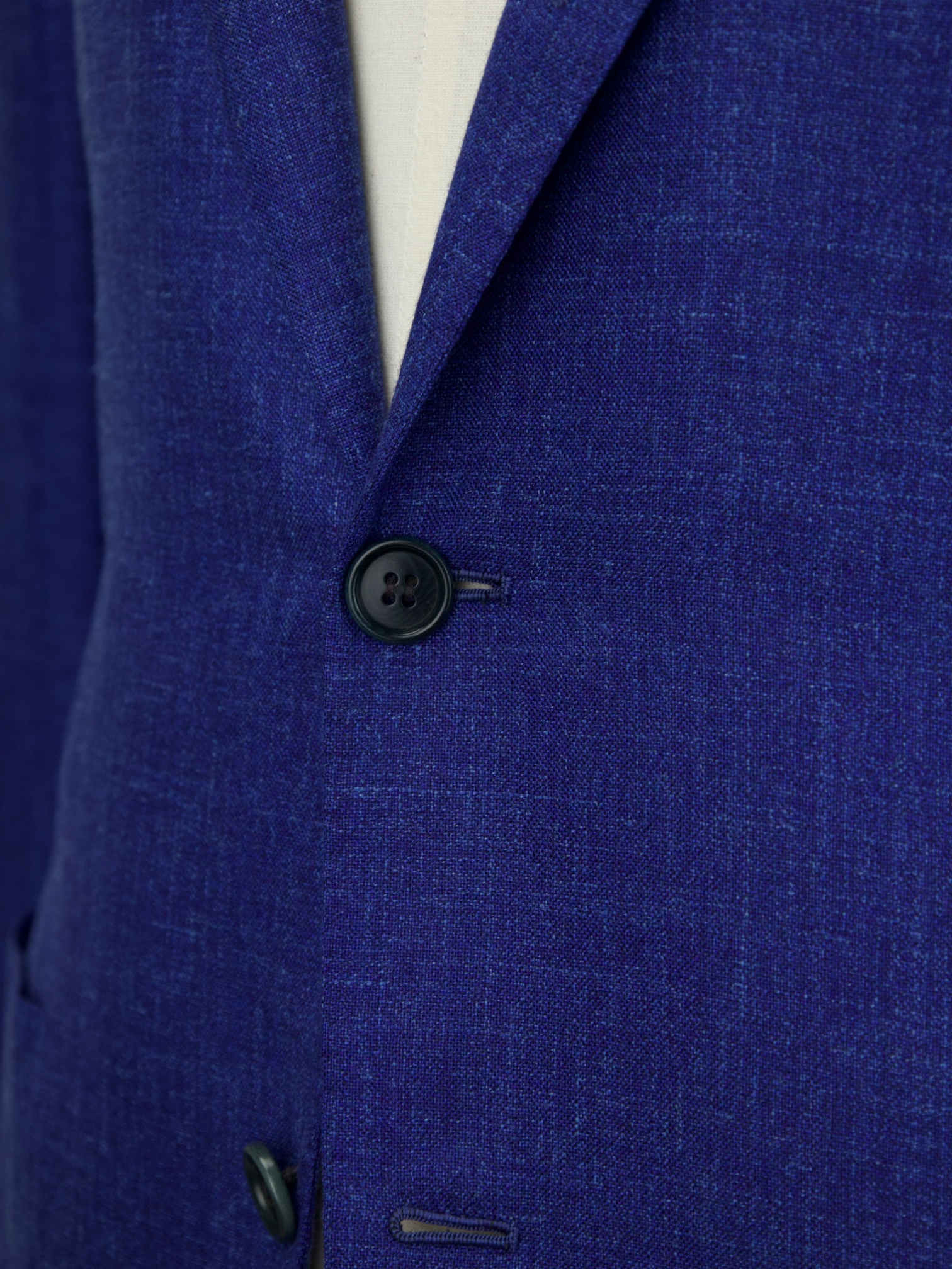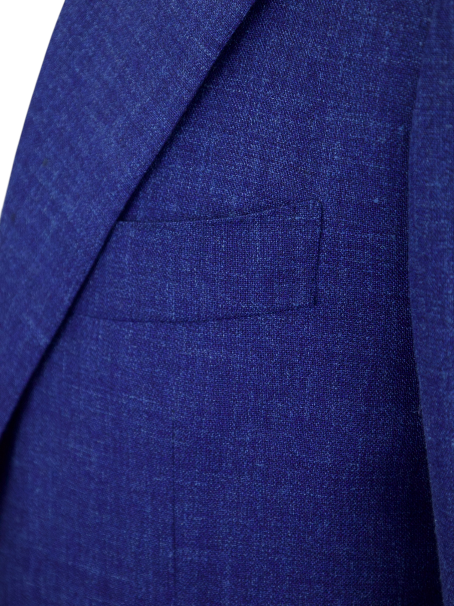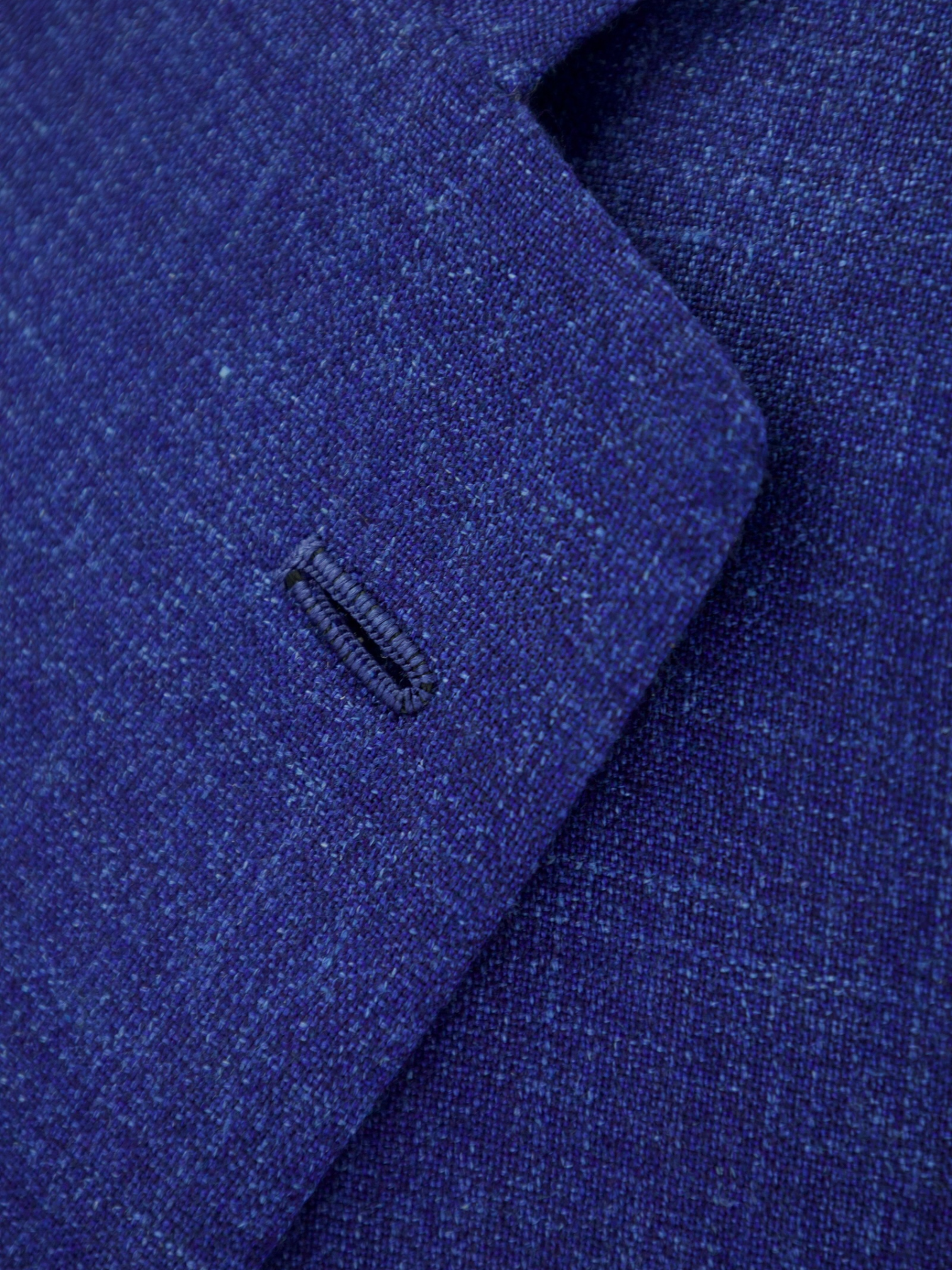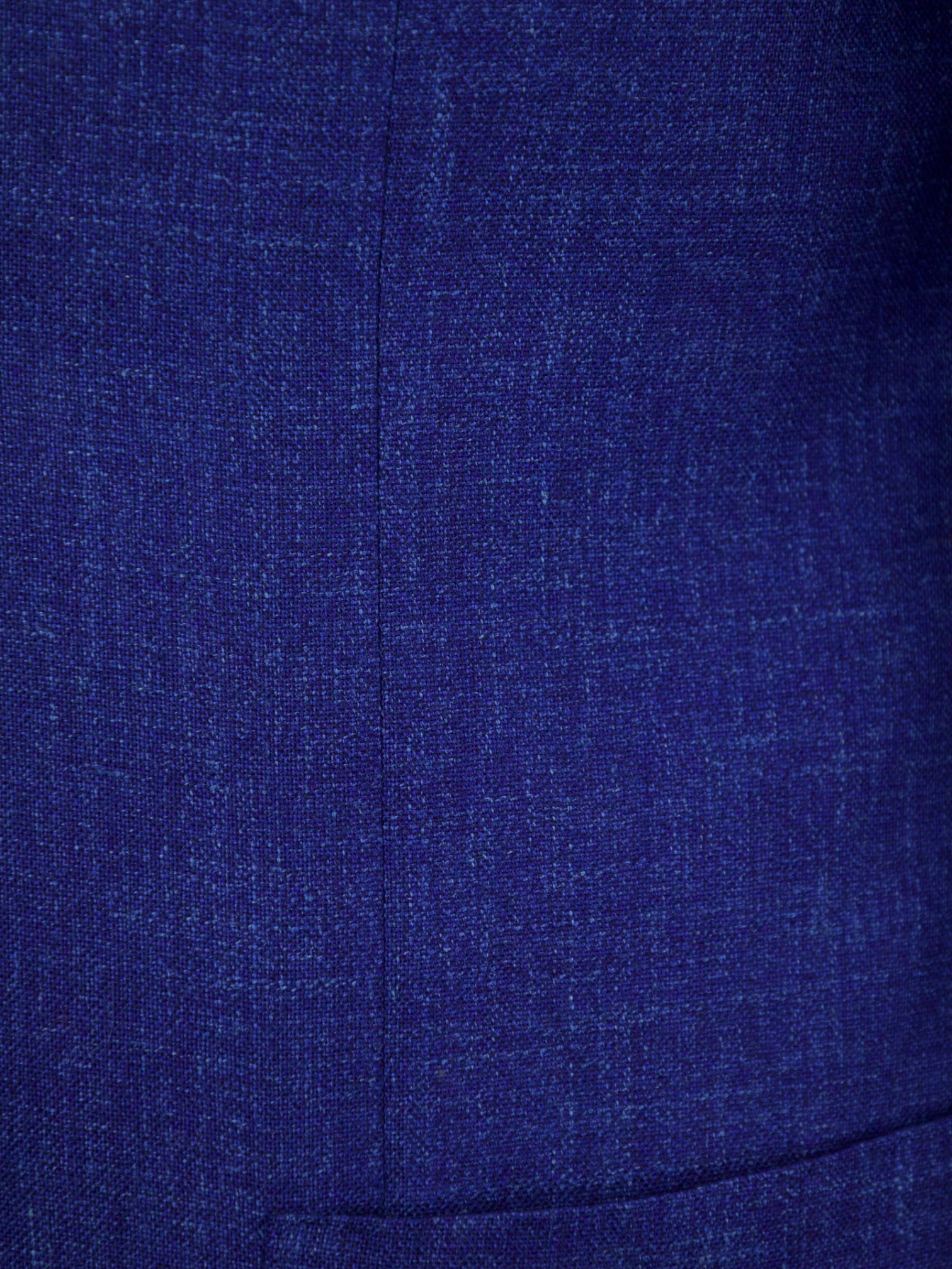 Cobalt blue single-breasted handmade suit, cut from luxurious wool, silk and linen blend with a melange pattern. Discover the elaborated sartorial details below.
