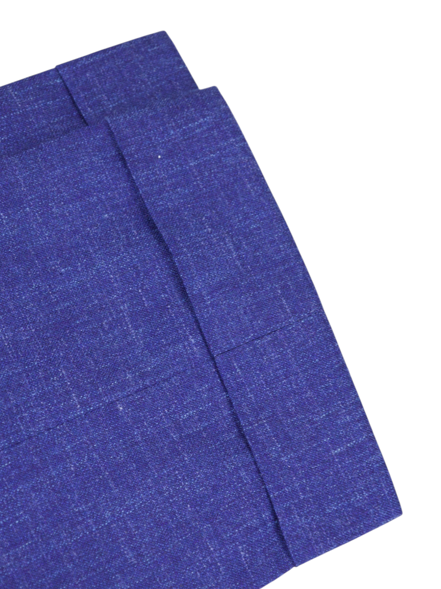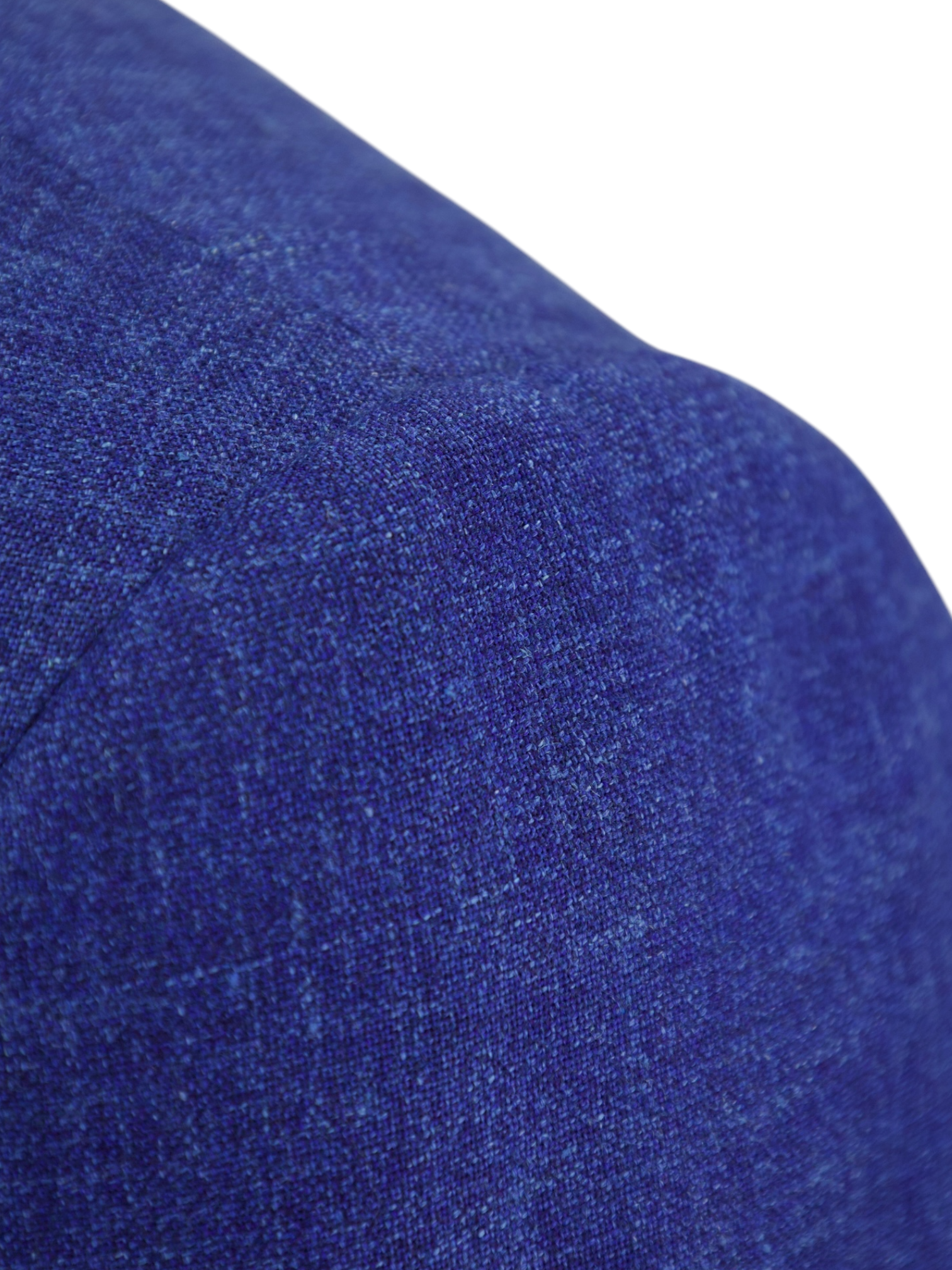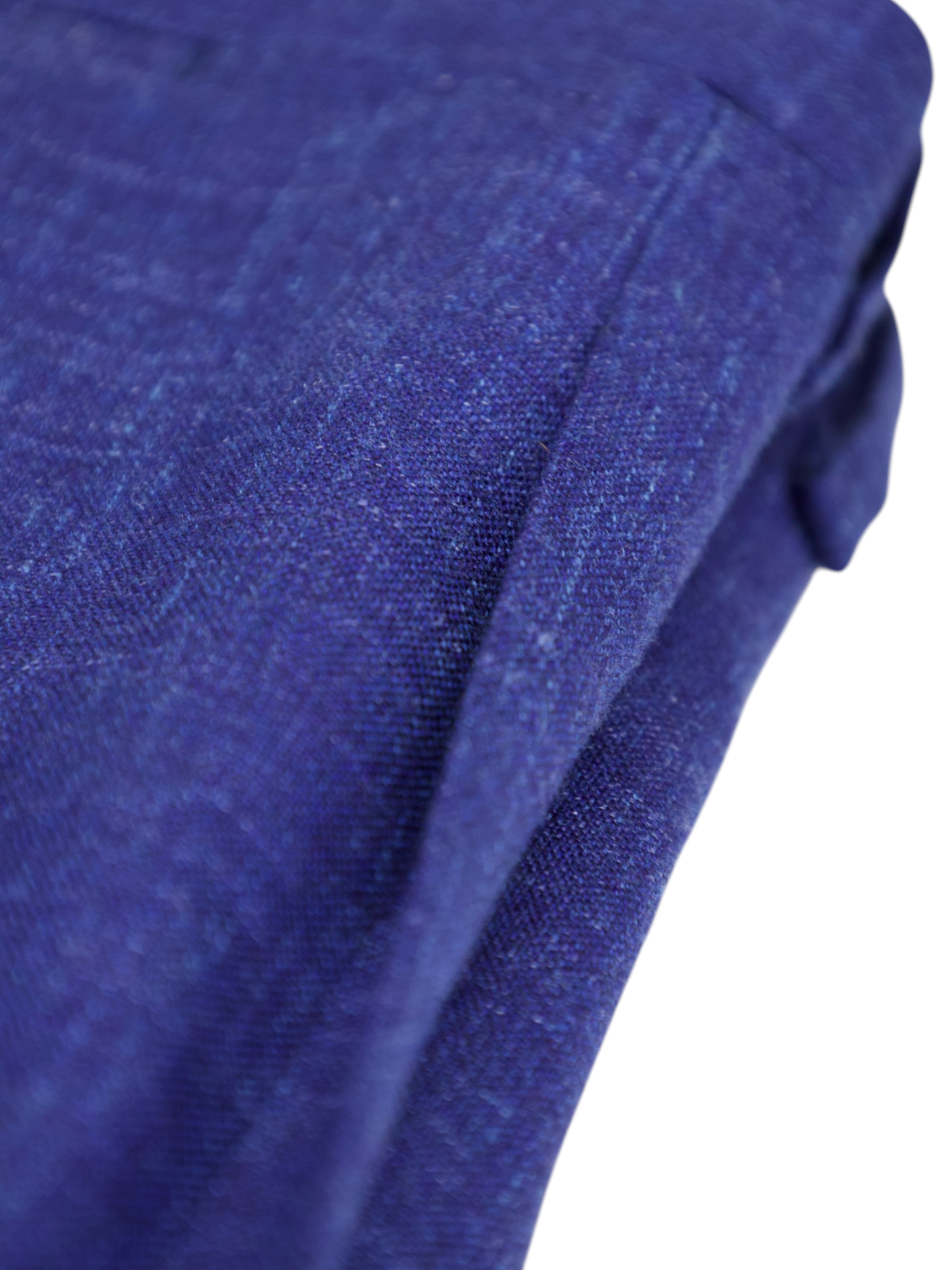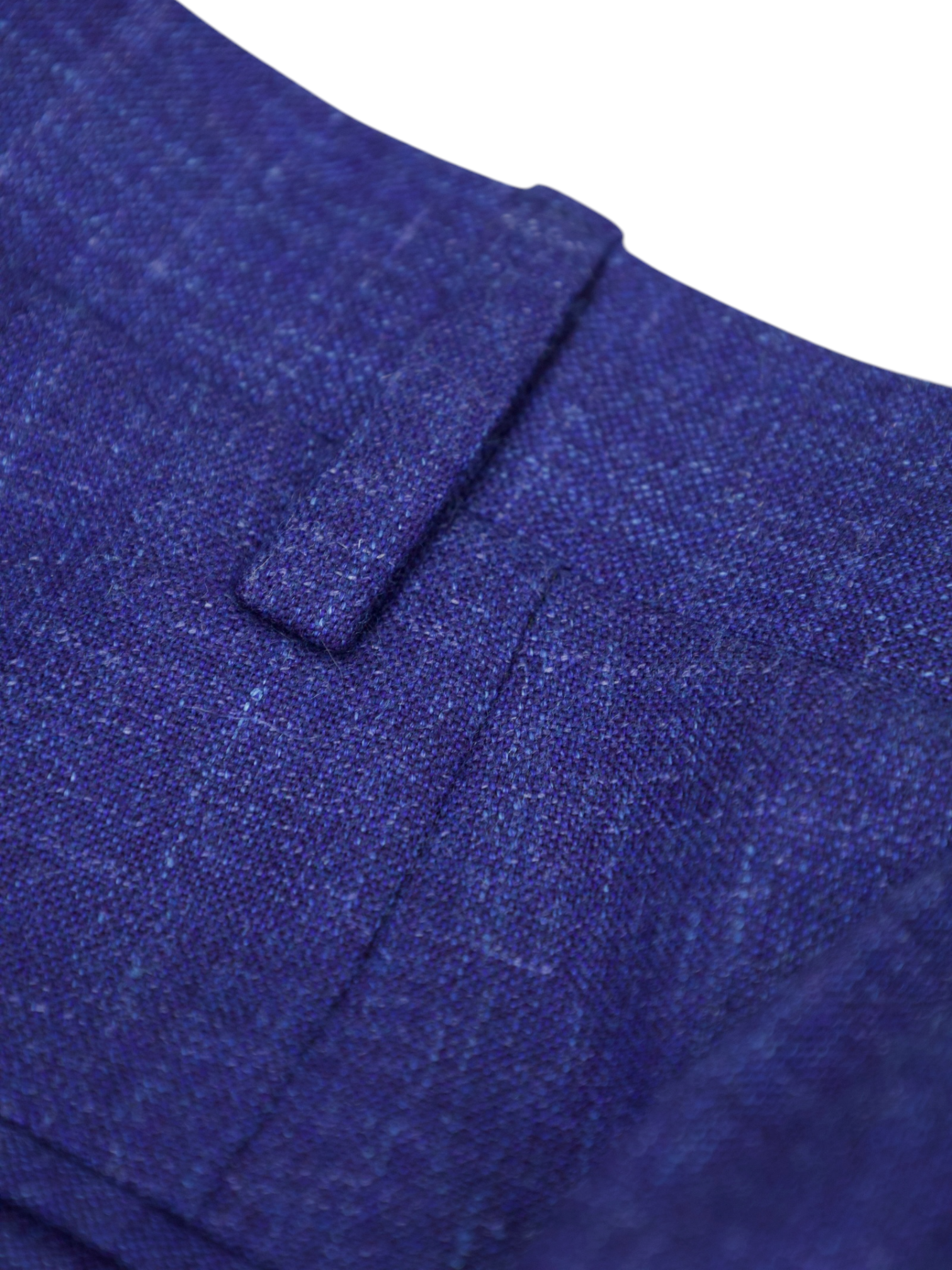 Cobalt blue single-breasted handmade suit, cut from luxurious wool, silk and linen blend with a melange pattern. Discover the elaborated sartorial details below.