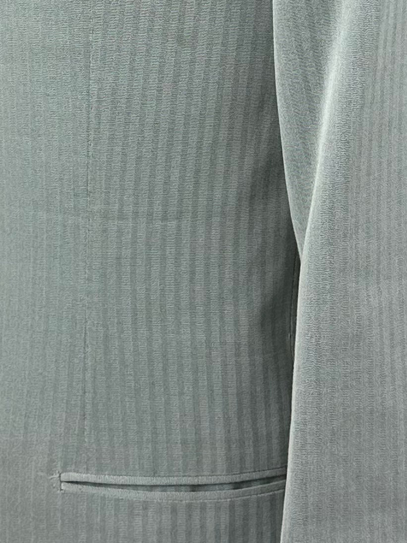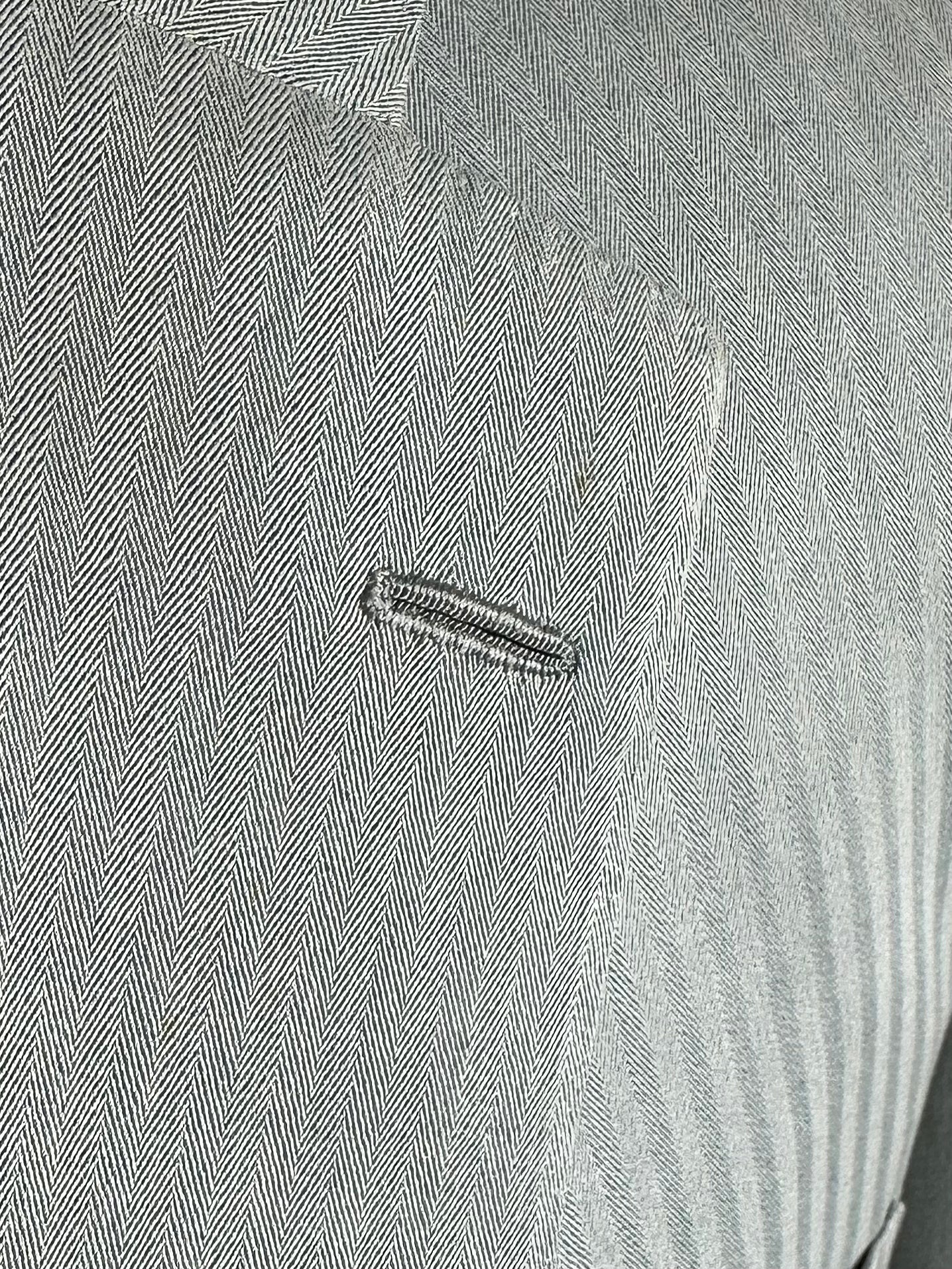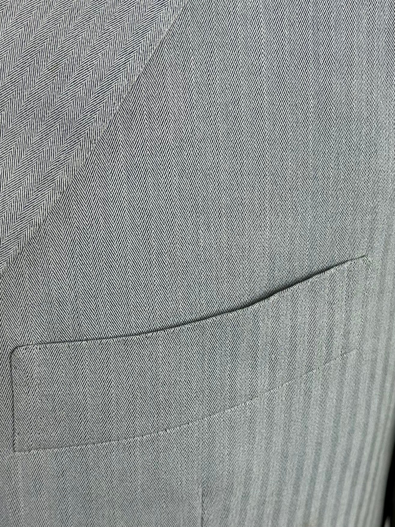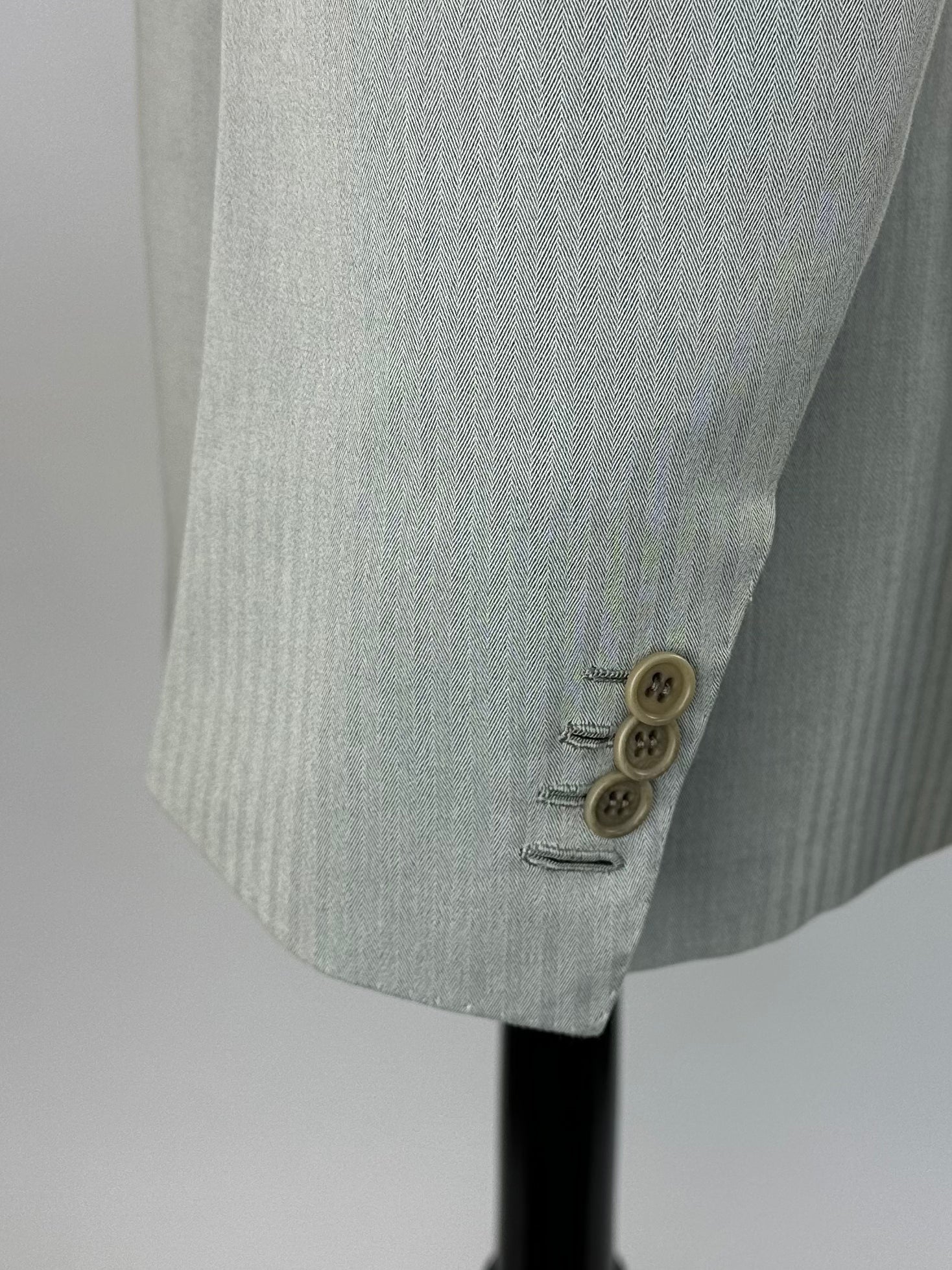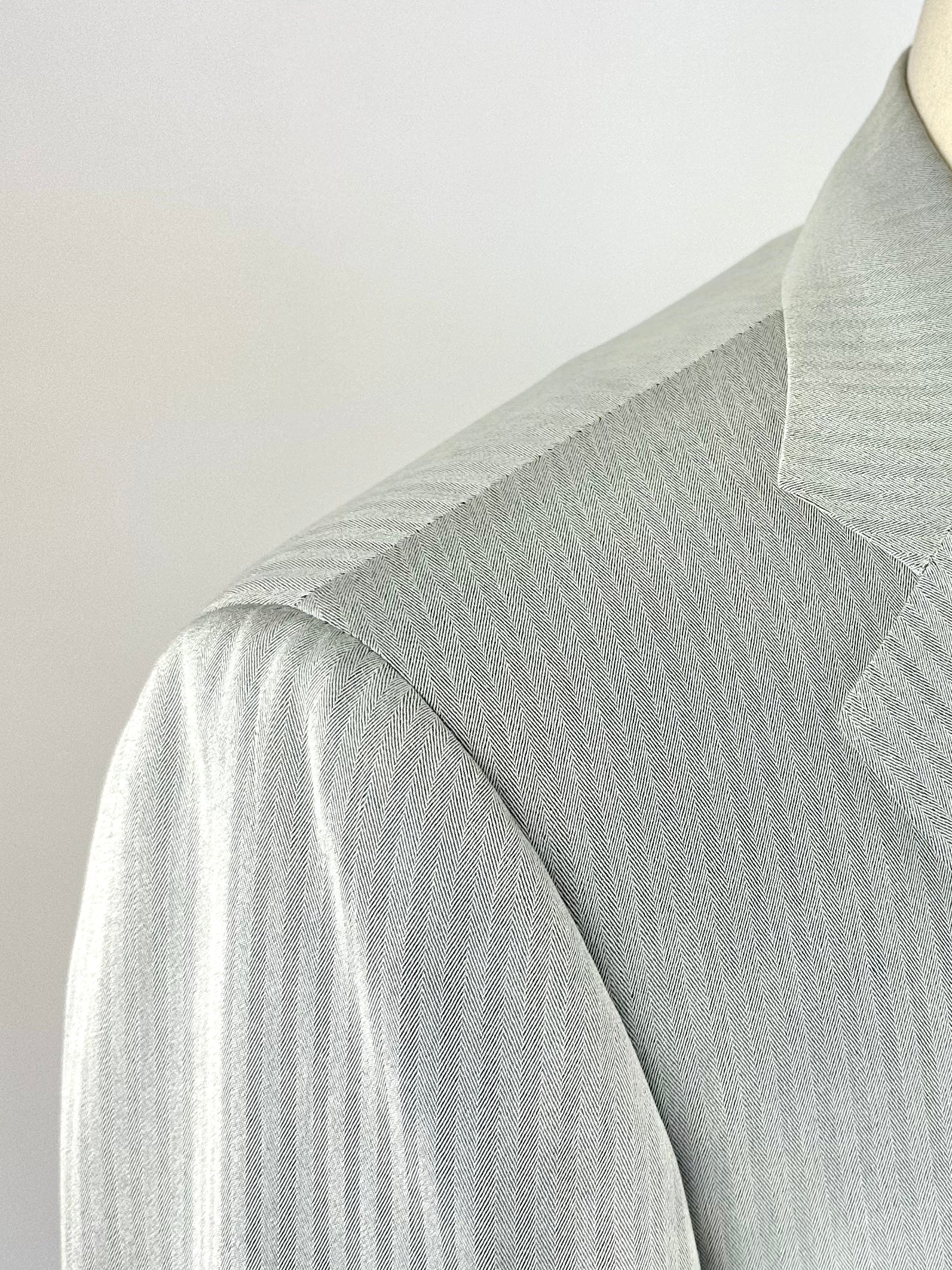 Light blue single-breasted handmade suit, cut from luxurious cotton, wool and silk blend with a herringbone pattern. Discover the elaborated sartorial details below.