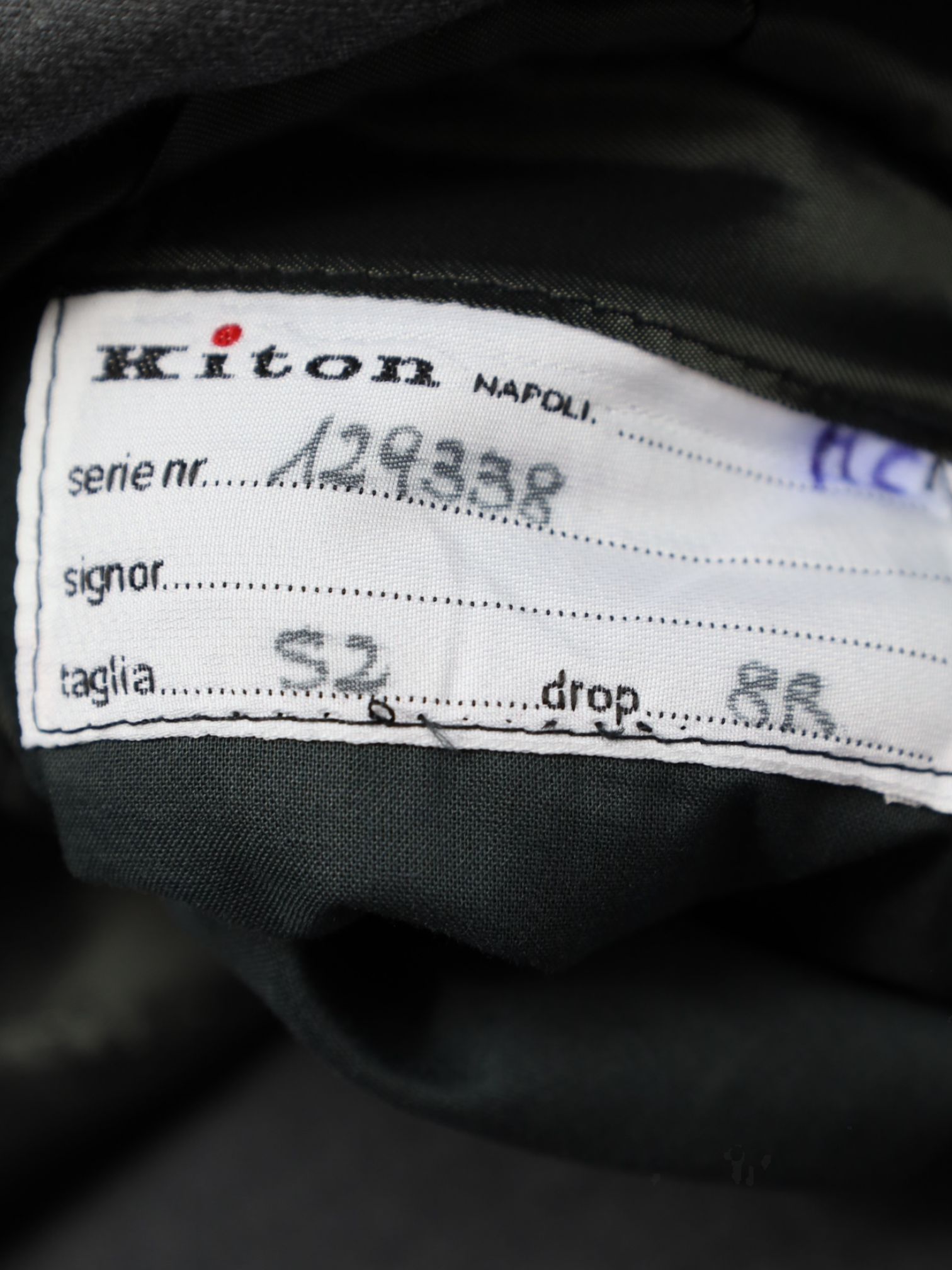 Experience the craftsmanship of the Kiton Dark Grey Pinpoint Suit, meticulously crafted through a demanding process of 1,800 steps by master tailors in Naples. This suit features a dark grey pinpoint fabric, complemented by refined notch lapels and mother of pearl buttons that accentuate its luxurious appeal. The trousers, designed with a flat front and stylish turn-ups, integrate classic and contemporary elements seamlessly. Each detail reflects Kiton’s commitment to unparalleled quality and artisanal excellence, making this suit a must-have for discerning professionals. Discover the elaborated sartorial details below.