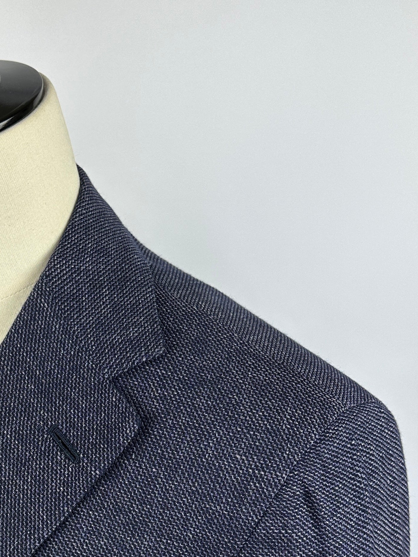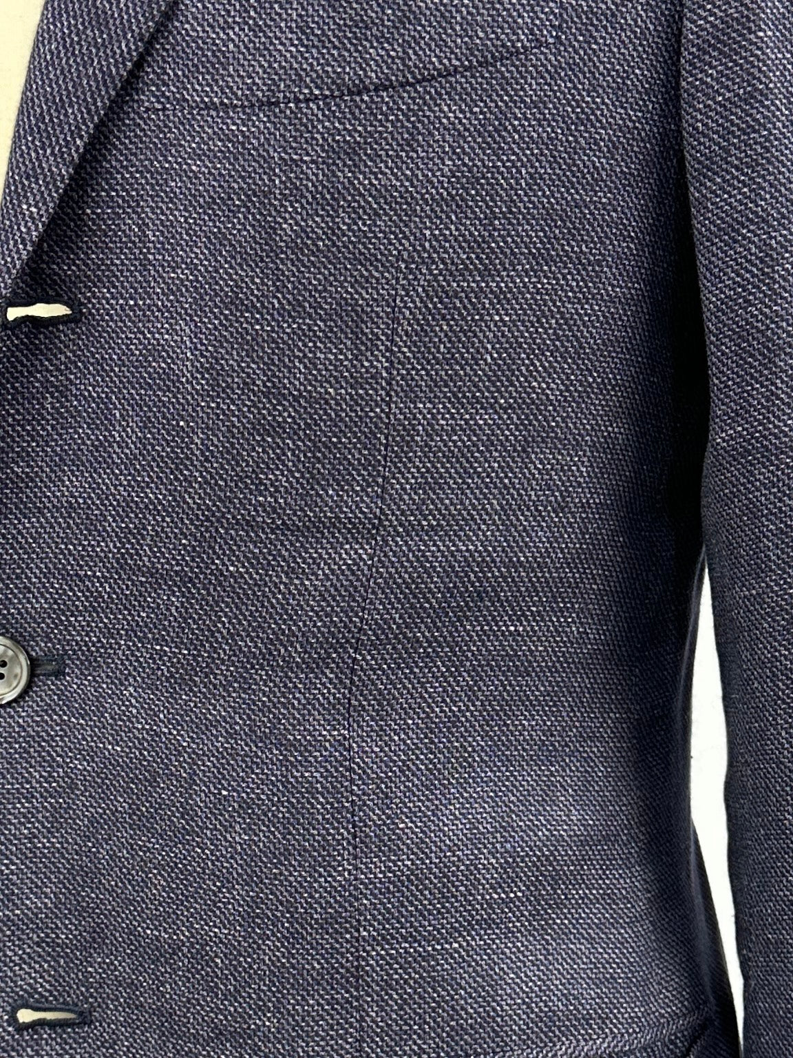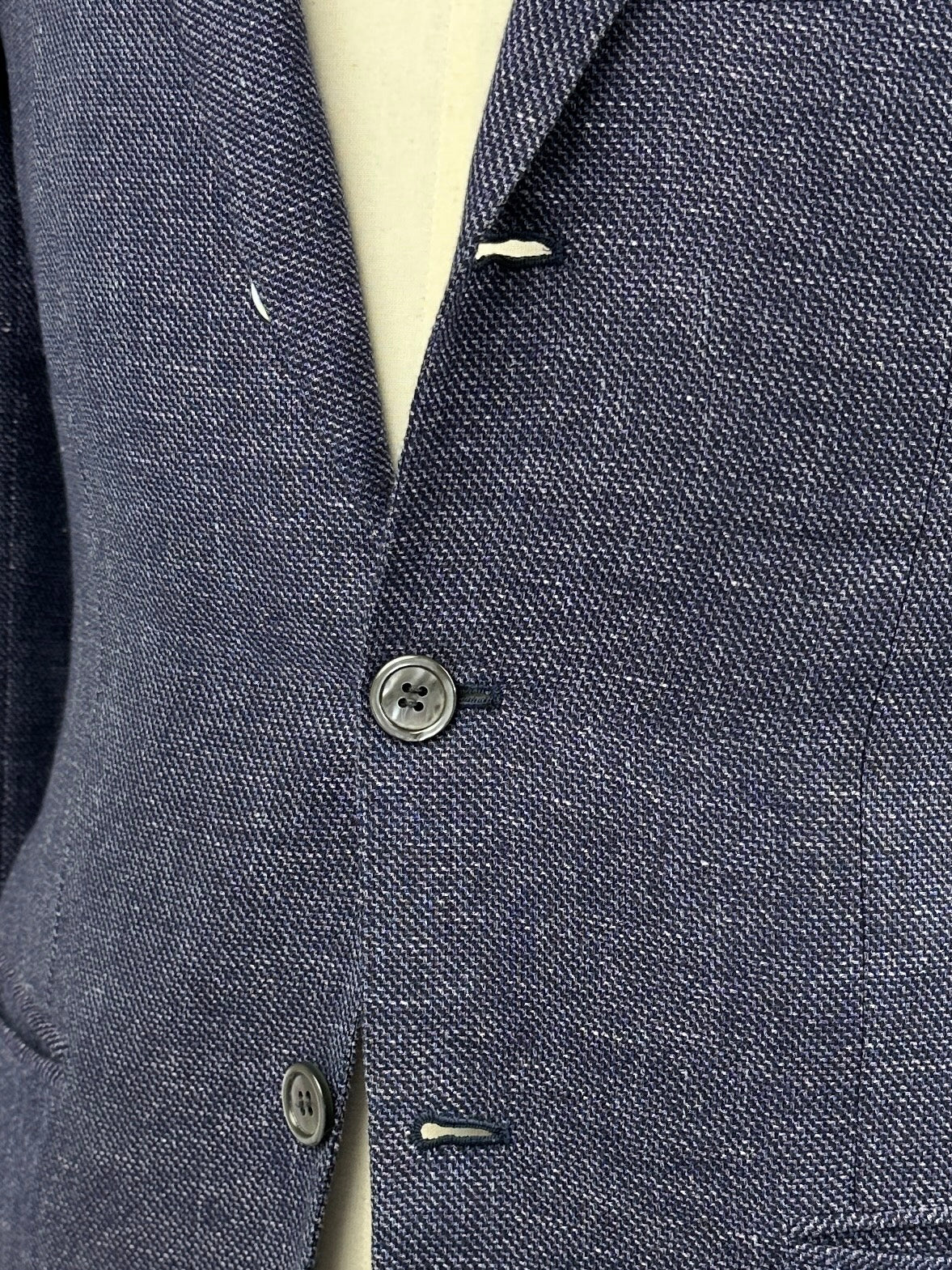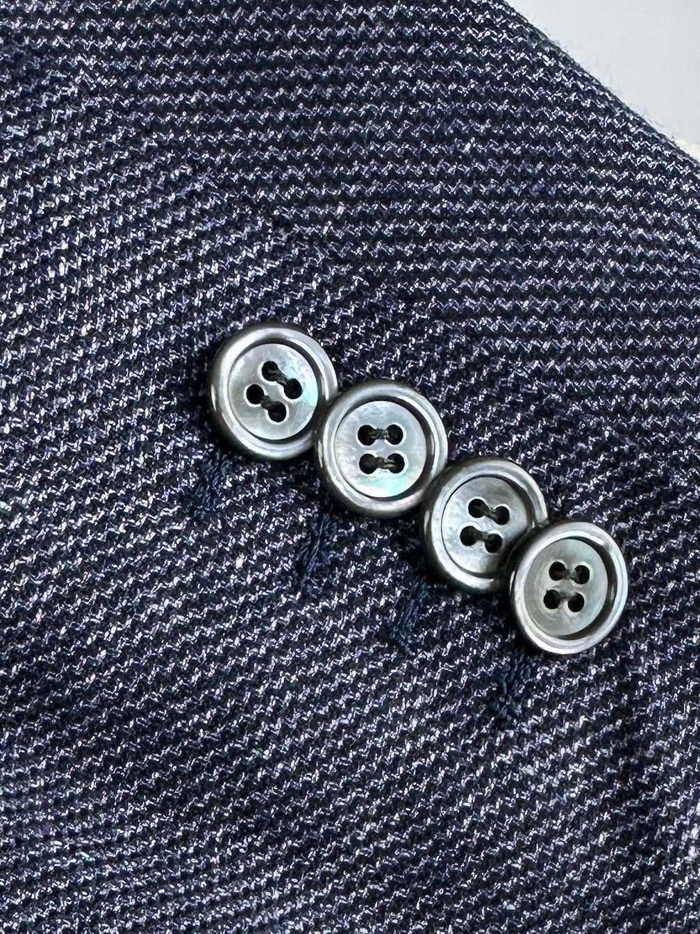 Handmade Lavendel jacket in a luxury linen, cashmere and silk blend with a sharkskin pattern finished with exquisite Mother of Pearl buttons. Discover the elaborated sartorial details below.