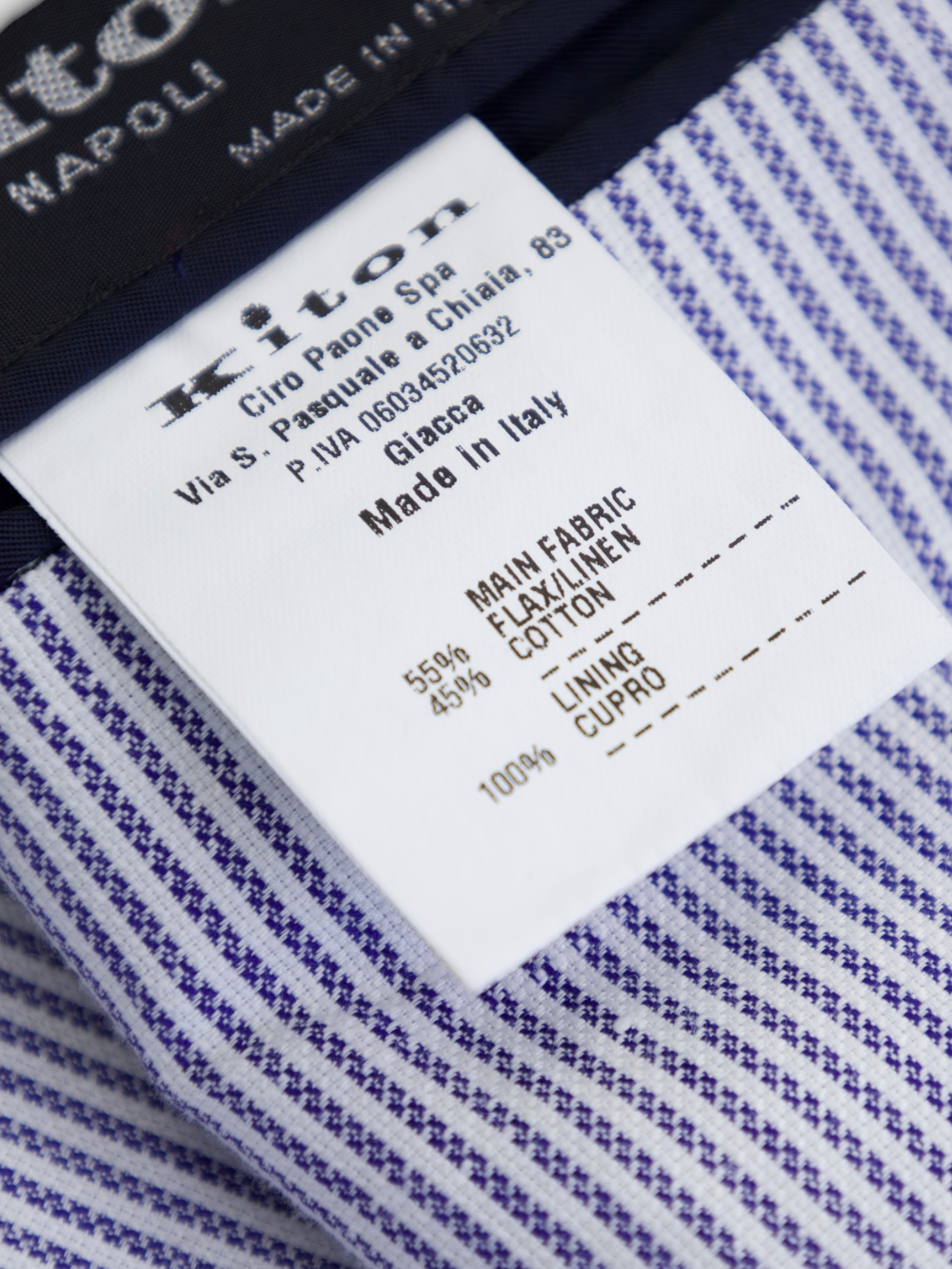 Kiton's renowned craftsmanship is evident in every detail of this piece. Handmade in Naples, Italy, the jacket is constructed using traditional tailoring techniques that ensure a flawless fit. The blend of linen and cotton provides an ideal balance of texture, durability, and ease of wear, while hand-finished details such as precise stitching, natural shoulders, and artisanal buttonholes showcase the brand’s dedication to excellence. This jacket is the epitome of understated luxury, making it an essential addition to the modern gentleman’s wardrobe.
