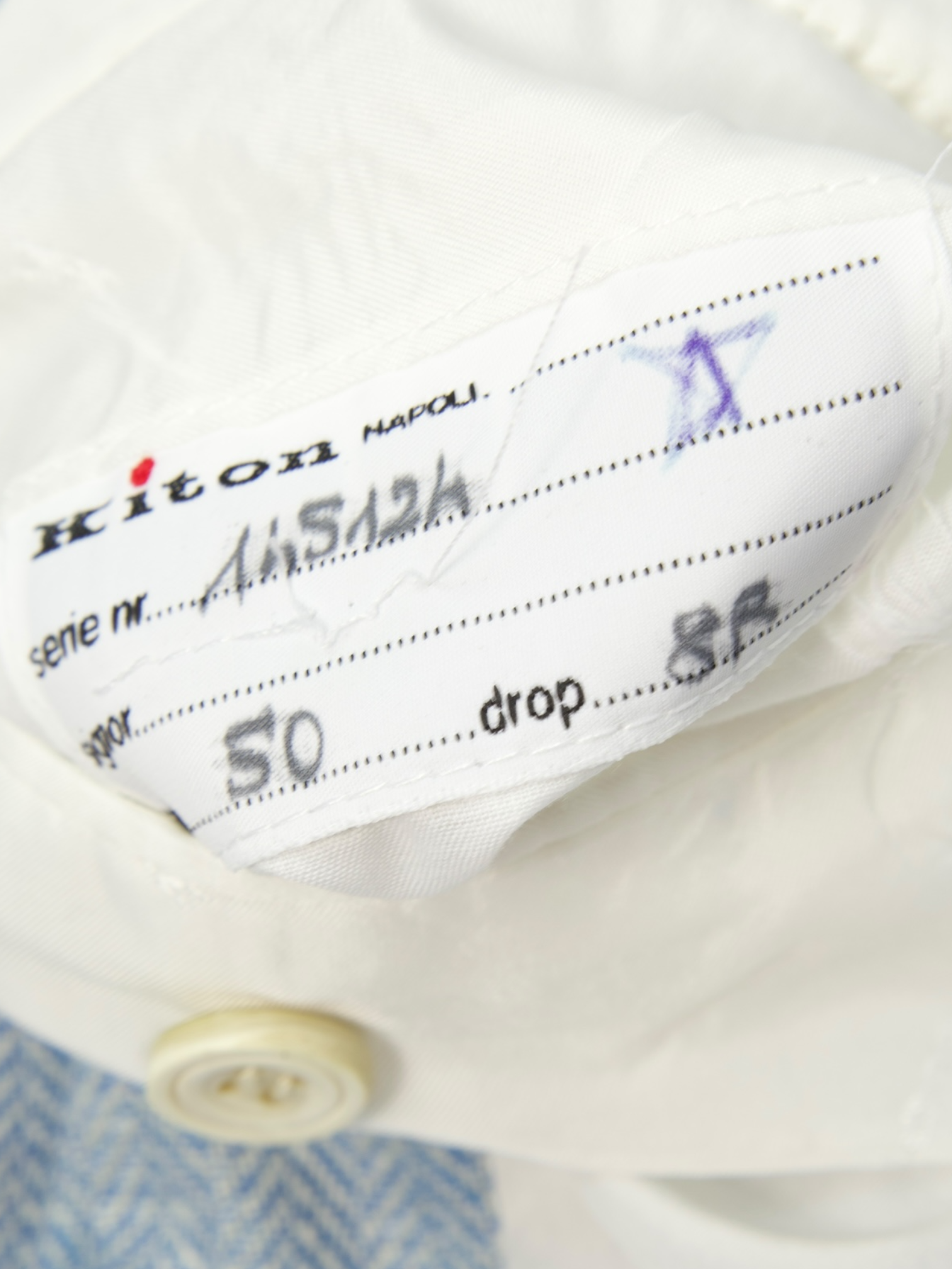 Kiton’s master tailors add two darts - think of them as pinched seams - to ensure the jacket’s body achieves a slim silhouette. The process, called mezzo punto riprese, is done entirely by hand.