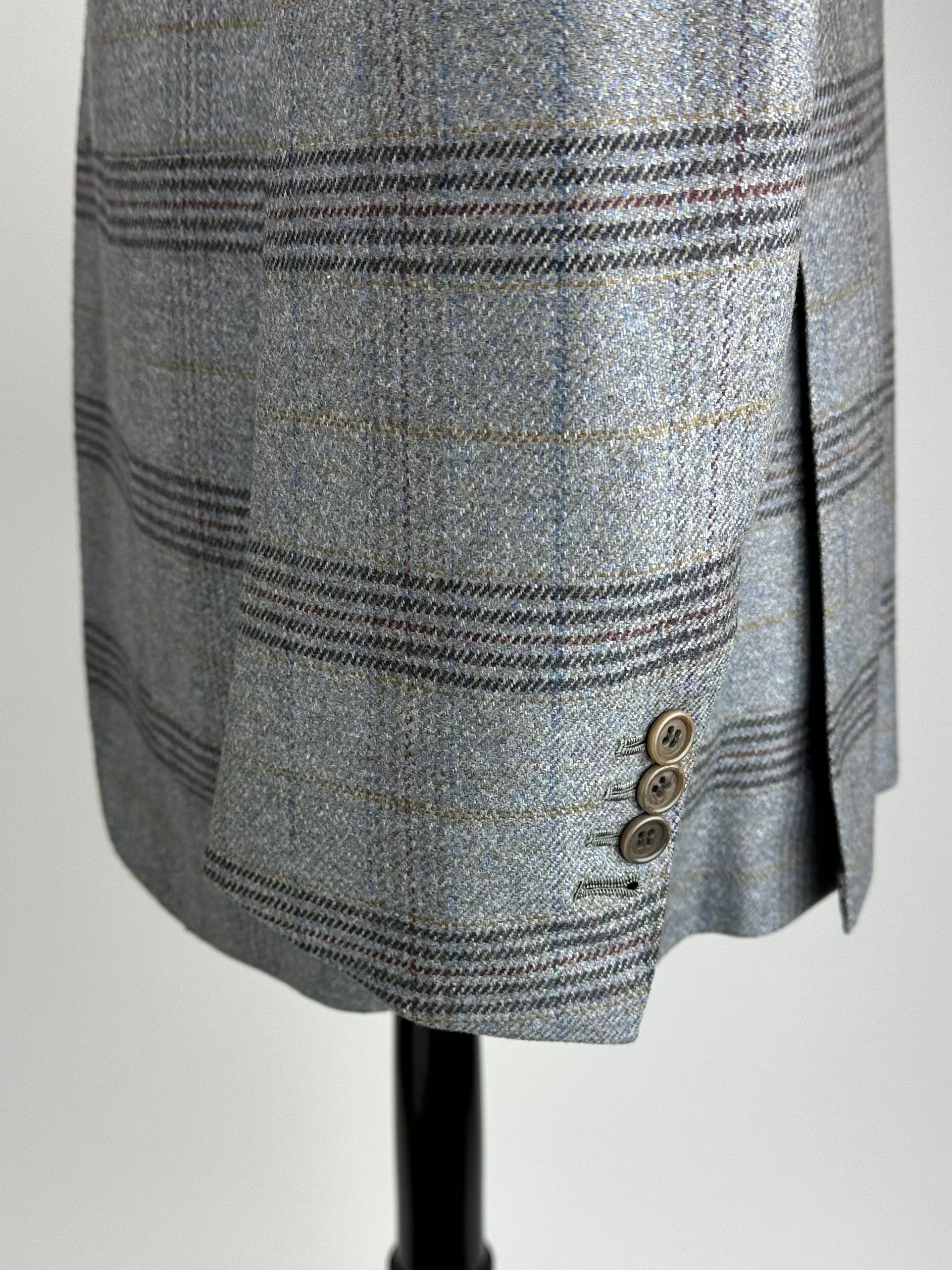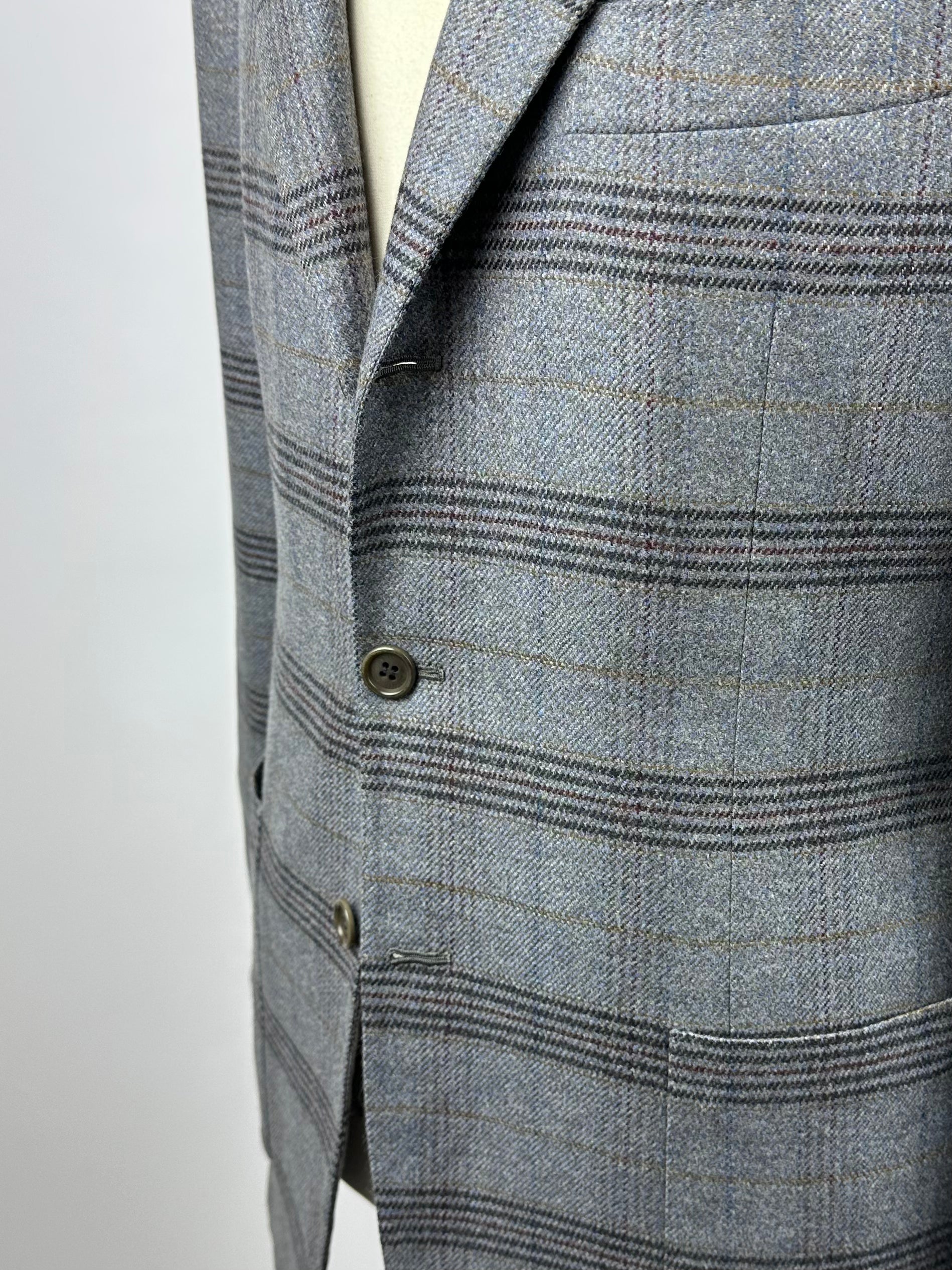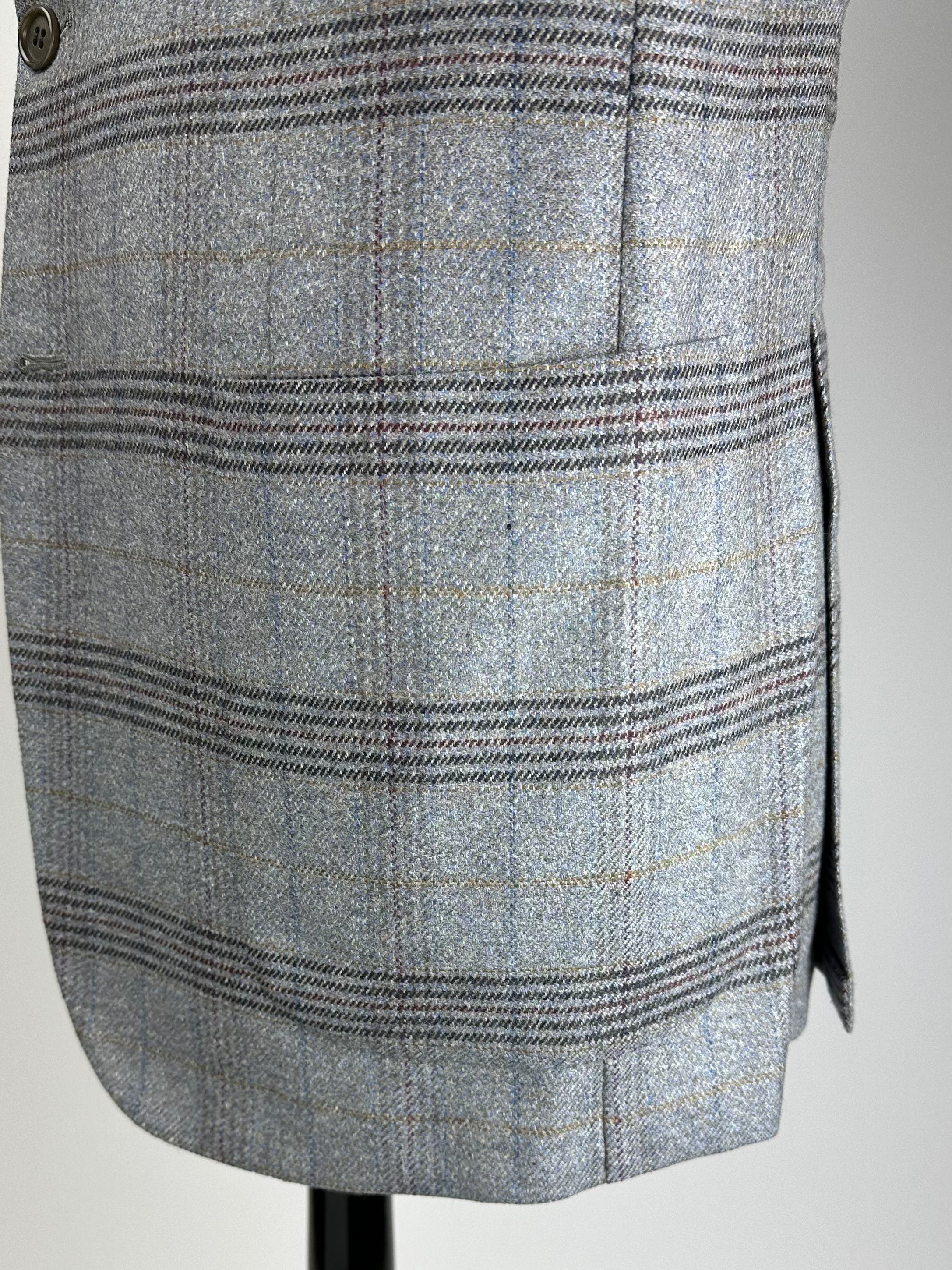 Handmade jacket in a glen plaid check pattern with a multicolor windowpane, which makes it unique. Notch lapels, fully lined, expertly constructed from a luxury wool & cashmere blend with double side vents at the back and two-button closure to keep the profile neat. The peak lapels and welted chest pocket are undeniably classic. Discover the elaborated sartorial details below.