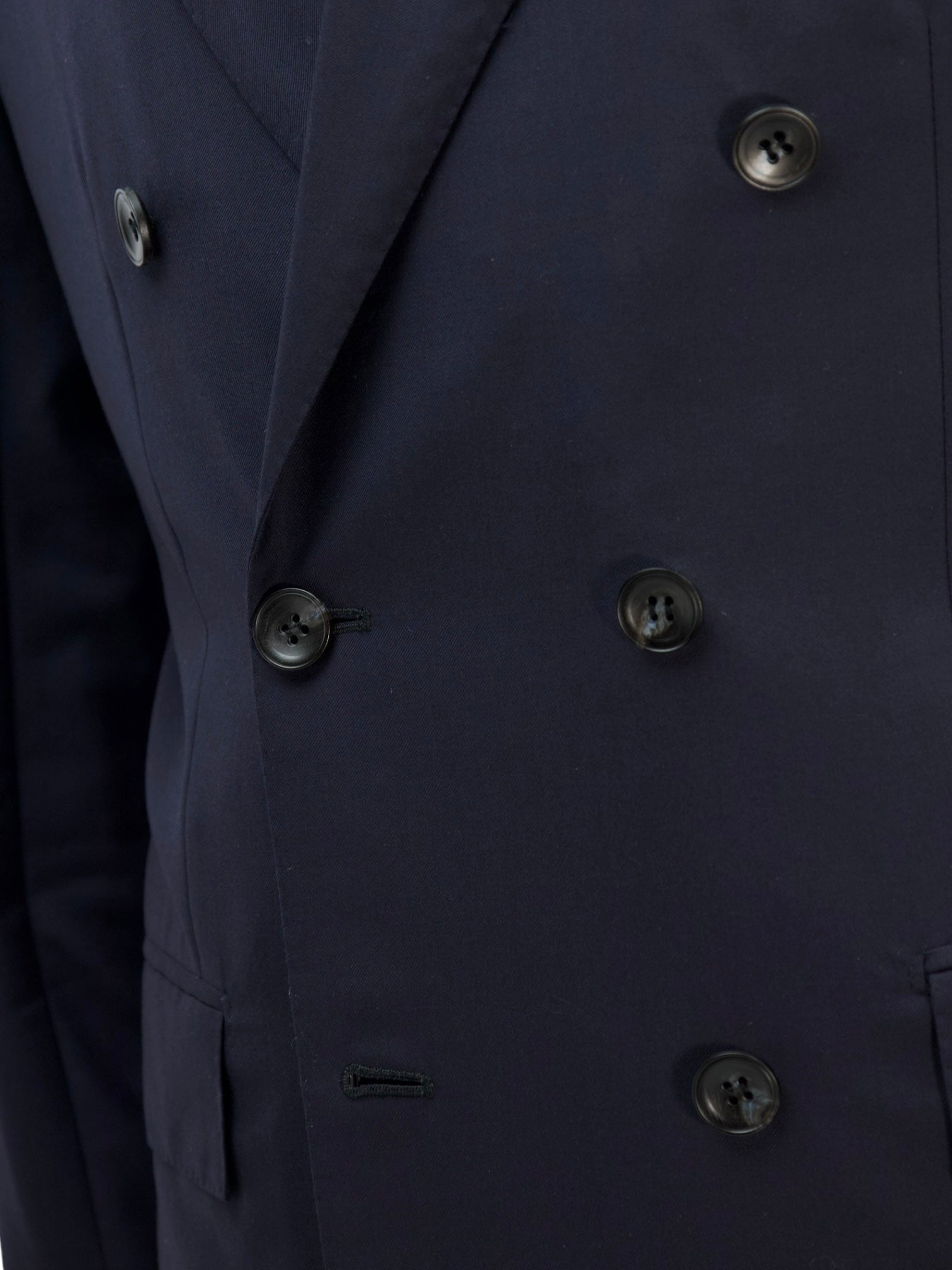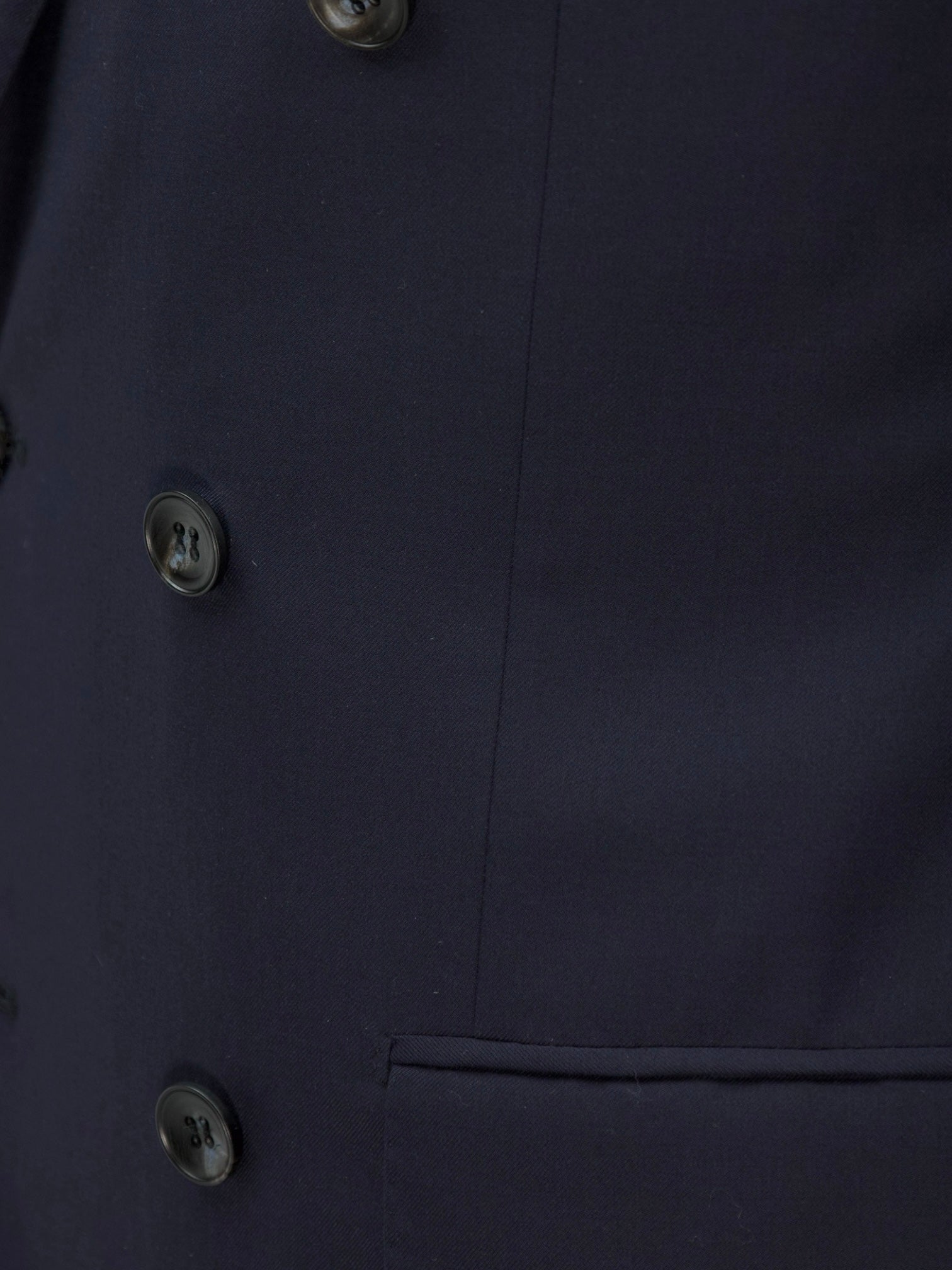 The classic navy hue is complemented by the double-breasted design, which features broad peak lapels and a refined silhouette, exuding both authority and elegance. The meticulous construction of this jacket ensures a flawless fit that enhances the wearer's profile.