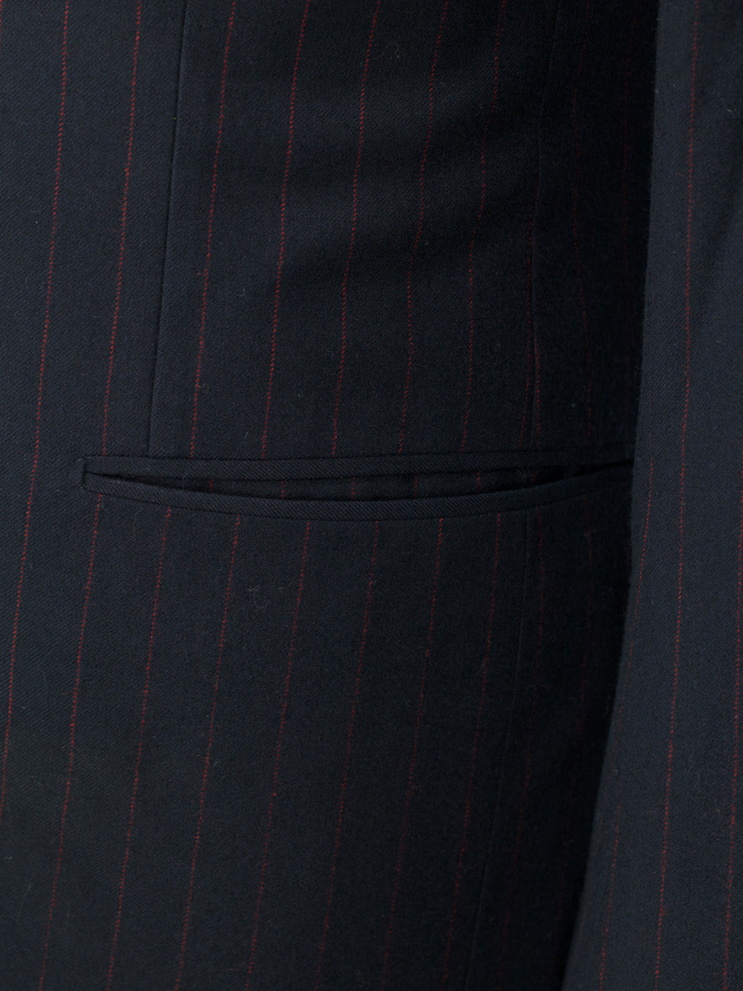 The first jacket pockets were sewn inside the lining or seams of garments, and are called “jetted” pockets. In their simplest form, they consist of little more than a slit. Suits that are the most formal, especially tuxedos, have no flap pockets altogether to give the piece a more streamlined look.