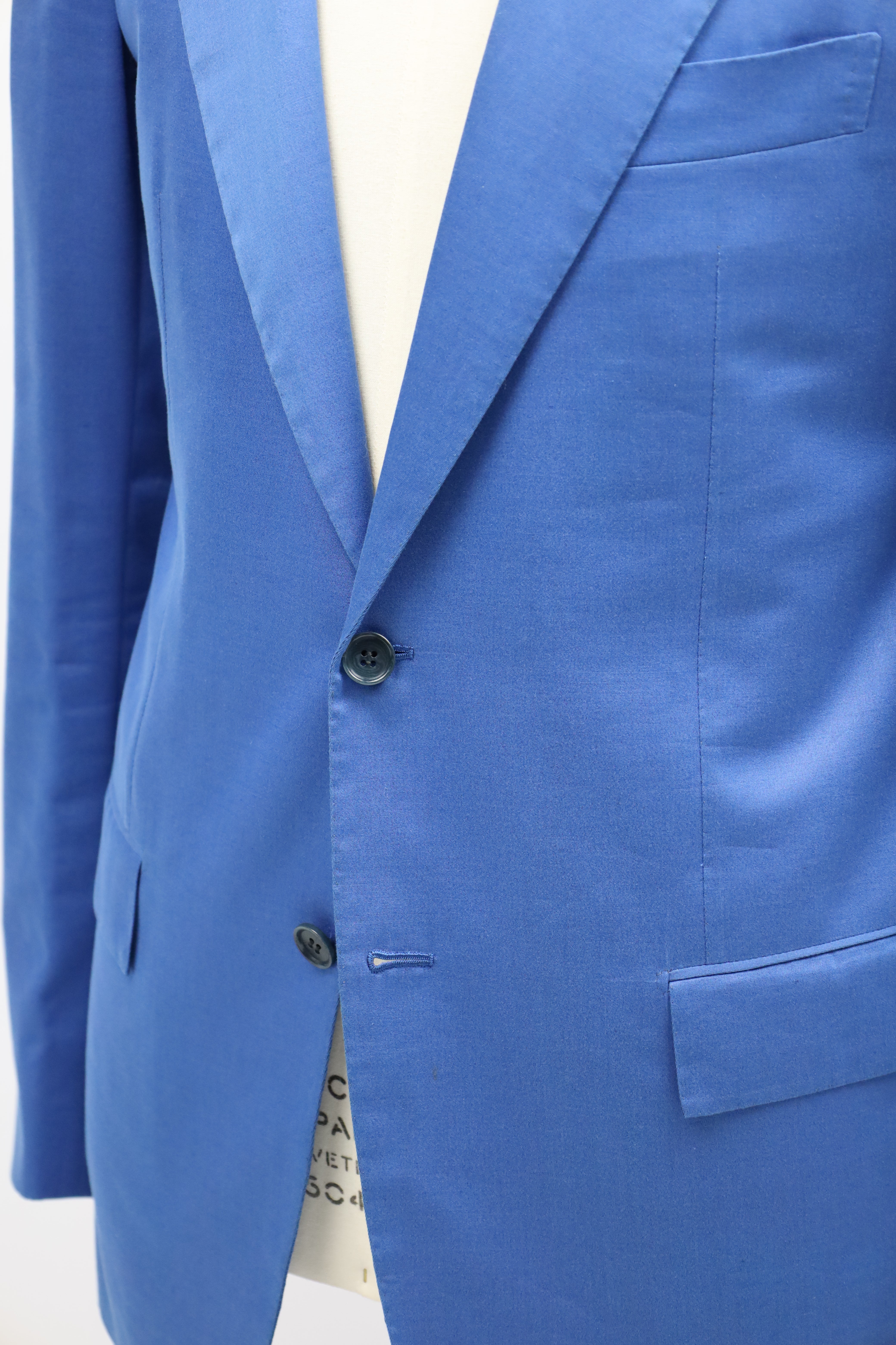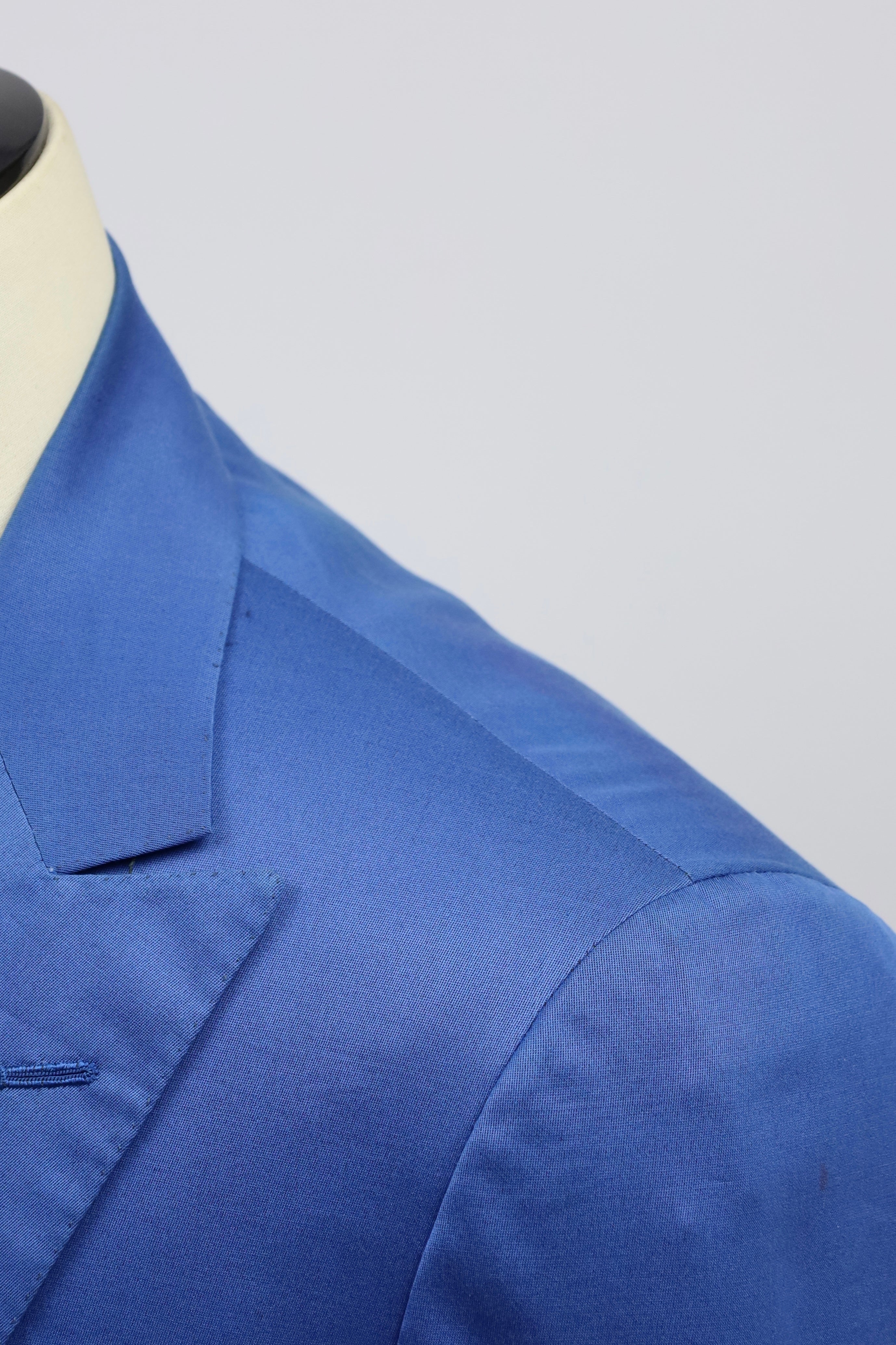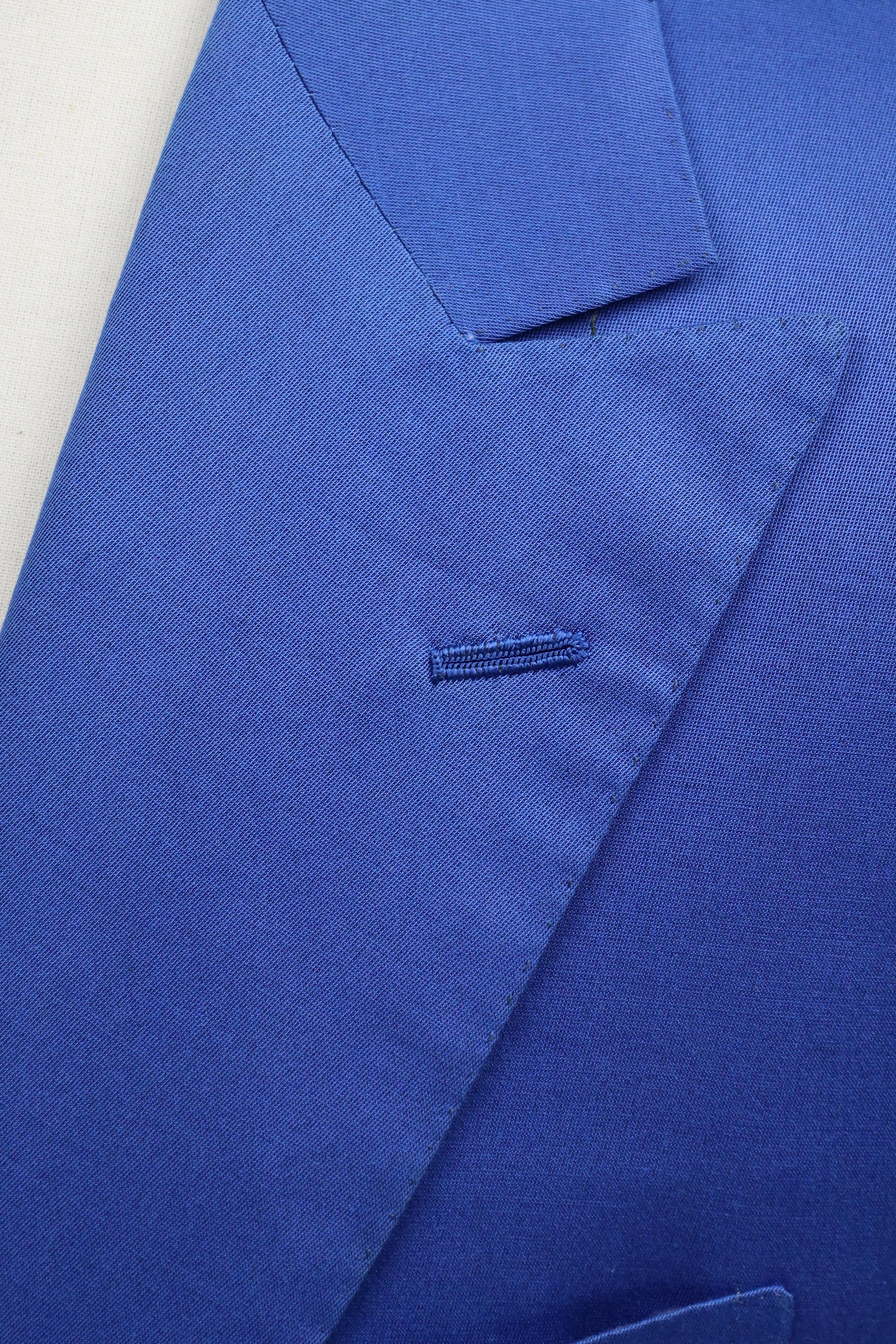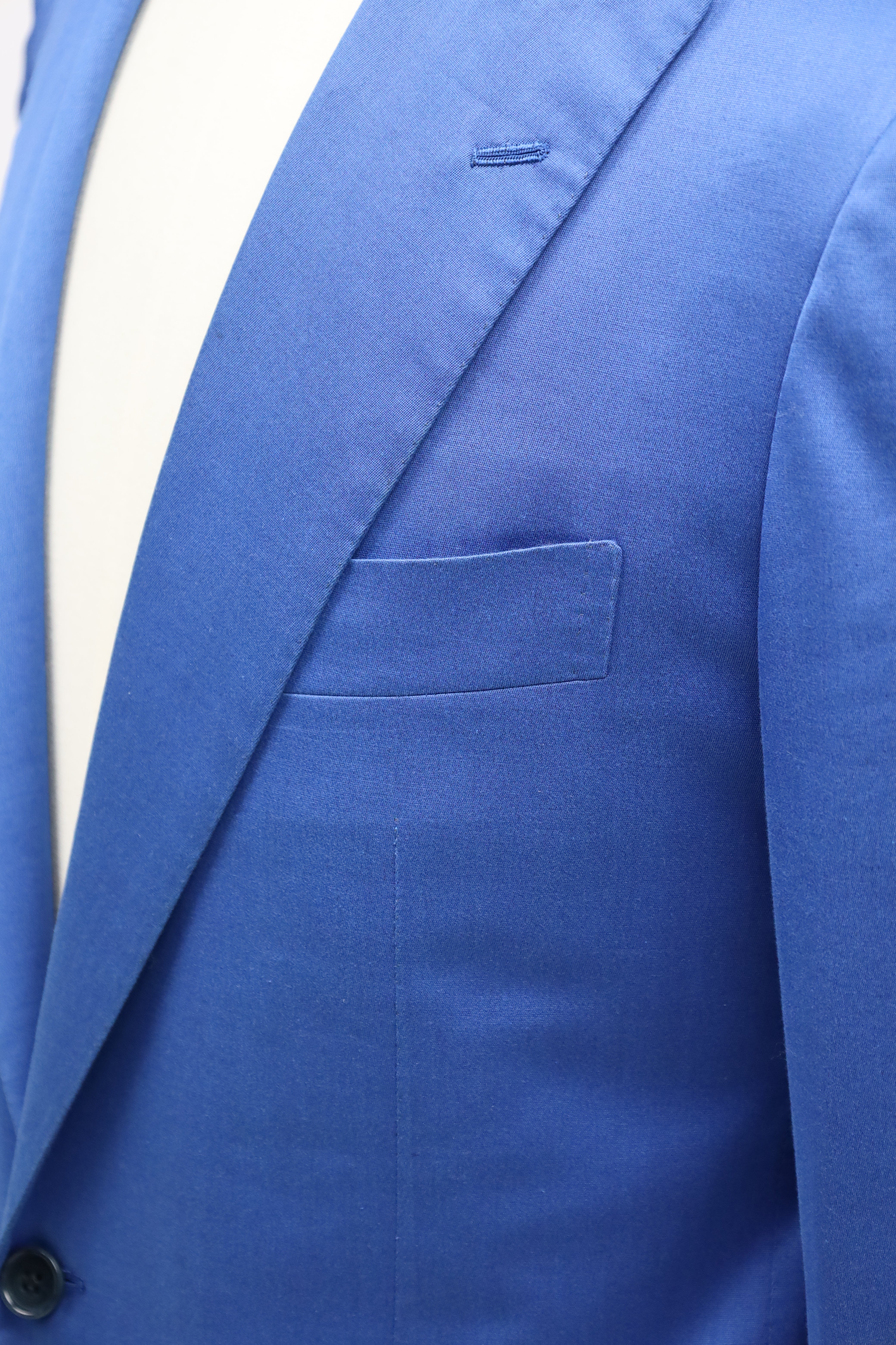 Handmade jacket in a plain pattern. Peak lapels, fully lined, expertly constructed from a shiny cotton, cashmere and silk blend with double side vents at the back and 2-button closure. The peak lapels and welted chest pocket are undeniably classic. Discover the elaborated sartorial details below.