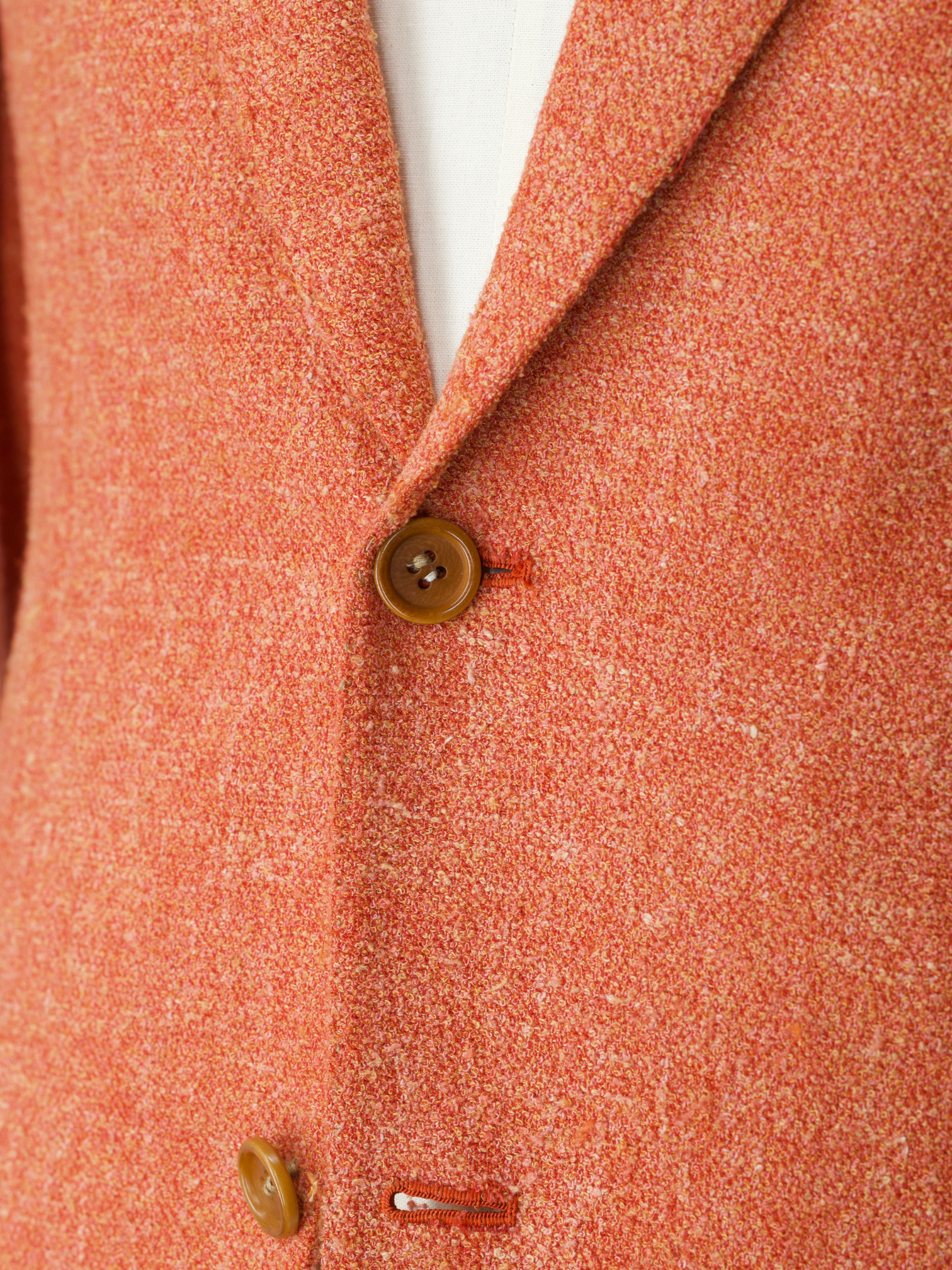 Handmade buttonholes are made using a chain of knotted loops called purl stitches that make them strong and visually distinctive. It takes about five seconds to sew a regular buttonhole with a machine – a single handmade buttonhole takes about 10 minutes to sew.