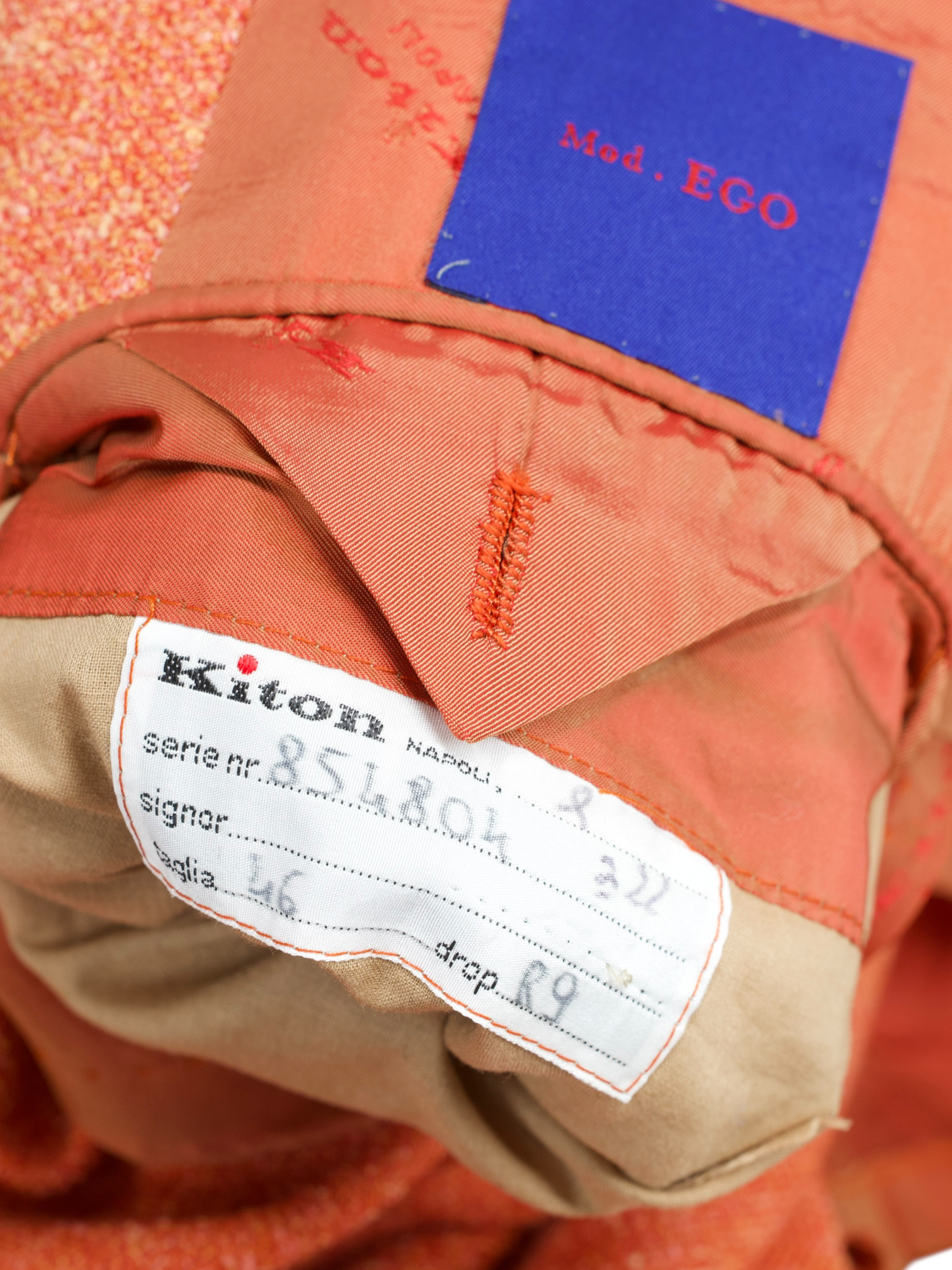 The Mod. Ego designation is used for Kiton’s more modern, trimmer interpretation of the Neapolitan jacket. In practical terms, it tends to sit closer through the chest and shoulders, with a cleaner waist and a slightly sharper overall outline than the roomier, more traditional cuts in the range. It is not about squeezing you into something skinny, but about taking the brand’s trademark softness and giving it a more contemporary line, especially flattering in lighter, more textured cloths like this cashmere and silk and linen mix with a touch of stretch. The fully lined build also matters here: it helps the jacket hold its shape and keeps the fit looking intentional, even when the fabric itself is chosen for comfort and ease. Discover the elaborated sartorial details below.