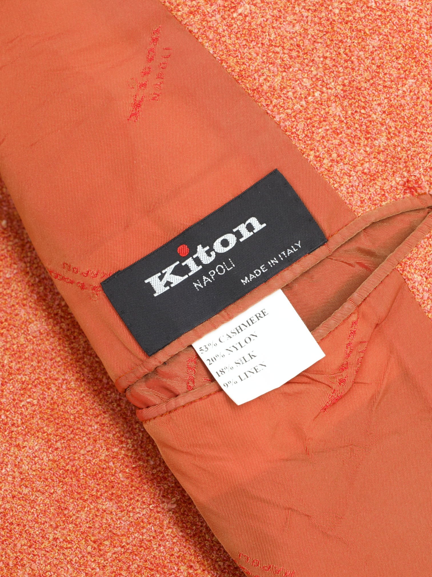 Discover the Kiton Orange Cashmere, Stretch, Silk and Linen Speckled Mod. Ego Jacket, a rare kind of statement piece that still plays nicely with the rest of a serious wardrobe. The colour sits in that confident burnt orange territory, lifted by a speckled mélange that keeps it textured rather than loud. It is tailored with classic notch lapels and patch pockets, then fully lined to give the cloth a clean fall and a bit more authority than the typical summer blend. Think of it as the jacket you reach for when navy feels predictable, but you still want to look like you know exactly what you are doing.
