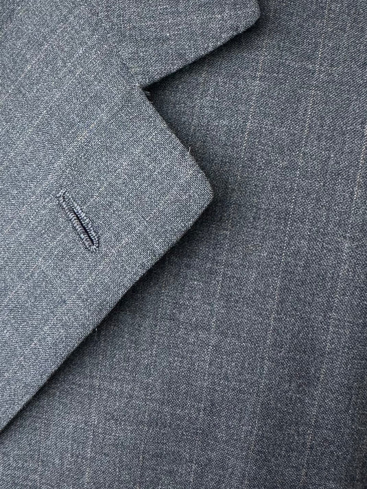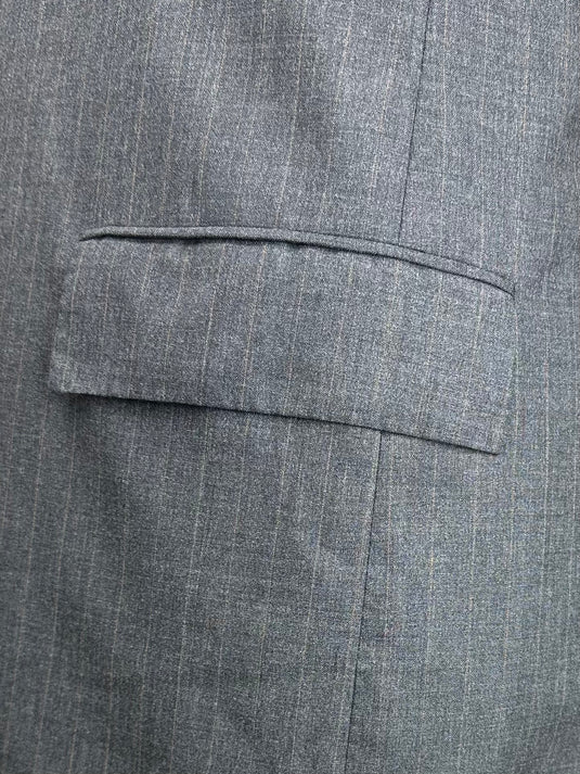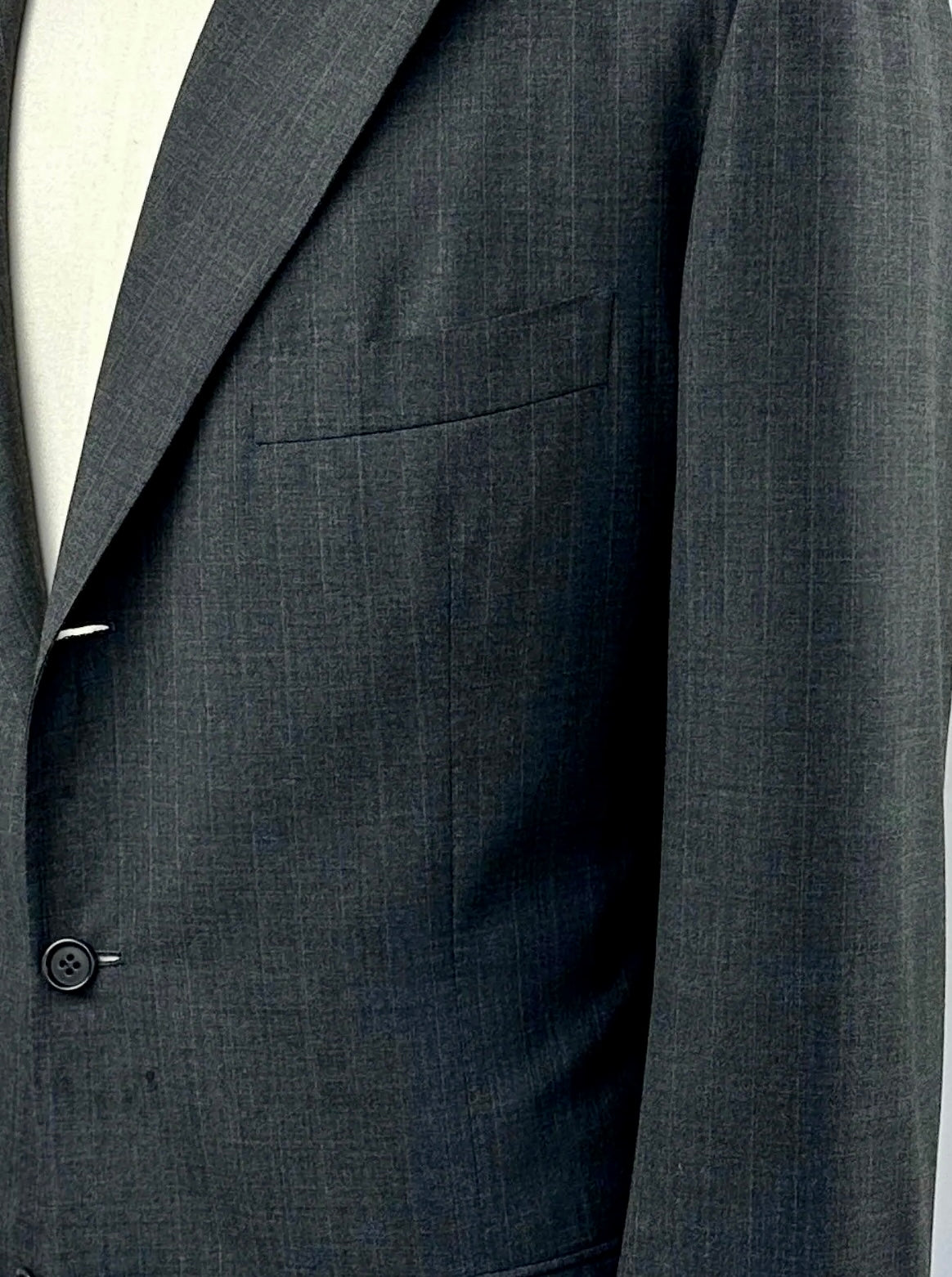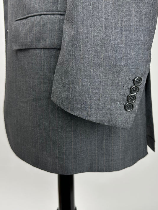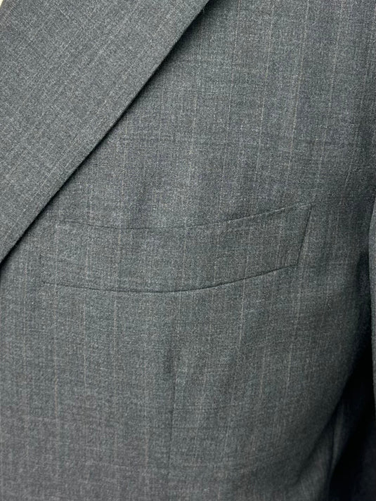 Grey single-breasted jacket in soft, extra fine virgin wool with a light brown pinstripe pattern. Discover the elaborated sartorial details below.