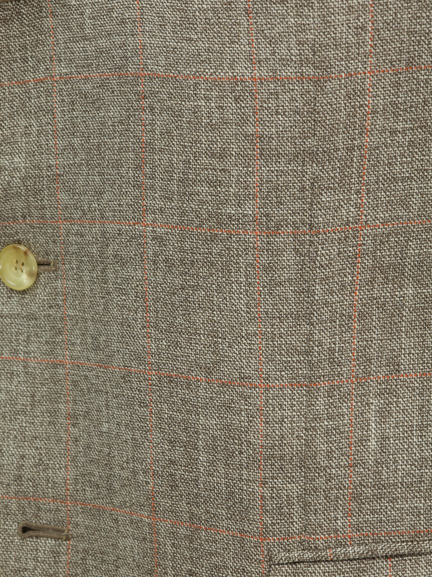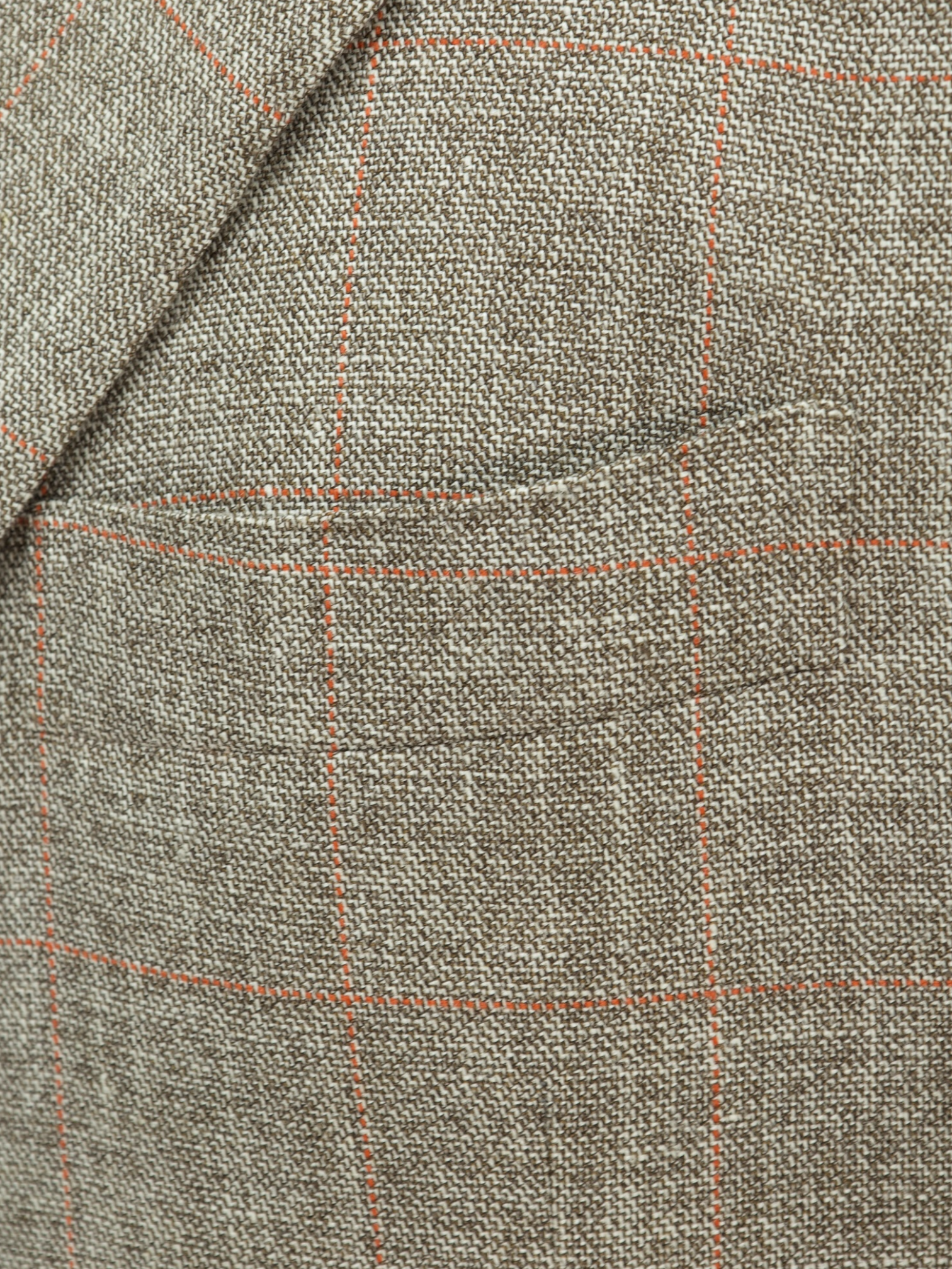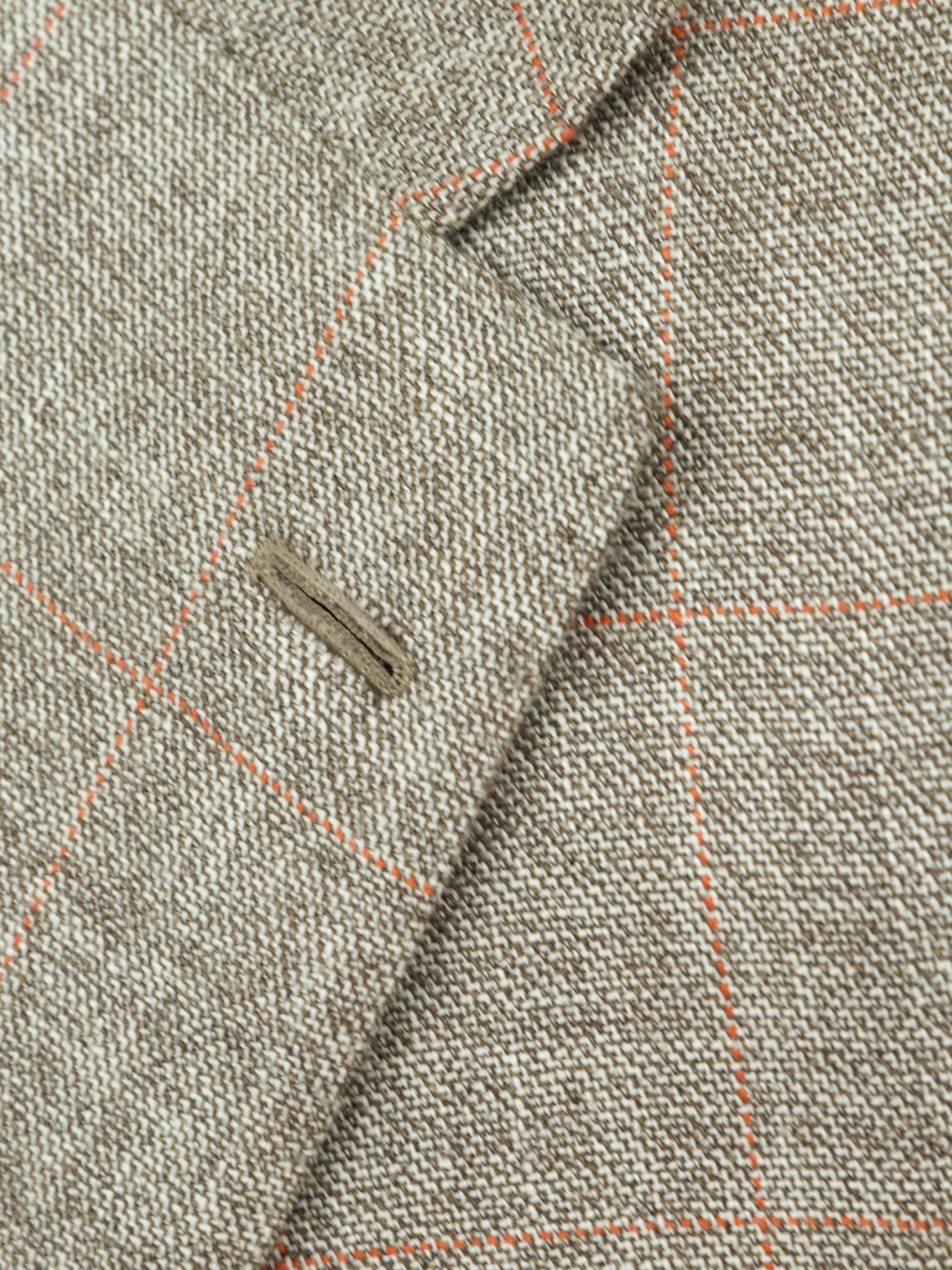 Discover the Kiton Taupe Cashmere, Linen & Silk Windowpane Jacket, an epitome of summer elegance and luxury. This half-lined jacket combines the softness of cashmere, the breathability of linen, and the smoothness of silk, making it an ideal choice for warm weather. The sophisticated taupe fabric is adorned with a burnt orange windowpane pattern that complements the matching orange lining, adding a subtle yet striking detail.