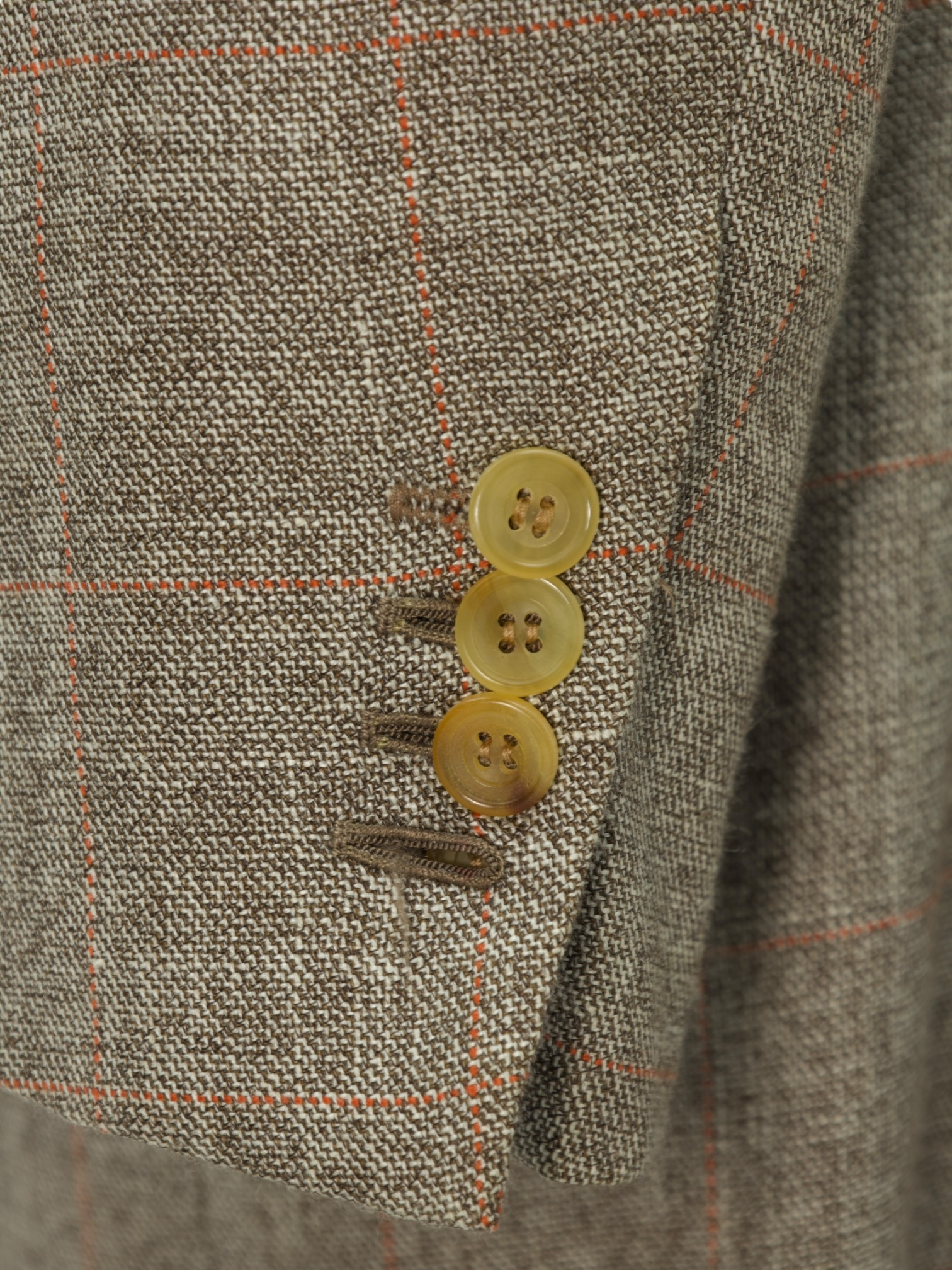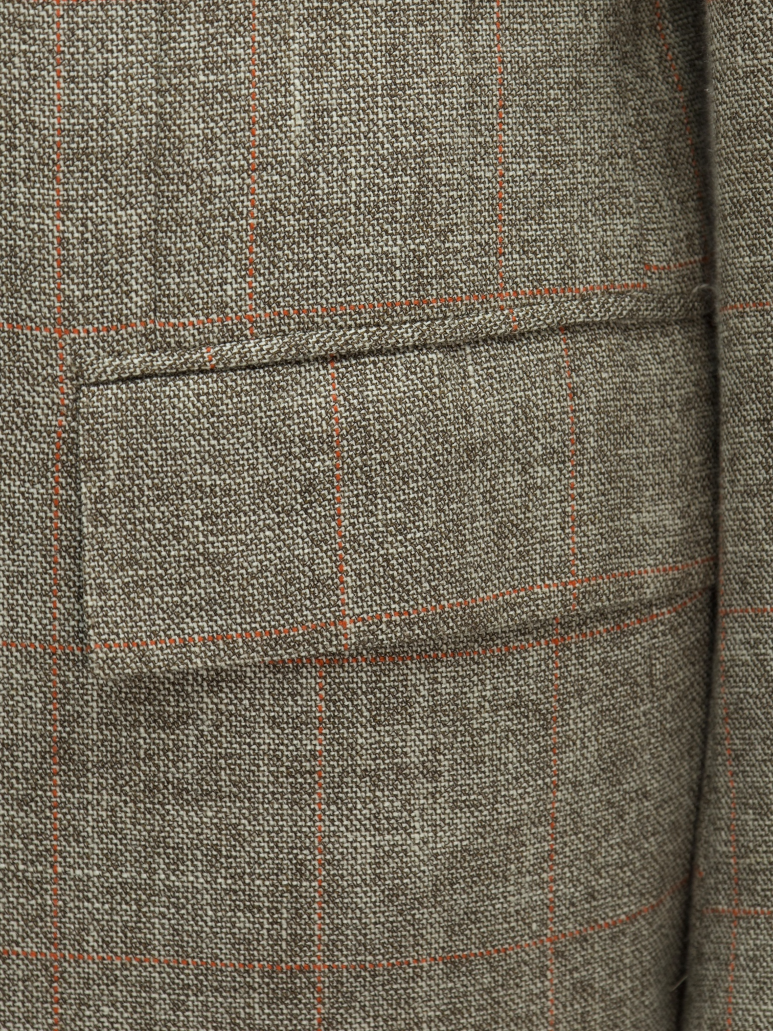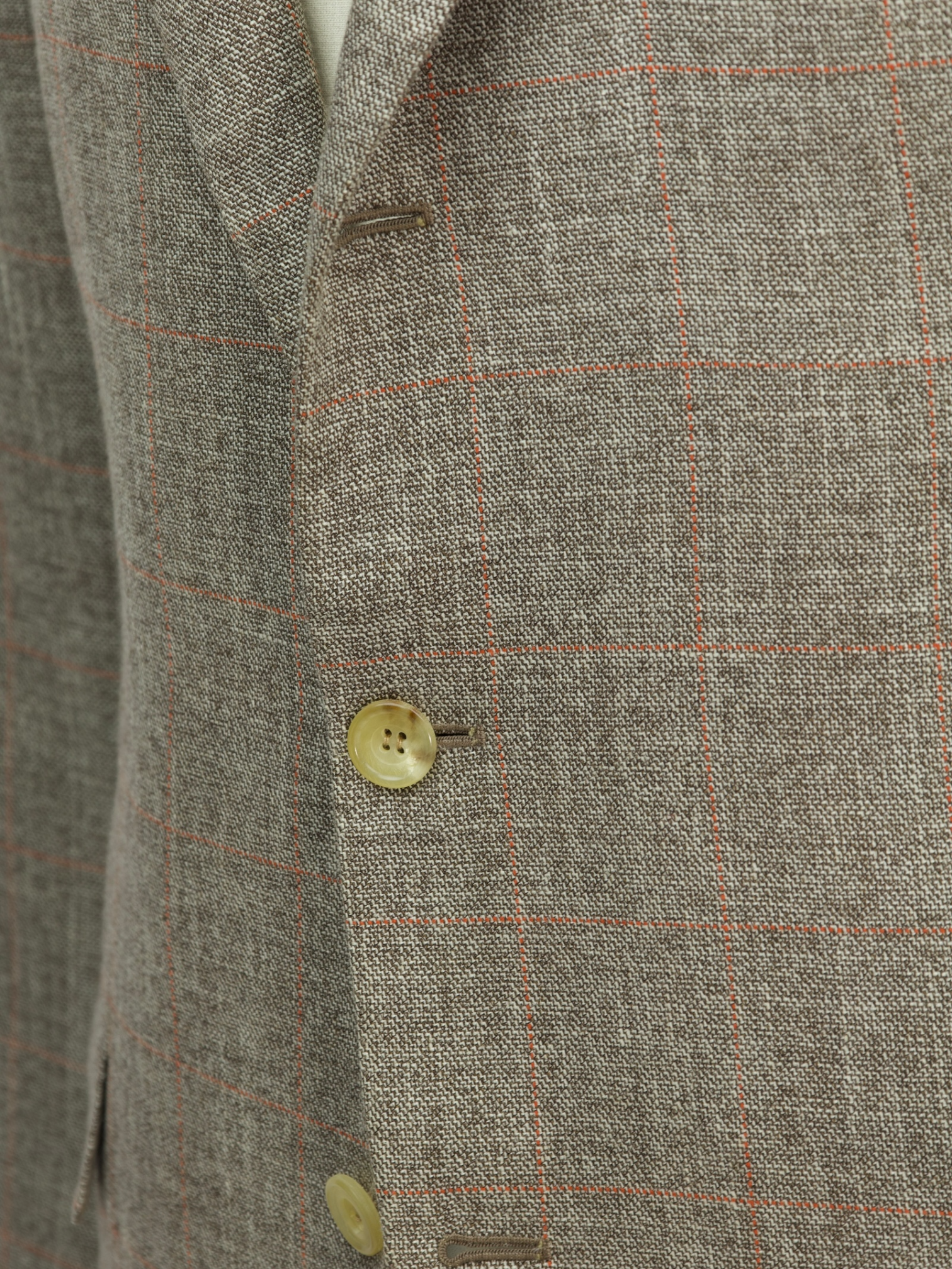 Discover the Kiton Taupe Cashmere, Linen & Silk Windowpane Jacket, an epitome of summer elegance and luxury. This half-lined jacket combines the softness of cashmere, the breathability of linen, and the smoothness of silk, making it an ideal choice for warm weather. The sophisticated taupe fabric is adorned with a burnt orange windowpane pattern that complements the matching orange lining, adding a subtle yet striking detail.