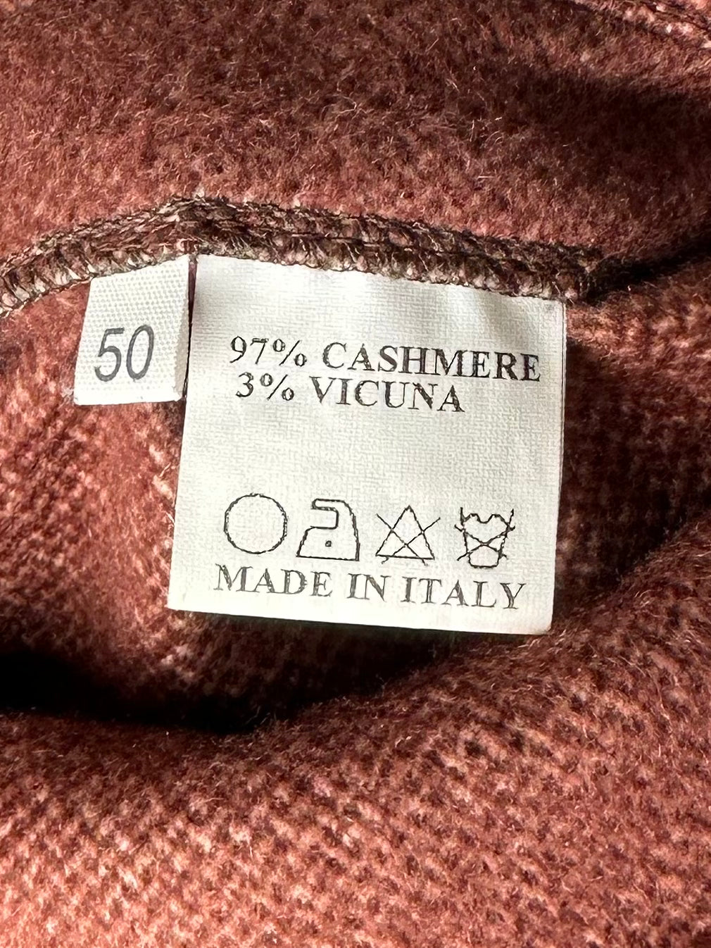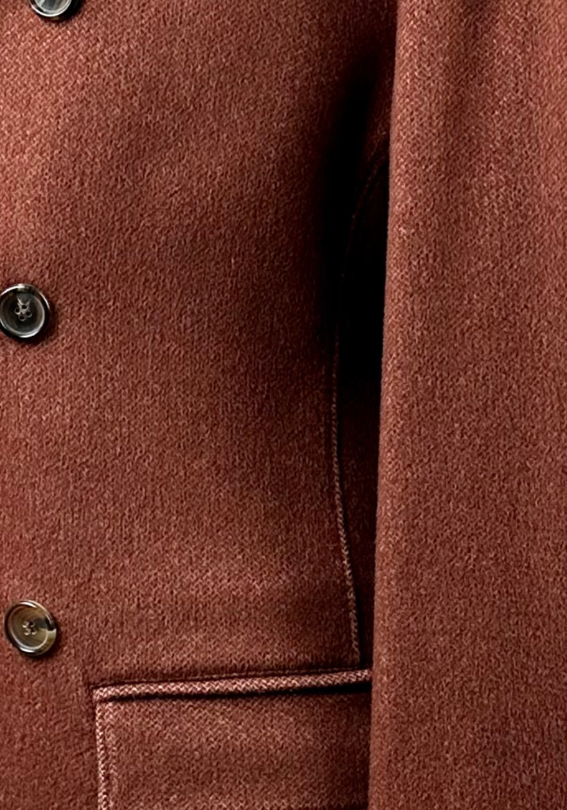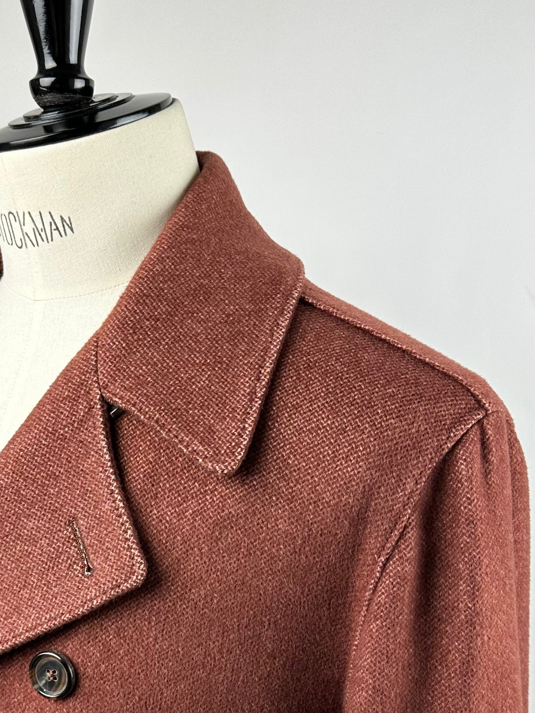 Without a doubt one of the most exclusive coats in the world. This timeless brick red, double-breasted overcoat is cut from a luxurious cashmere and vicuña blend, left unconstructed for ultimate comfort. Discover the elaborated sartorial details below.