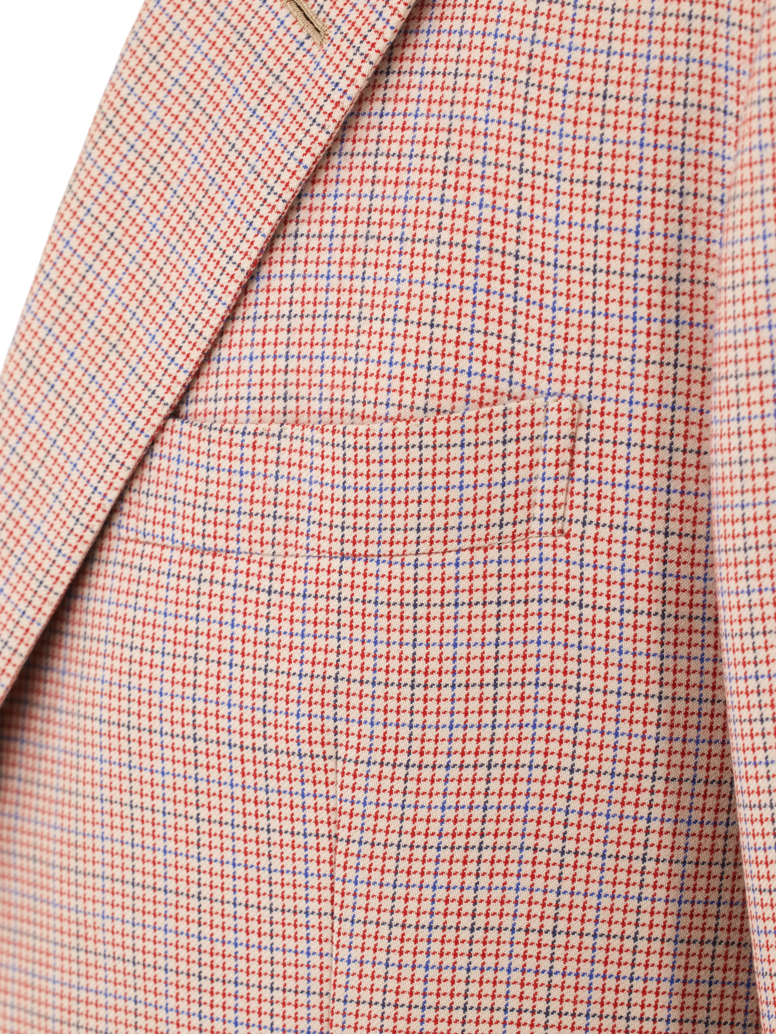 Discover the bold refinement of this vintage Kiton jacket, tailored in pure cashmere with a striking red and blue micro-check that reveals remarkable depth and richness upon closer inspection. The fabric is exceptionally soft, with a warm yet breathable handle that makes it ideal for cooler seasons. Designed with notch lapels, a 2.5 button closure, and flap pockets, the silhouette is classic Kiton, elegant, softly structured, and unmistakably Neapolitan. A fully lined interior offers comfort and shape, while the micro-check pattern adds a touch of character without overwhelming the composition.