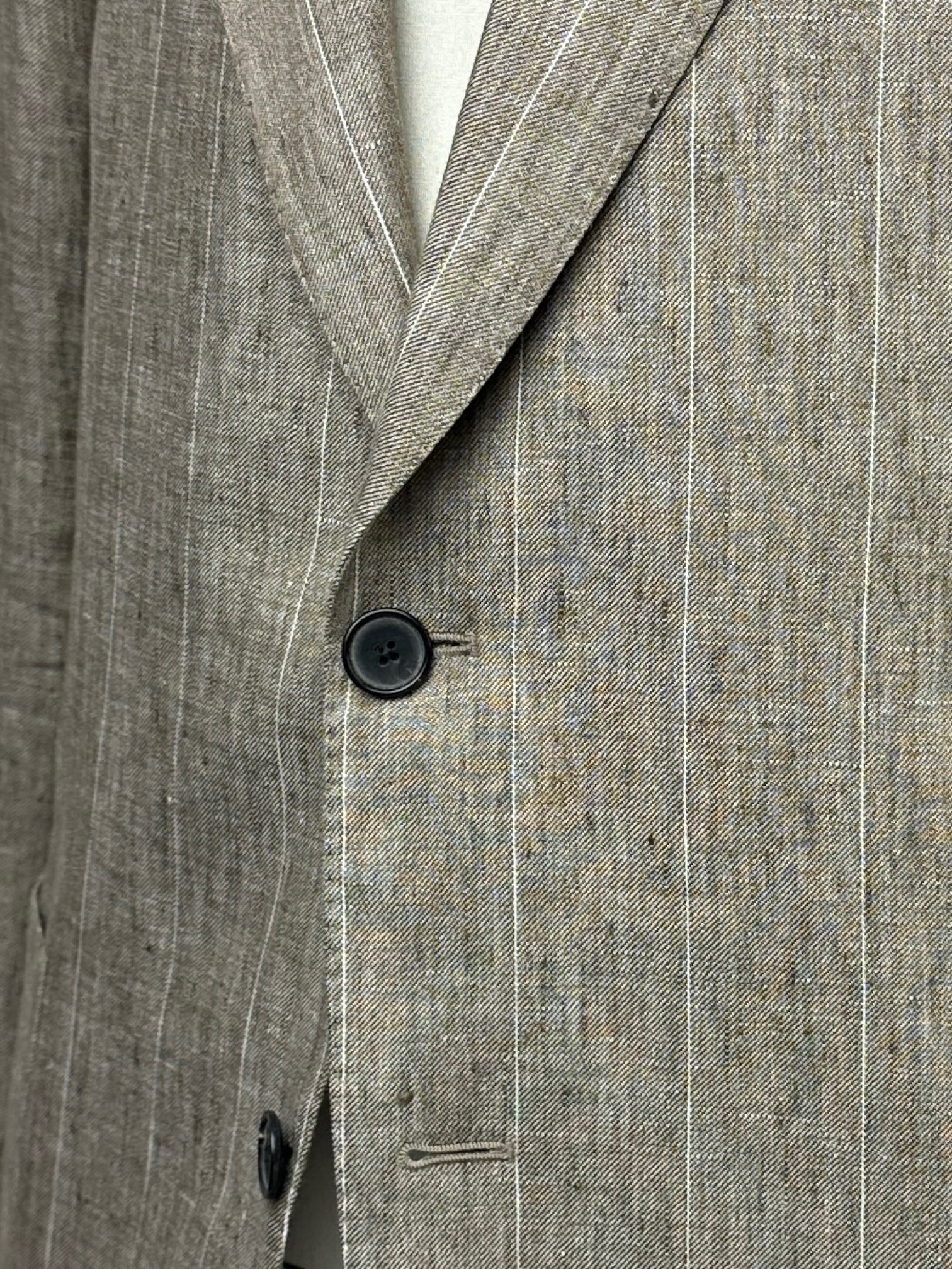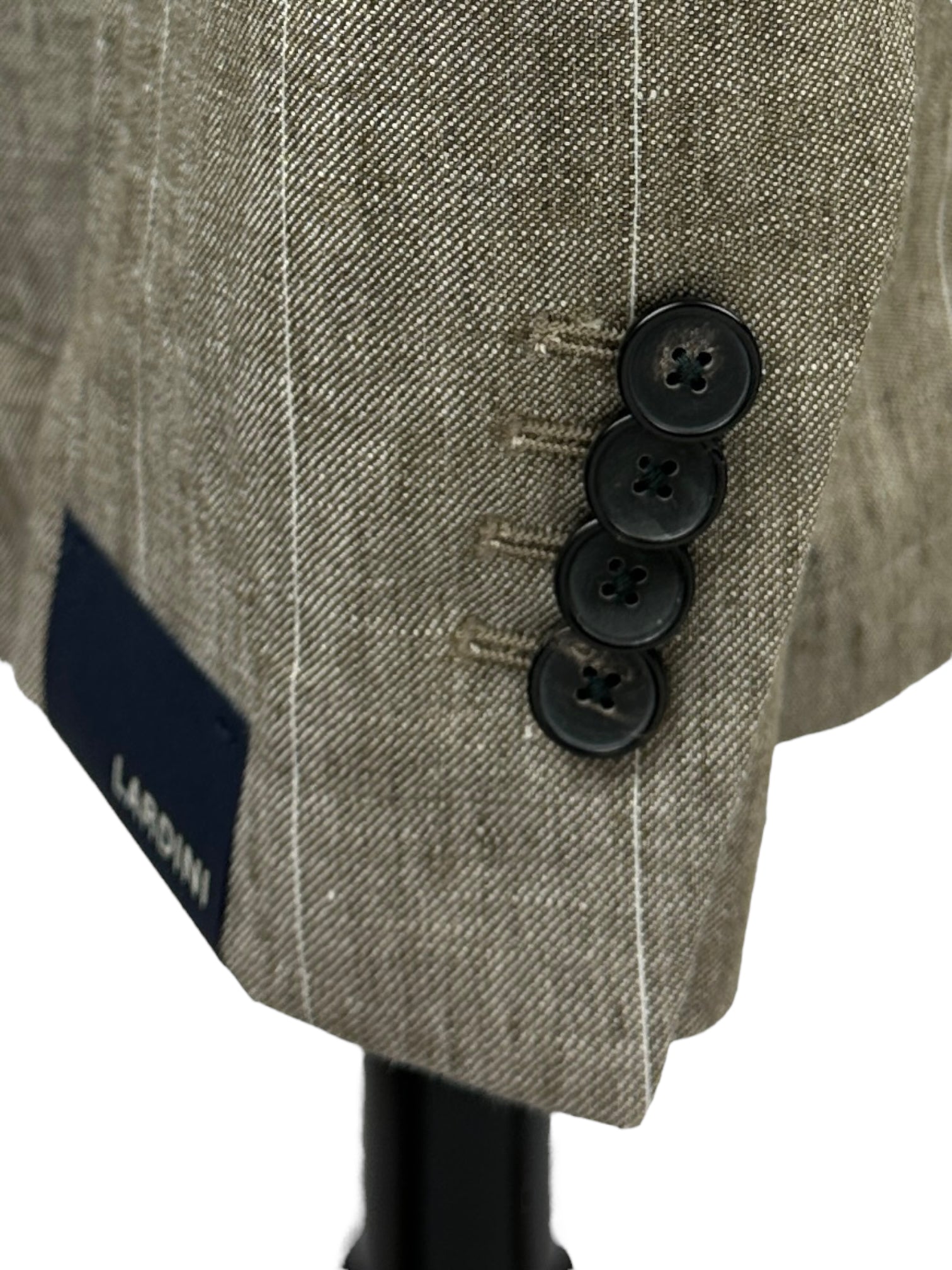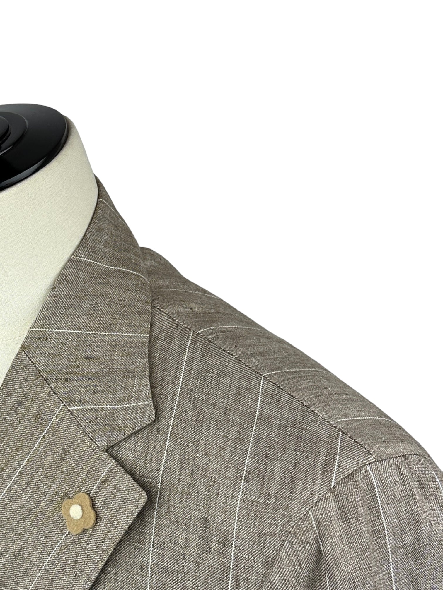 The Lardini Taupe Pinstripe Jacket, crafted from 100% linen, exudes a blend of casual elegance and sophisticated charm. This piece stands out as an embodiment of Lardini's commitment to quality and style, tailored for the modern gentleman who appreciates both comfort and sartorial excellence.