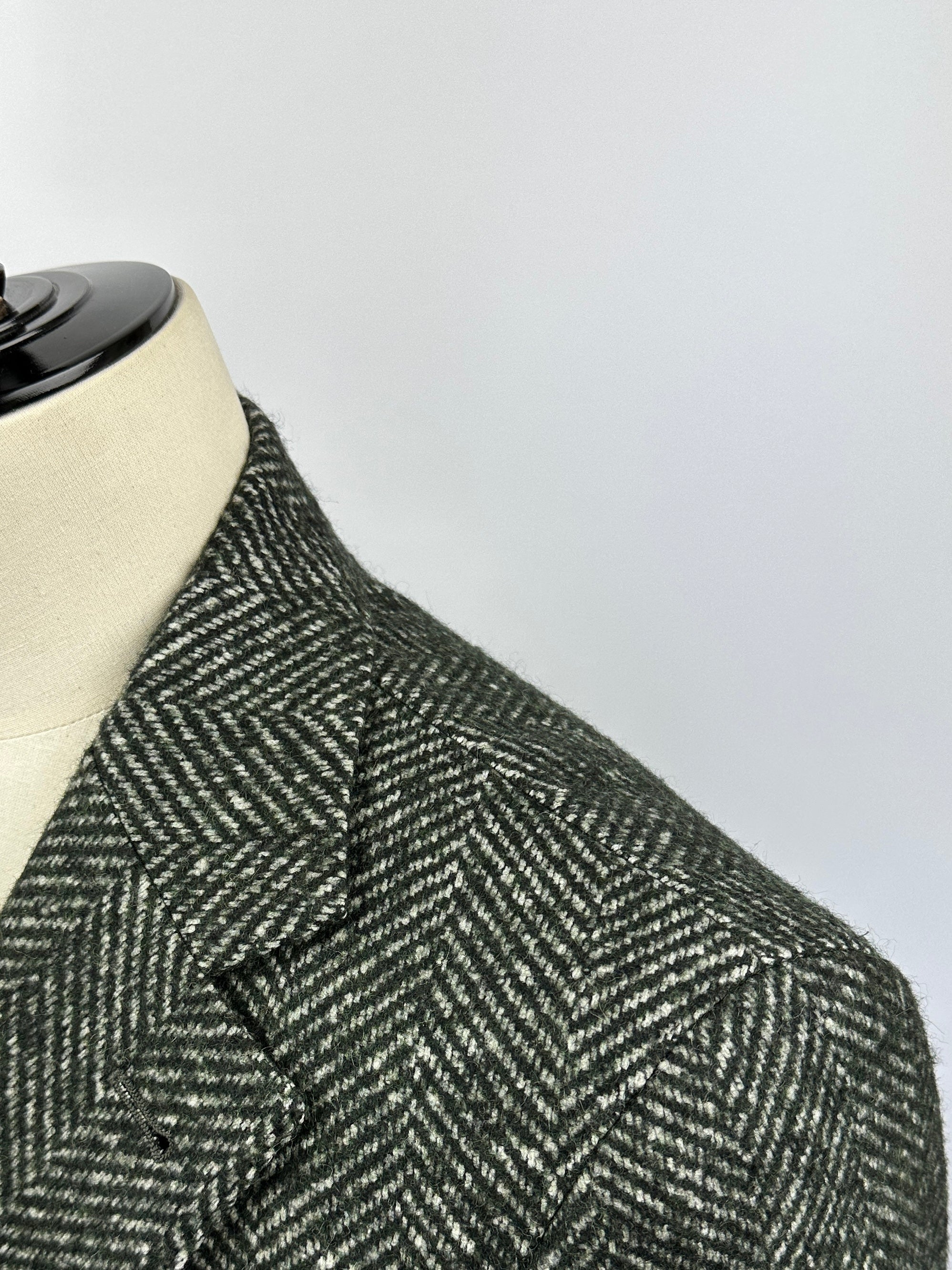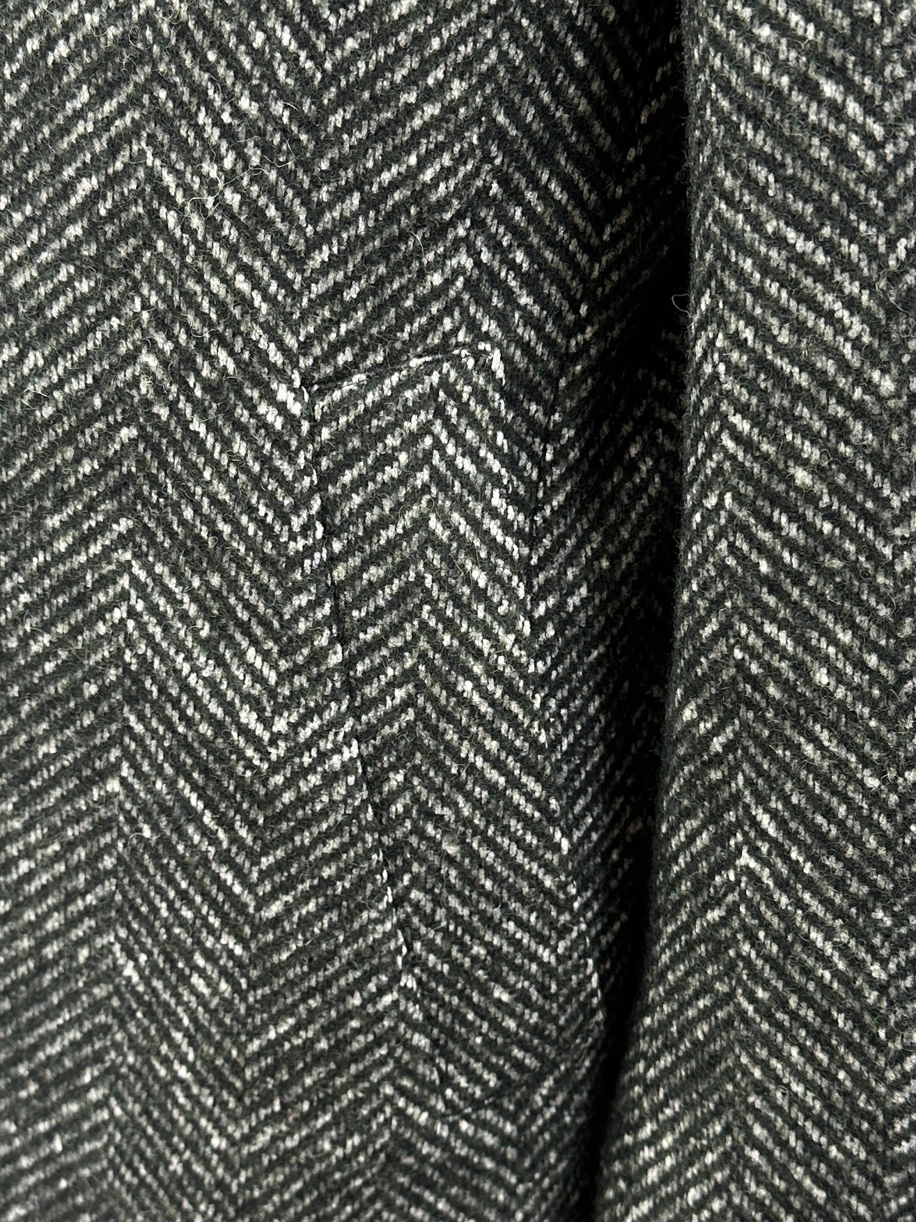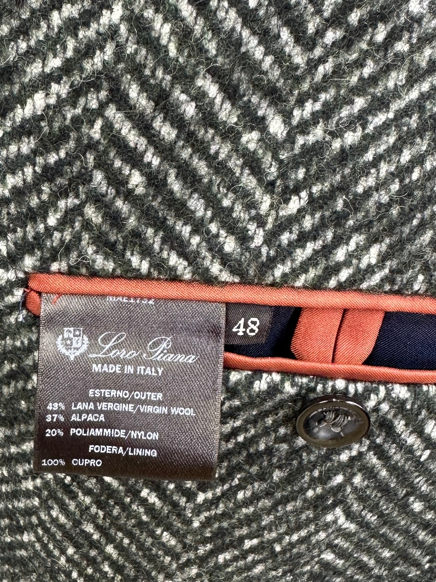 Green herringbone pattern overcoat cut from a soft wool, alpaca and polyamide blend - finished with their revolutionizing Rain System treatment. Loro Piana's groundbreaking PFC-Free Rain System® - is a water repellent treatment revolutionizing all their fabrics, even the non-laminated ones. It creates an invisible shield around each fiber, much like Teflon does for kitchenware, ensuring dust, dirt, and water-based stains are easily wiped away. Experience sharper, cleaner, and fresher clothing every day, while also enjoying enhanced durability, aligning with our core belief: a garment is meant to last a lifetime, not just a season.
