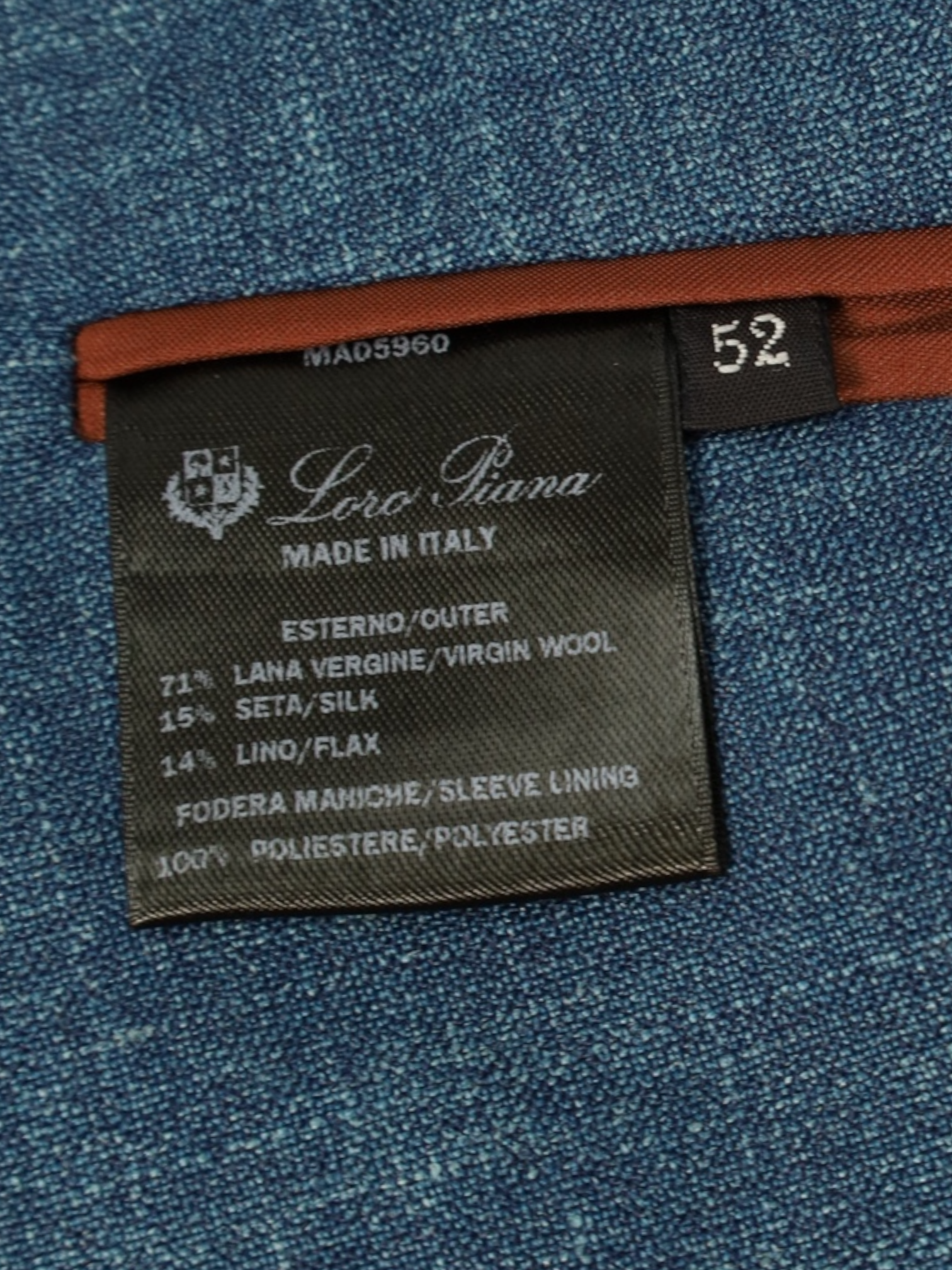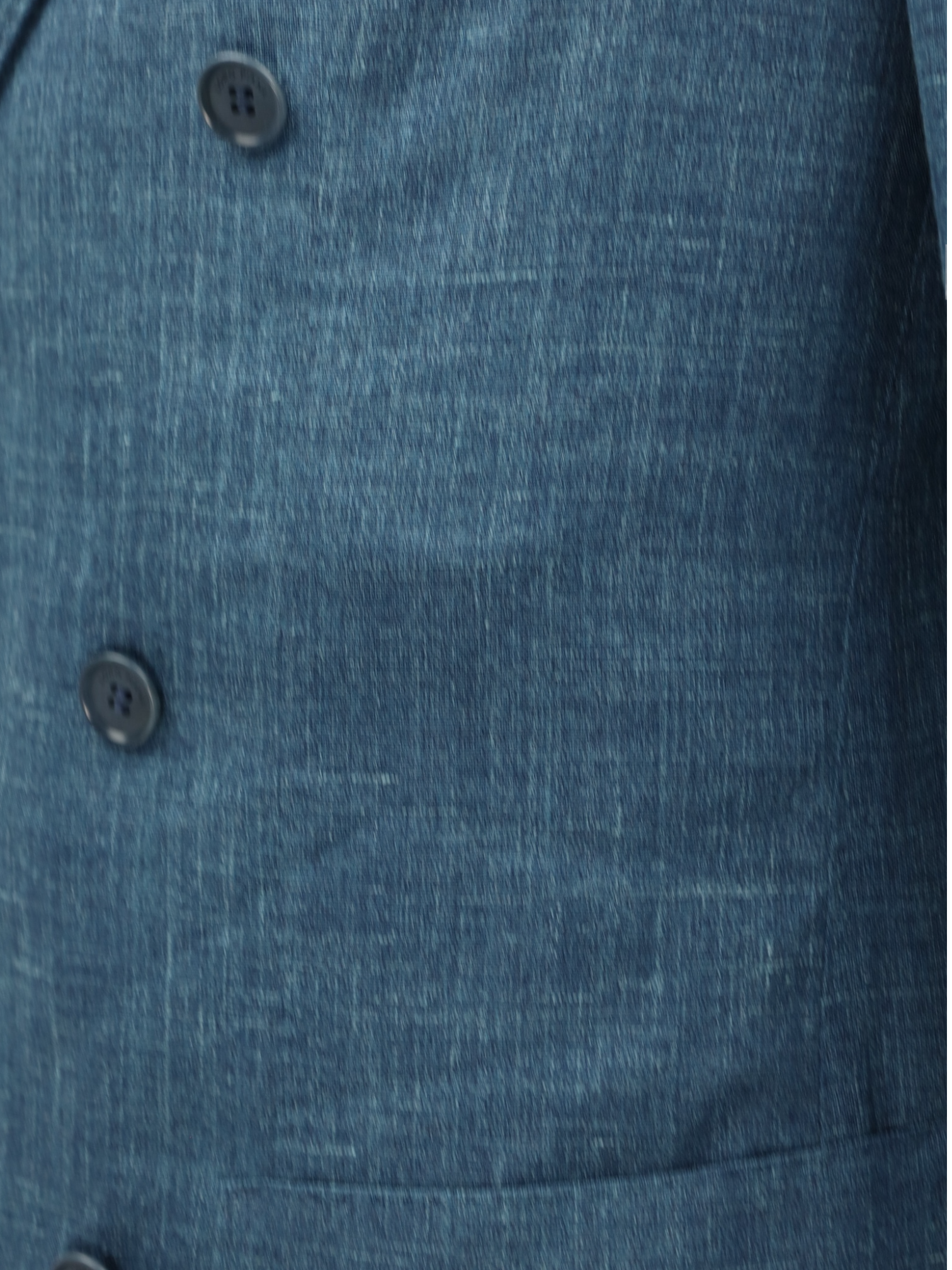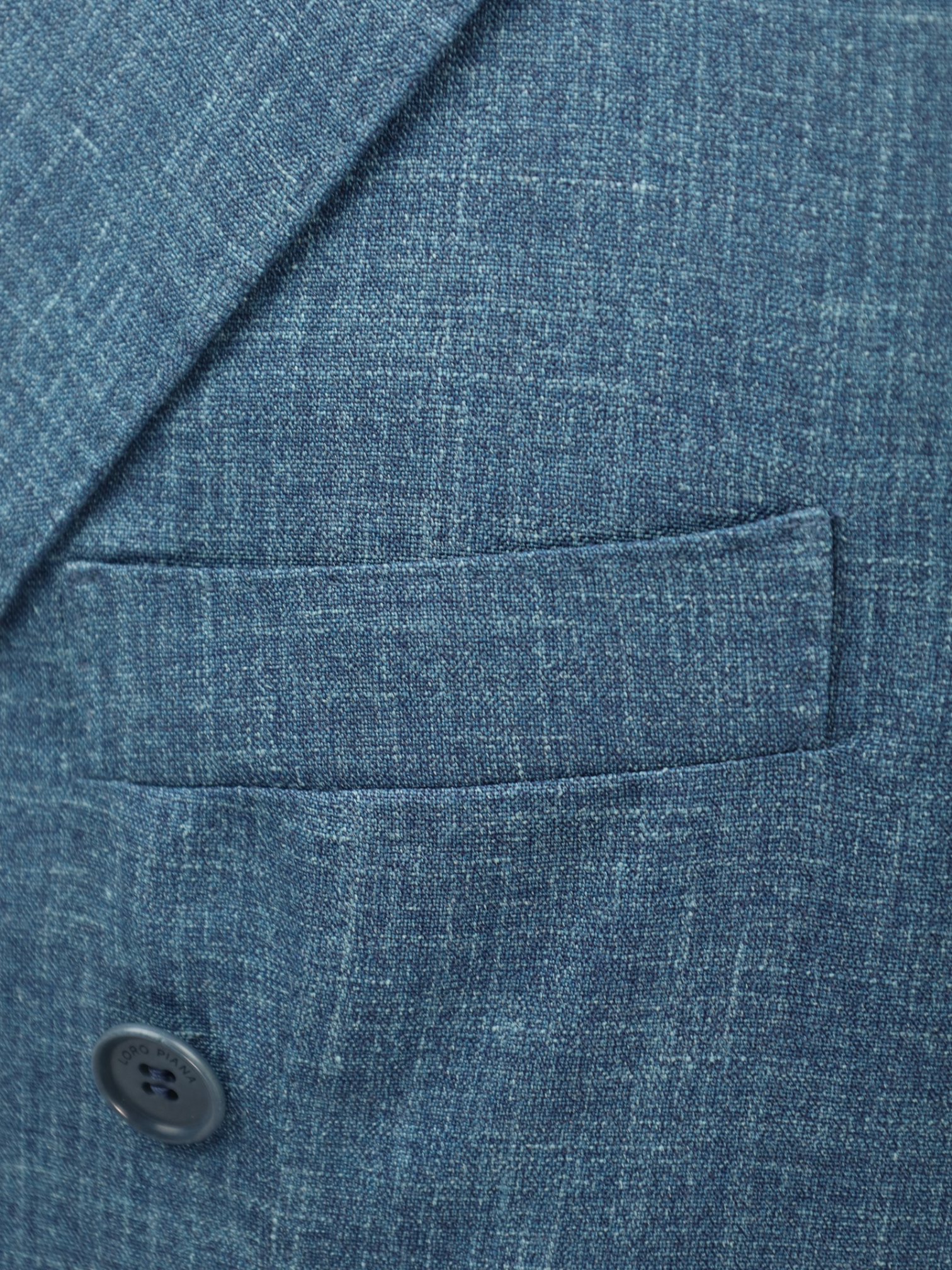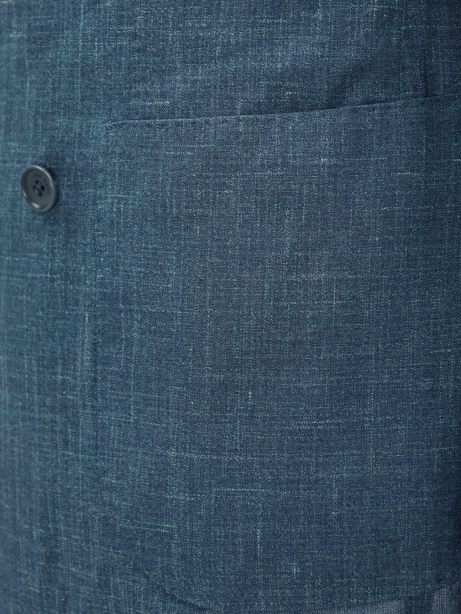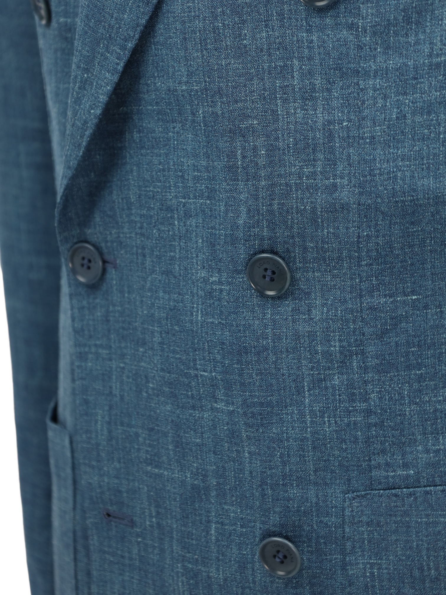 The Loro Piana Petrol Wool, Silk & Linen "Summertime" Double-Breasted Jacket combines style and functionality. Featuring peak lapels and crafted from a light, breathable blend of wool, silk, and linen, this jacket is perfect for summer events. Each piece is meticulously crafted by Loro Piana's skilled artisans, ensuring a perfect fit and elegant drape. Discover the elaborated sartorial details below.