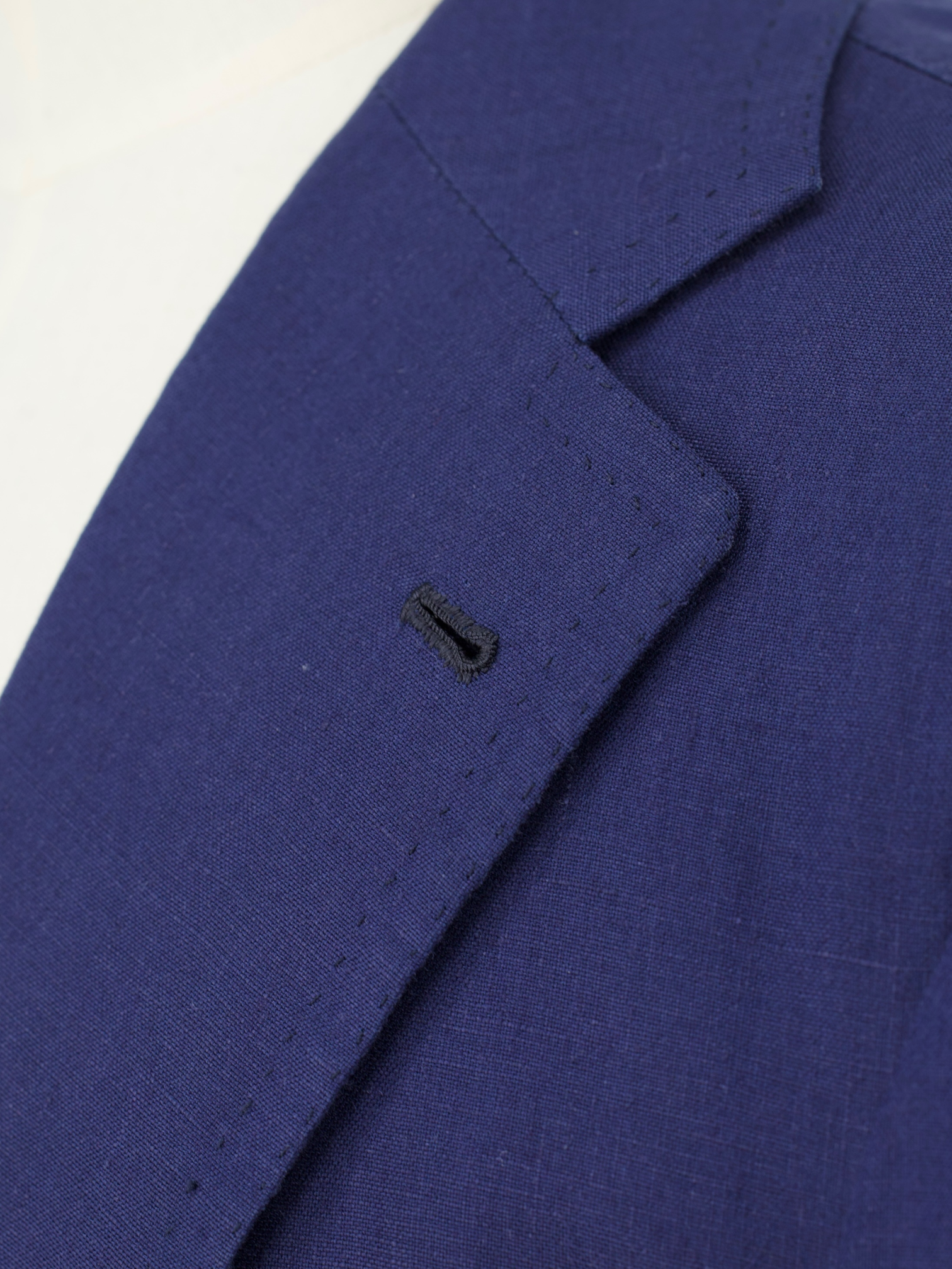 True to Orazio Luciano’s philosophy, this suit is crafted with a meticulous hand-finished approach that champions lightness and fluidity. The unlined or lightly lined construction, typical of the house, allows the linen to move naturally while maintaining a graceful silhouette shaped by soft internal canvassing. Every detail, from the hand-attached collar to the subtle pick stitching, reflects the brand’s deep roots in Naples, where artisanal tailoring is still a family affair. Discover the elaborated sartorial details below.