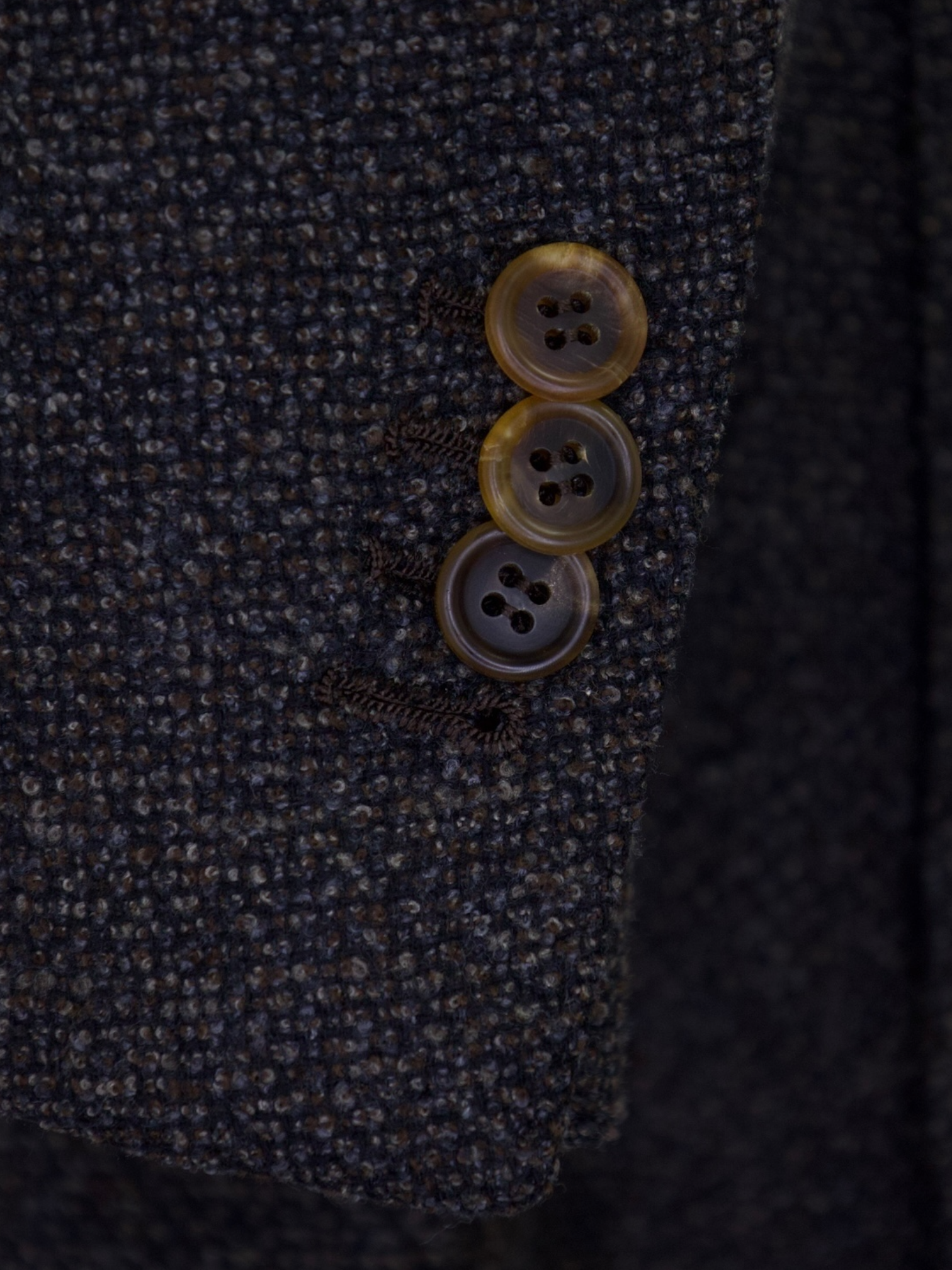 Also known as stacked buttons or waterfall buttons, kissing buttons are associated with Italian tailoring as Italian tailors make their jacket sleeve buttons in the kissing style. In this style, buttons touch each other and overlap one another. Handmade buttonholes; Even this step, apparently the simplest, is treated with an abundance of detail. Attaching the buttons is a job that requires patience and must be completed to perfection.