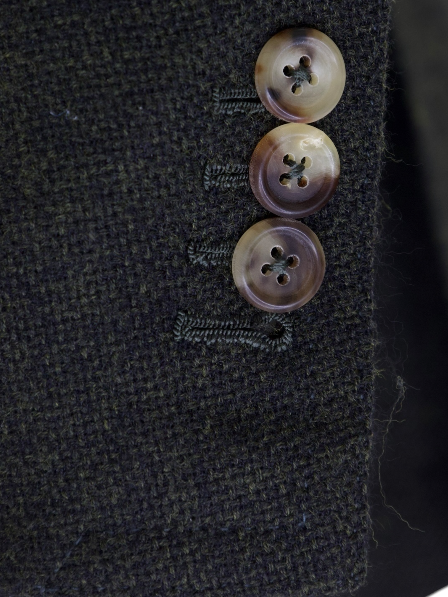 Also known as stacked buttons or waterfall buttons, kissing buttons are associated with Italian tailoring as Italian tailors make their jacket sleeve buttons in the kissing style. In this style, buttons touch each other and overlap one another. Handmade buttonholes; Even this step, apparently the simplest, is treated with an abundance of detail. Attaching the buttons is a job that requires patience and must be completed to perfection.