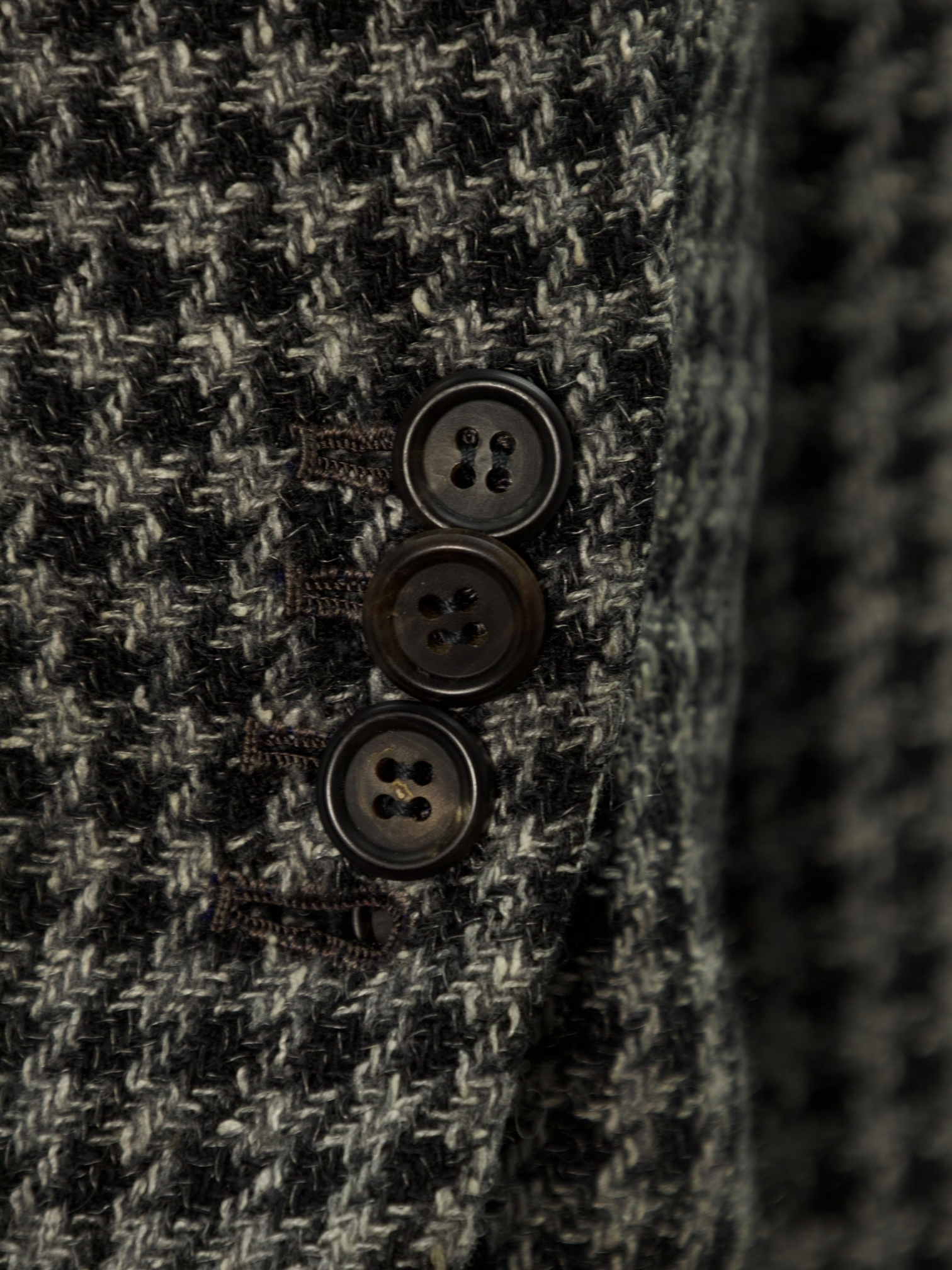 Also known as stacked buttons or waterfall buttons, kissing buttons are associated with Italian tailoring as Italian tailors make their jacket sleeve buttons in the kissing style. In this style, buttons touch each other and overlap one another. Handmade buttonholes; Even this step, apparently the simplest, is treated with an abundance of detail. Attaching the buttons is a job that requires patience and must be completed to perfection.