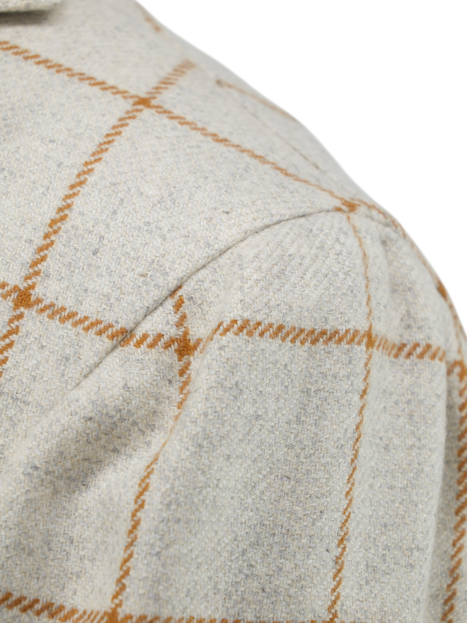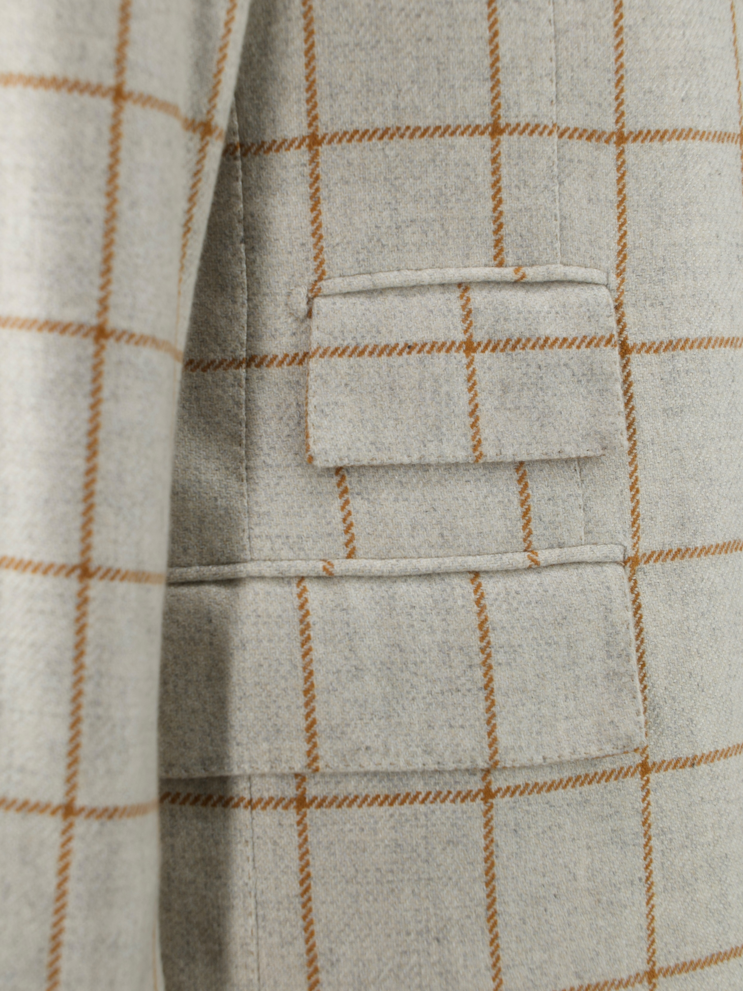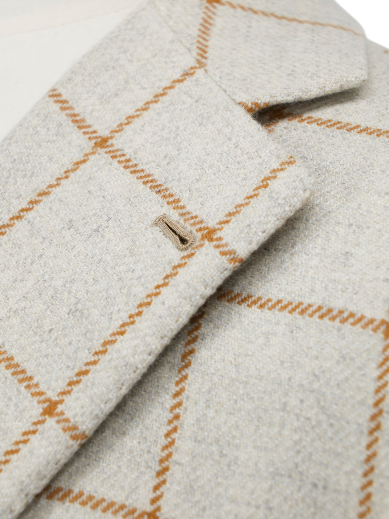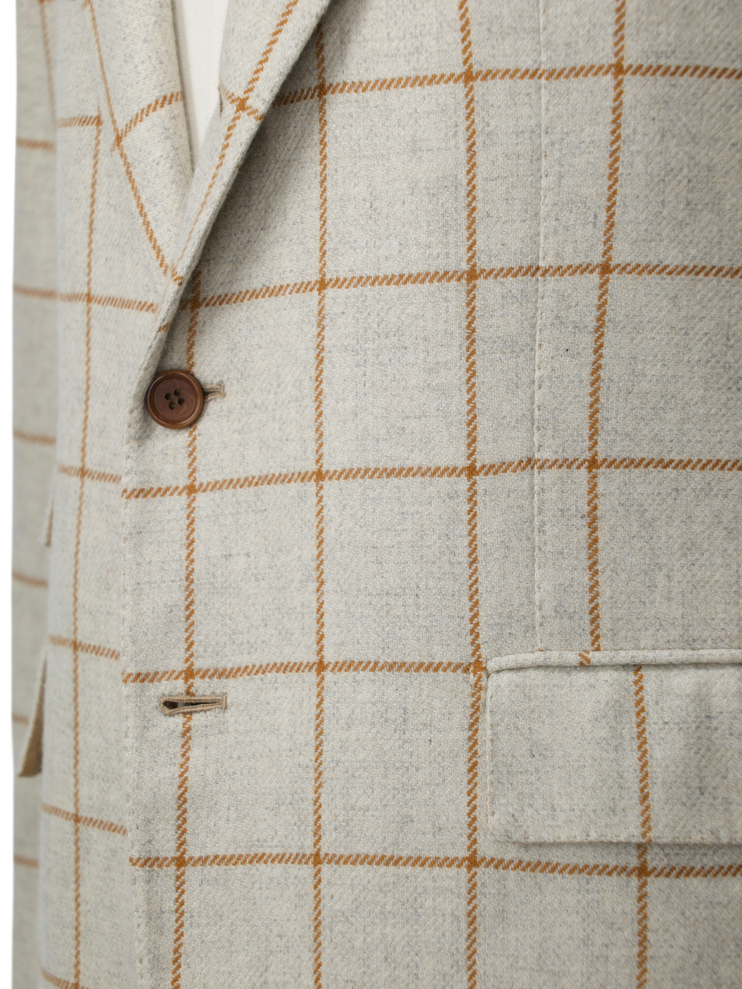 Discover the Orazio Luciano Oatmeal and Brown Pure Cashmere Windowpane Jacket, a quietly luxurious layer that captures the essence of soft Neapolitan tailoring. The plush cashmere cloth has a rich, tactile feel, with an oatmeal base subtly framed by a caramel brown windowpane check. Cut with notch lapels, a 2.5-button closure, and flap pockets with a ticket pocket, the silhouette is easy and refined. The half-lined interior keeps it lightweight and comfortable, making it ideal for dressed-down tailoring or elevated off-duty looks.