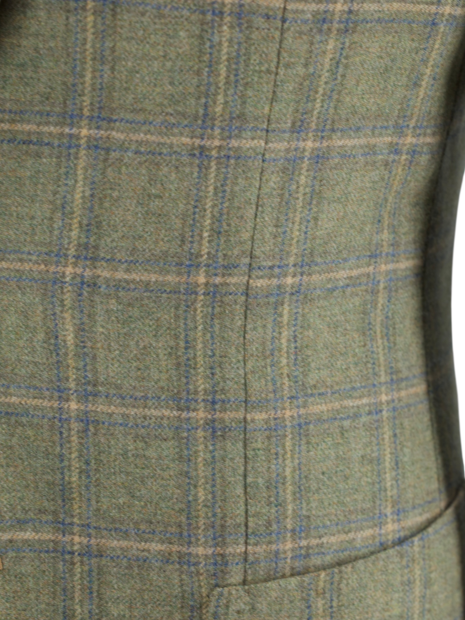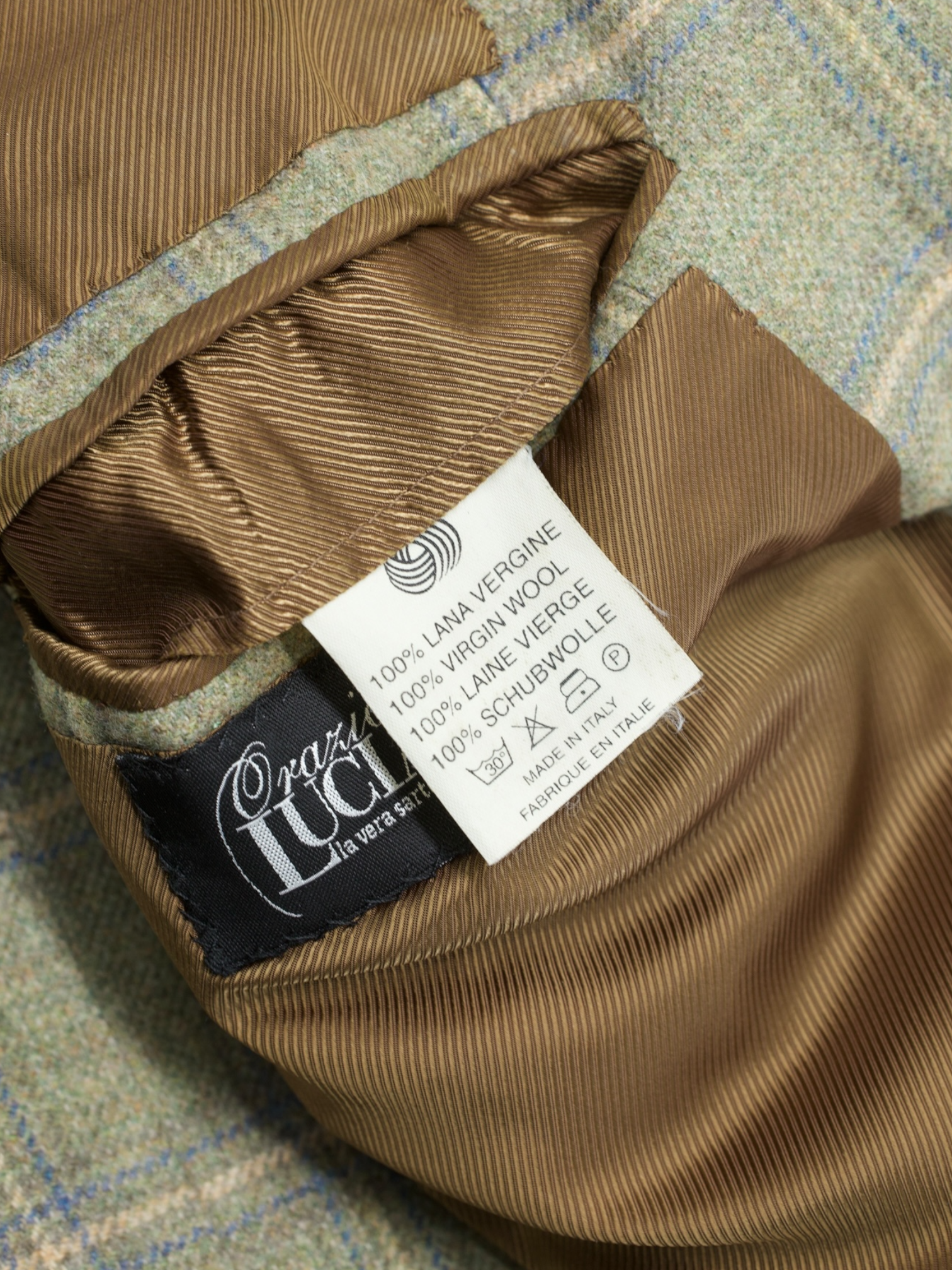 Discover the Orazio Luciano Sage Green and Light Blue Brushed Wool Windowpane Jacket, a beautifully balanced piece that captures the relaxed elegance of Neapolitan tailoring. The sage green base is enriched by a light blue windowpane, creating a colour combination that feels fresh yet understated. The brushed wool fabric has a soft, gently fluffy handle that adds warmth and depth to the pattern, making the jacket particularly appealing for cooler seasons. Notch lapels frame the silhouette with classic restraint, while the fully lined interior ensures a composed, elegant drape.