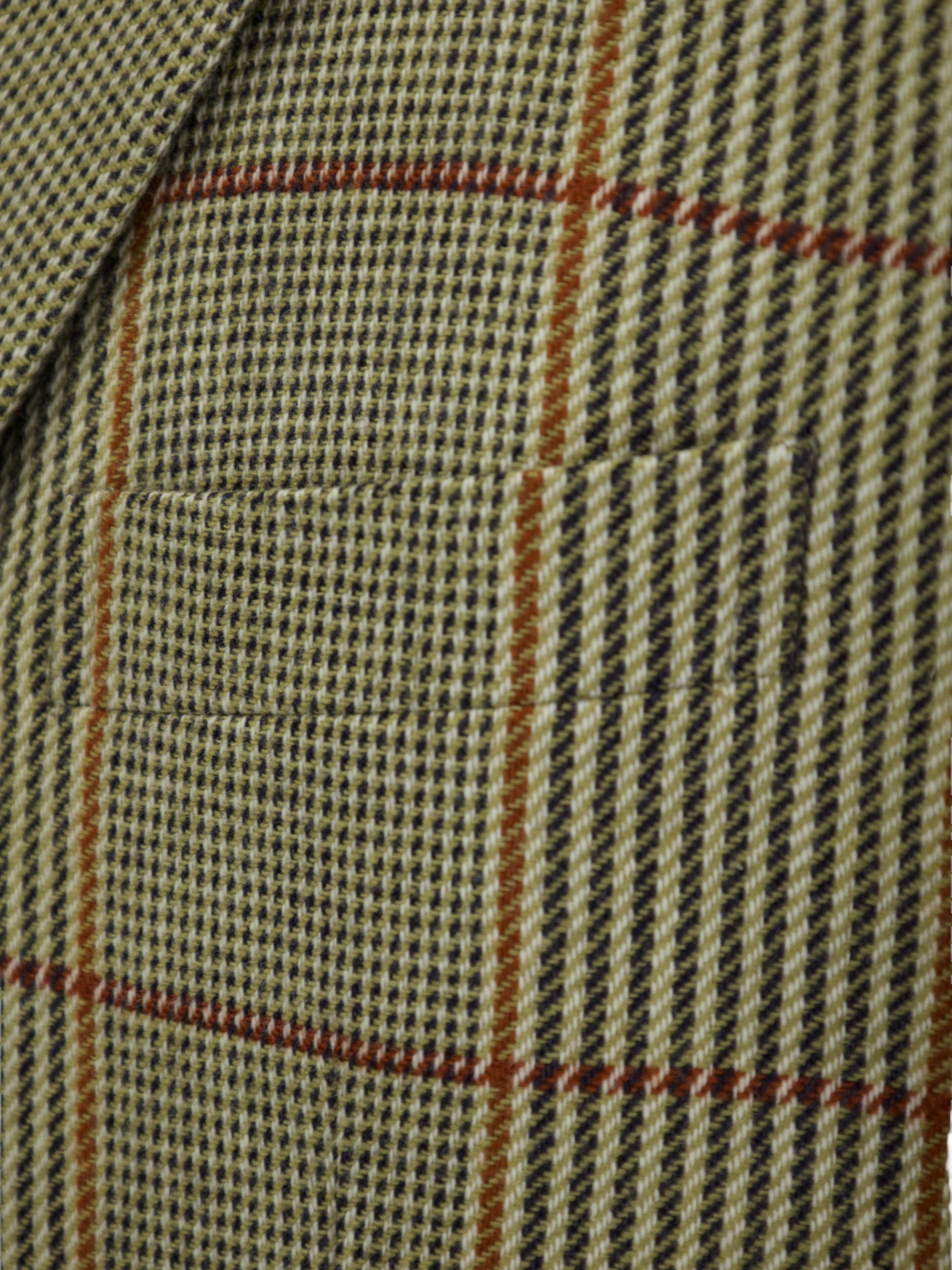 The chest bellows patch pocket, unlike the curved *barchetta*, adds practical utility with expandable pleats for extra storage. Originating in military and hunting attire, it emphasizes functionality and rugged charm over refined aesthetics.