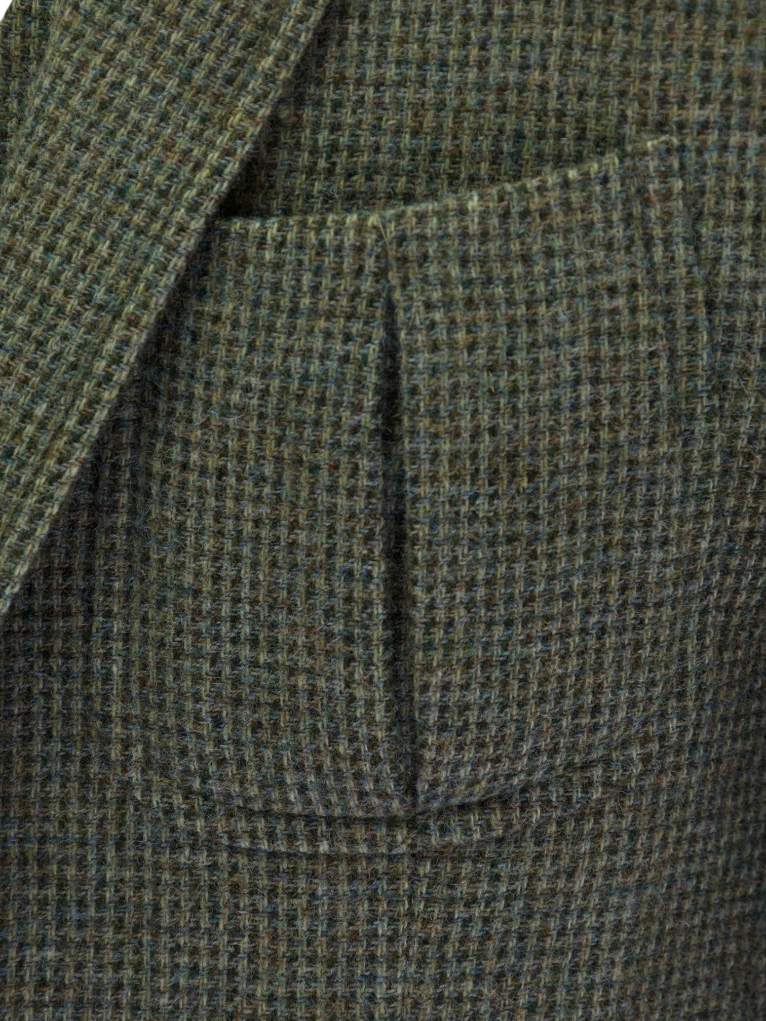 The chest bellows patch pocket, unlike the curved *barchetta*, adds practical utility with expandable pleats for extra storage. Originating in military and hunting attire, it emphasizes functionality and rugged charm over refined aesthetics.