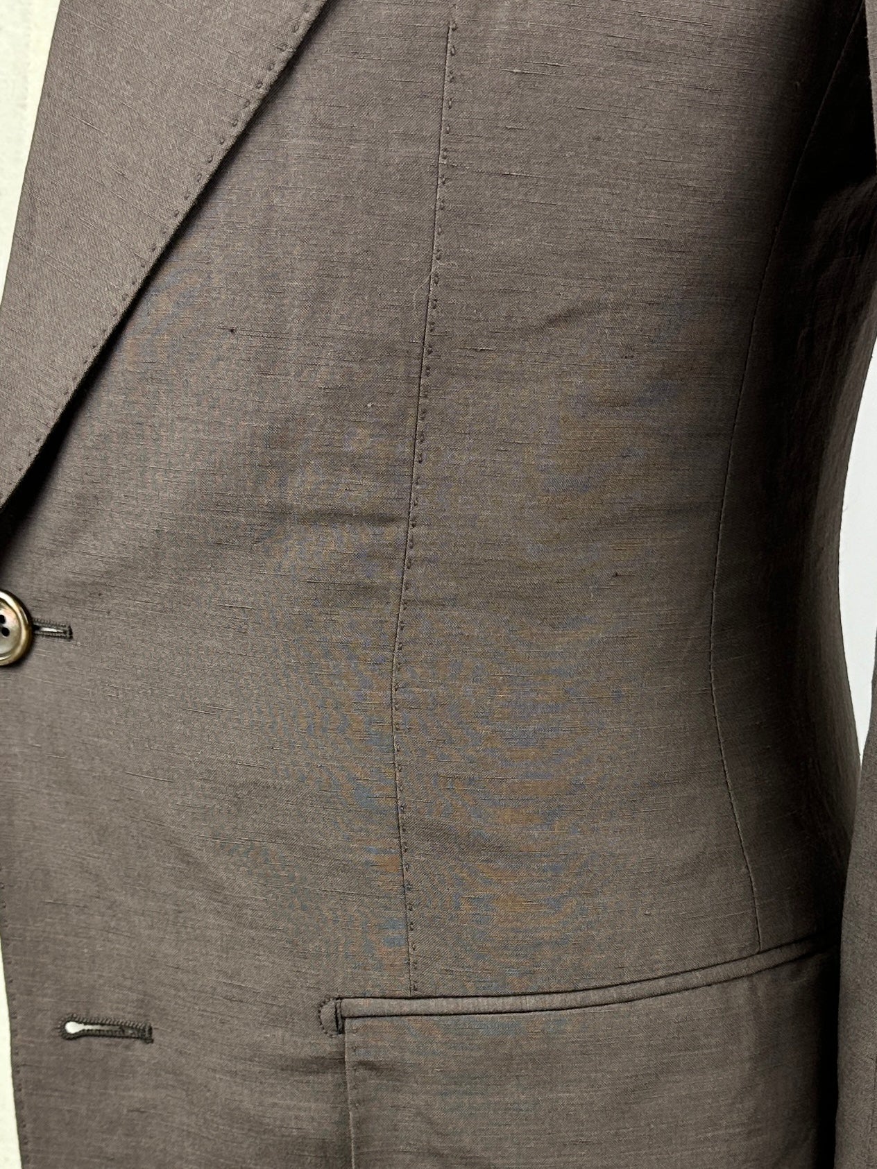 The tailors adds two darts - think of them as pinched seams - to ensure the jacket’s body achieves a slim silhouette. The process, called mezzo punto riprese, is done entirely by hand.