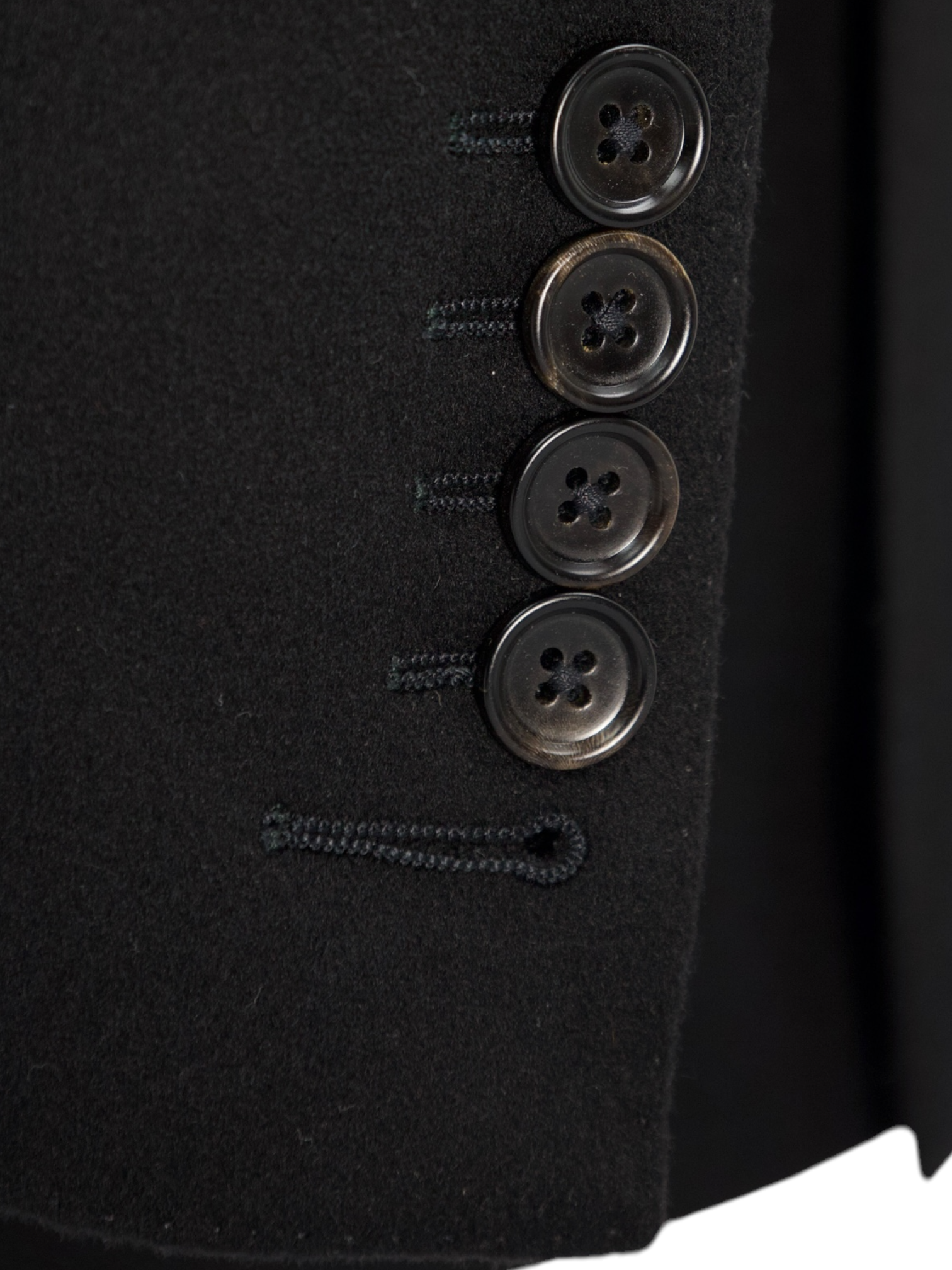5 functioning horn buttons at the end of the sleeve, with a larger 5th button opening - a quintessential Tom Ford Detail. Even this step, apparently the simplest, is treated with an abundance of detail. Attaching the buttons is a job that requires patience and must be completed to perfection.