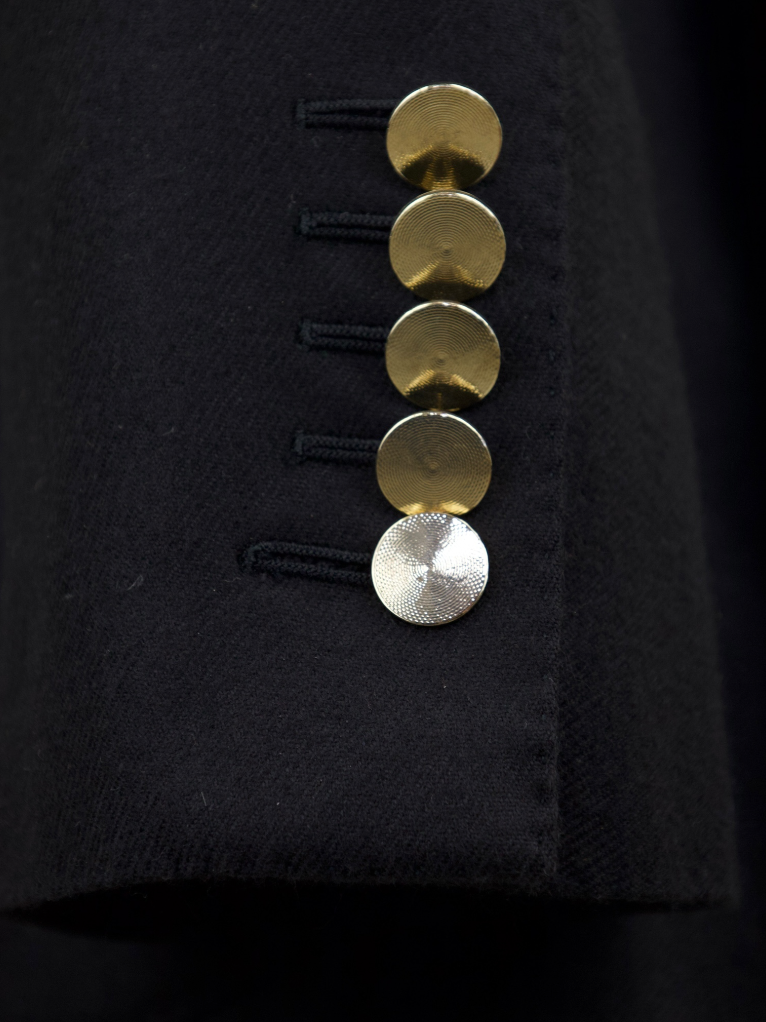 5 functioning horn buttons at the end of the sleeve, with a larger 5th button opening - a quintessential Tom Ford Detail. Even this step, apparently the simplest, is treated with an abundance of detail. Attaching the buttons is a job that requires patience and must be completed to perfection.