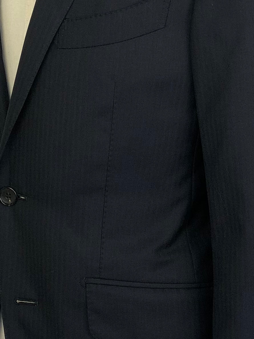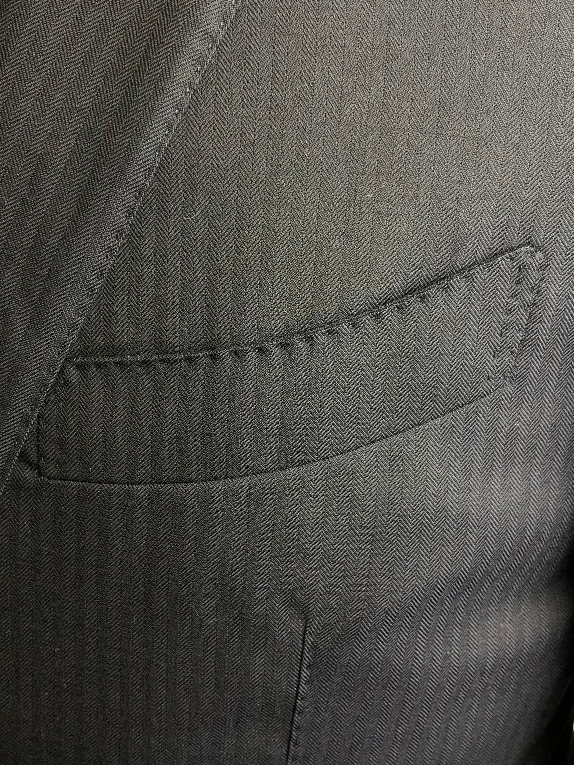 The barchetta chest pocket is not only curved and blunted, as in the southern Italian style, but the corner is rounder right off.