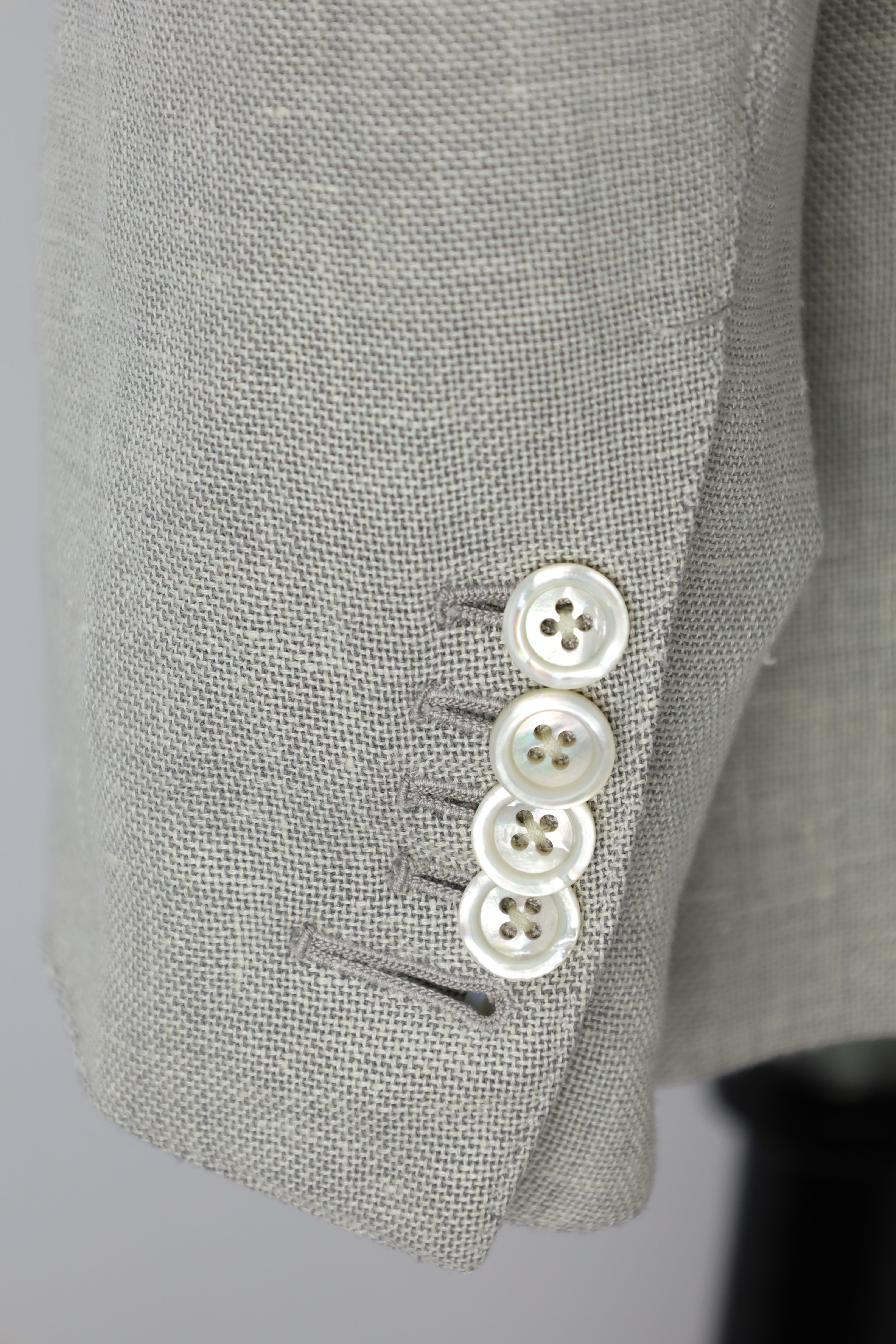 5 functioning horn buttons at the end of the sleeve, with a larger 5th button opening - a quintessential Tom Ford Detail. Even this step, apparently the simplest, is treated with an abundance of detail. Attaching the buttons is a job that requires patience and must be completed to perfection.